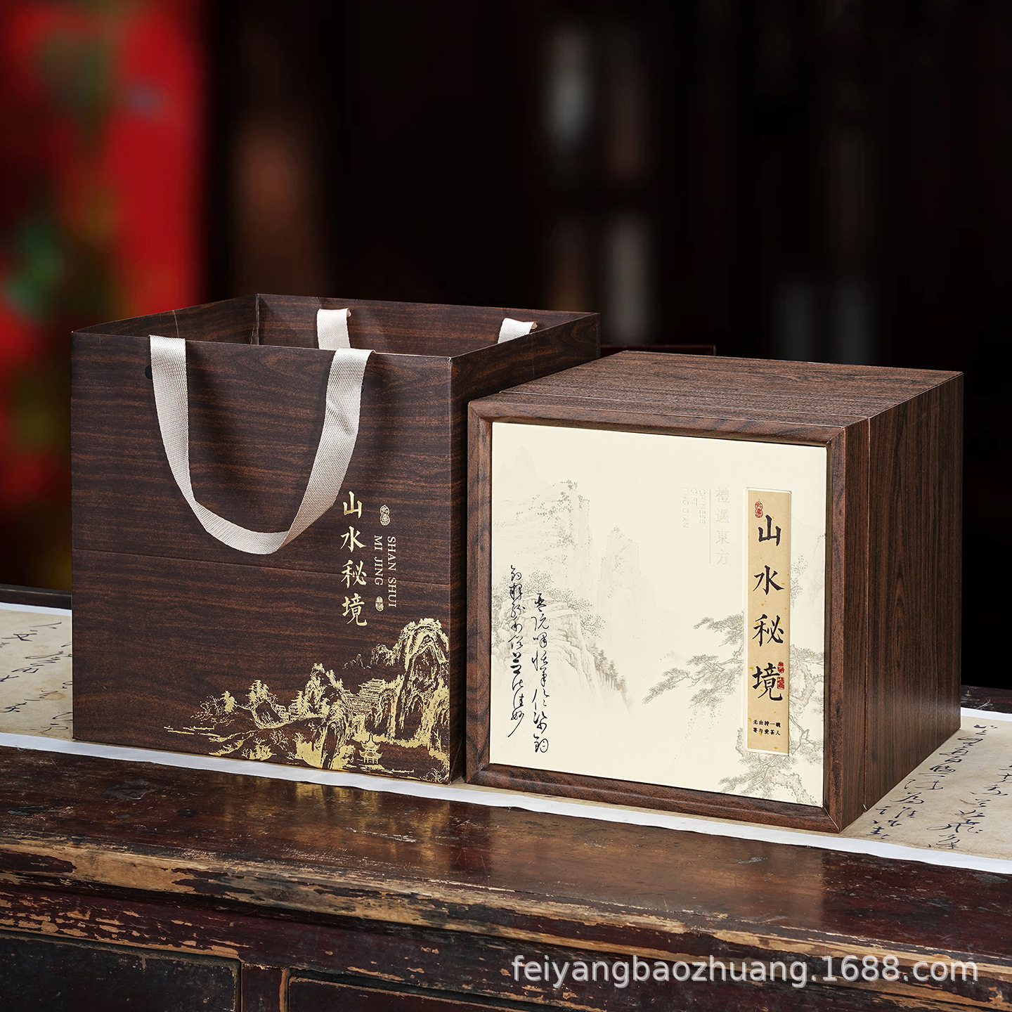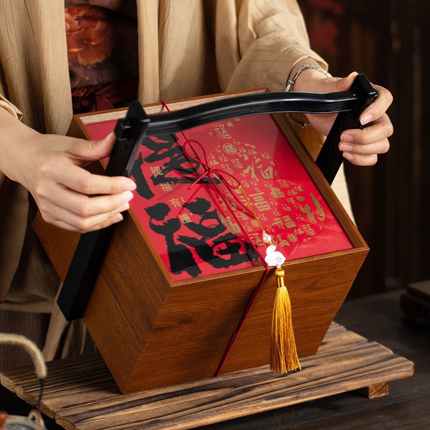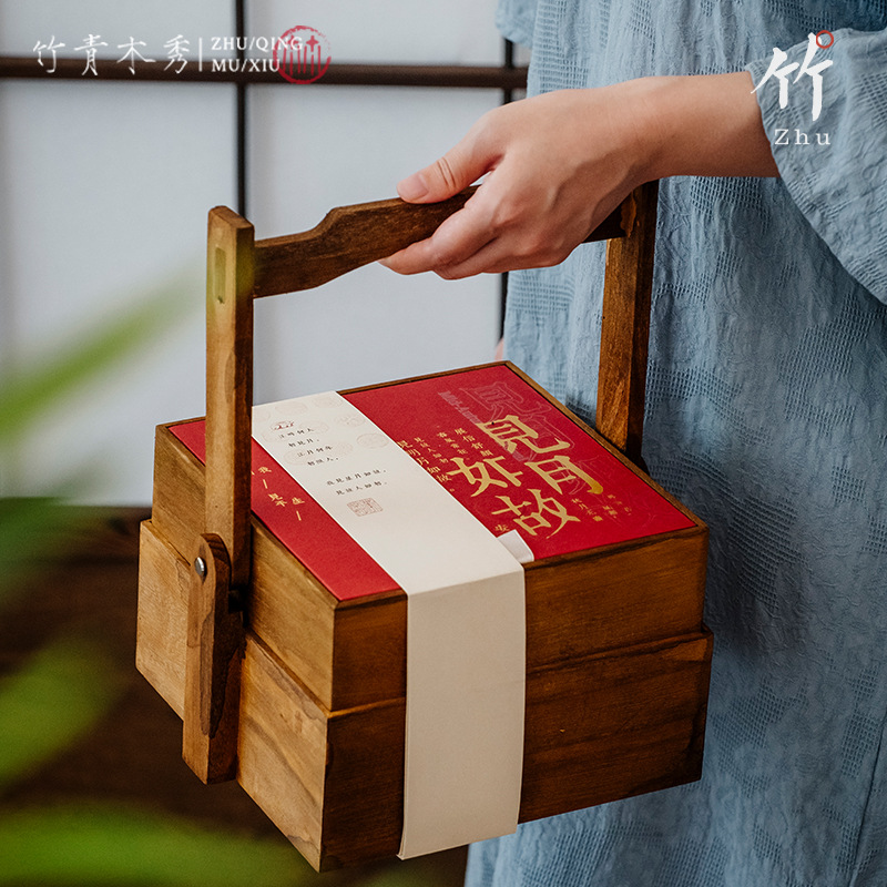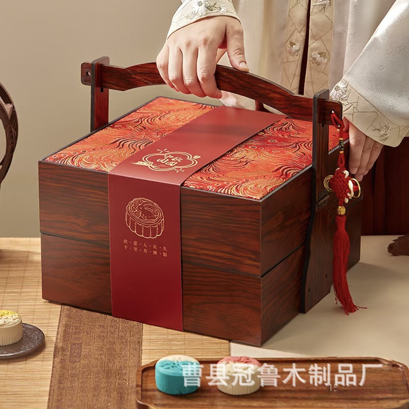 新中式红色喜庆礼品盒木质年货点心包装盒手提伴手礼双层月饼木盒