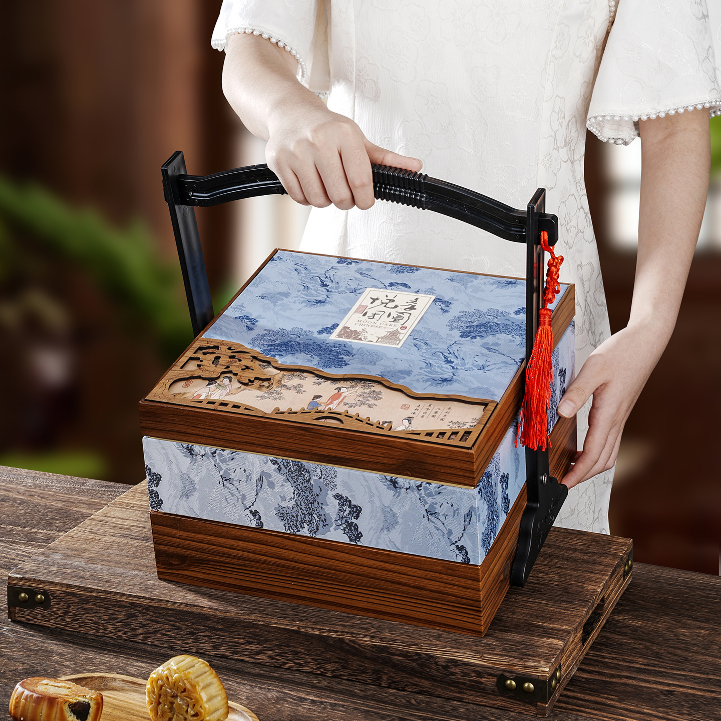 二層中秋月餅包装箱 木製8個入り無垢材バスケット 氷皮ギフト 国風ギフトボックス 高級2024