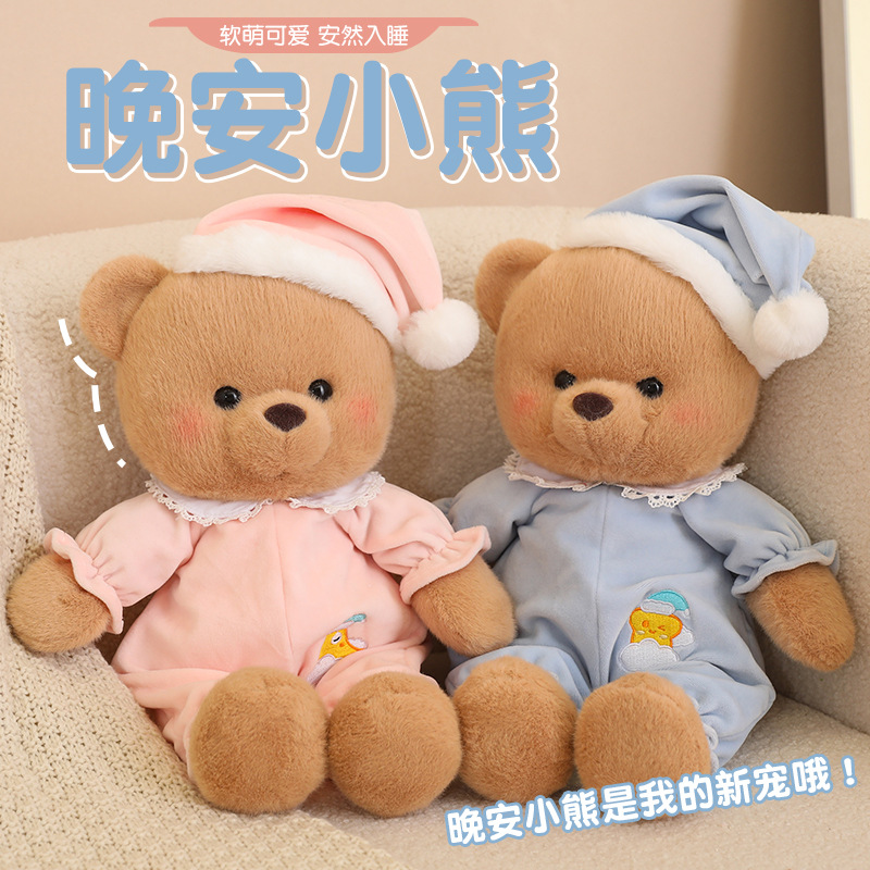 かわいいおやすみベアーのぬいぐるみの女の子のベッドで寝ている人形の暖かい心は彼女の誕生日プレゼントに付き添う