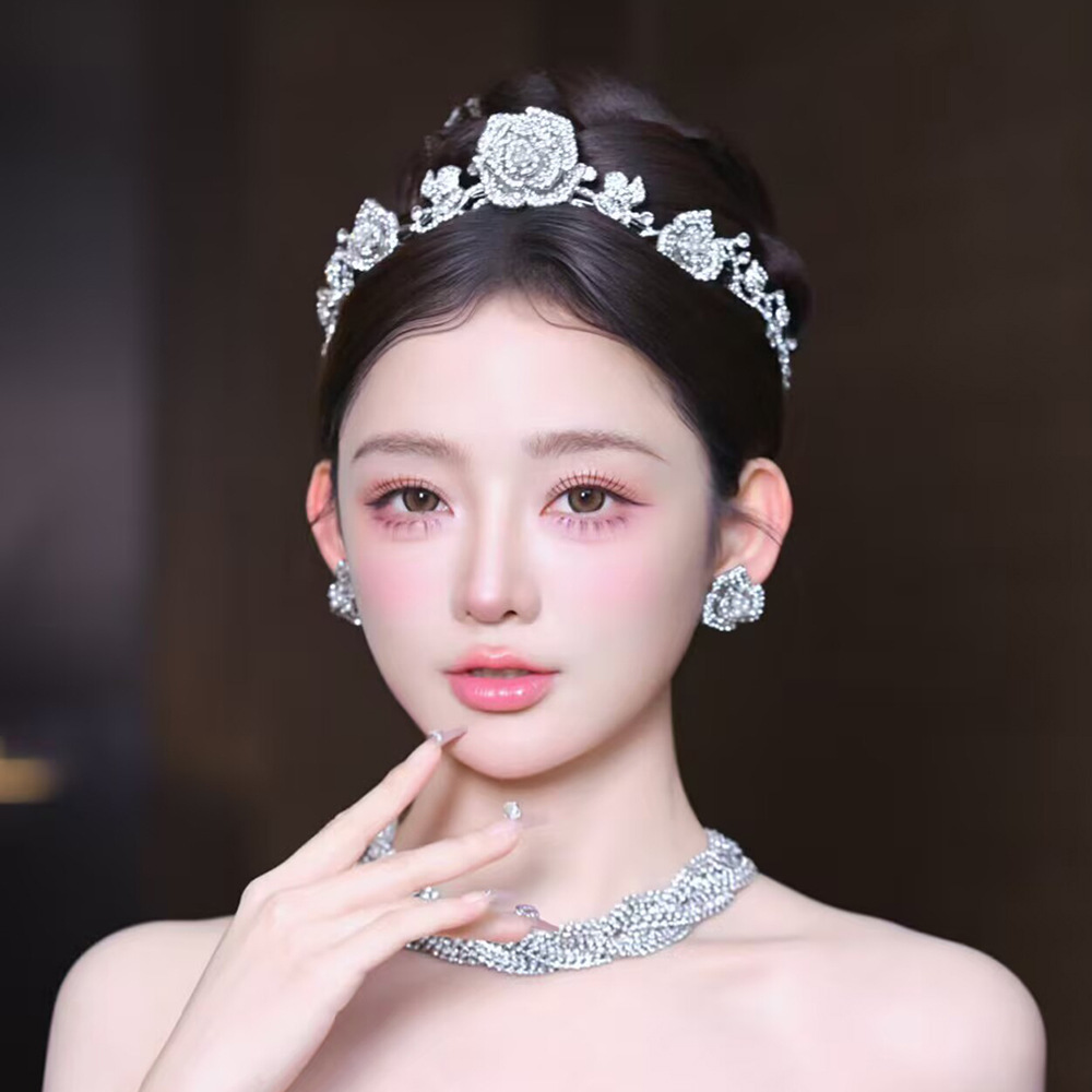 新款水钻玫瑰花朵皇冠套装新娘头饰婚礼王冠头饰婚纱礼服造型配饰
