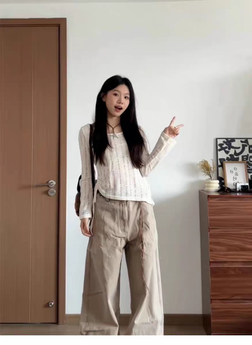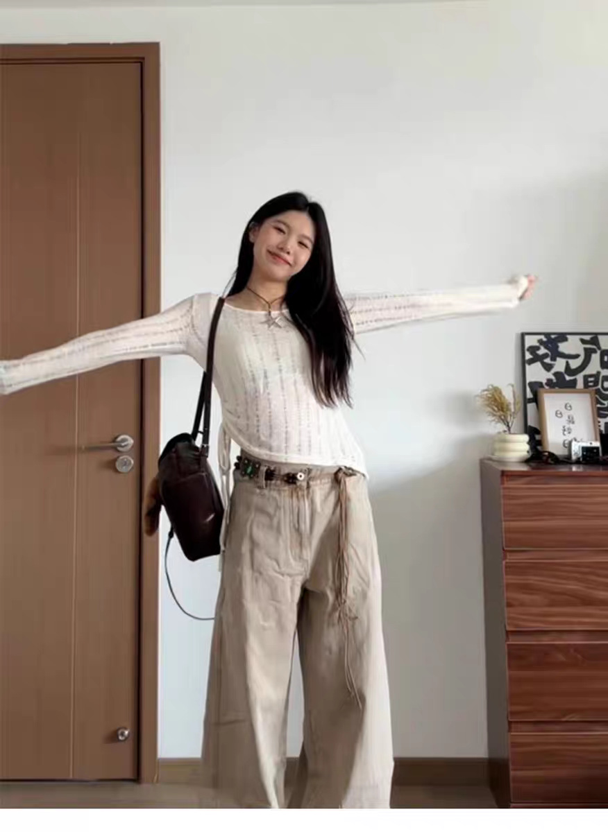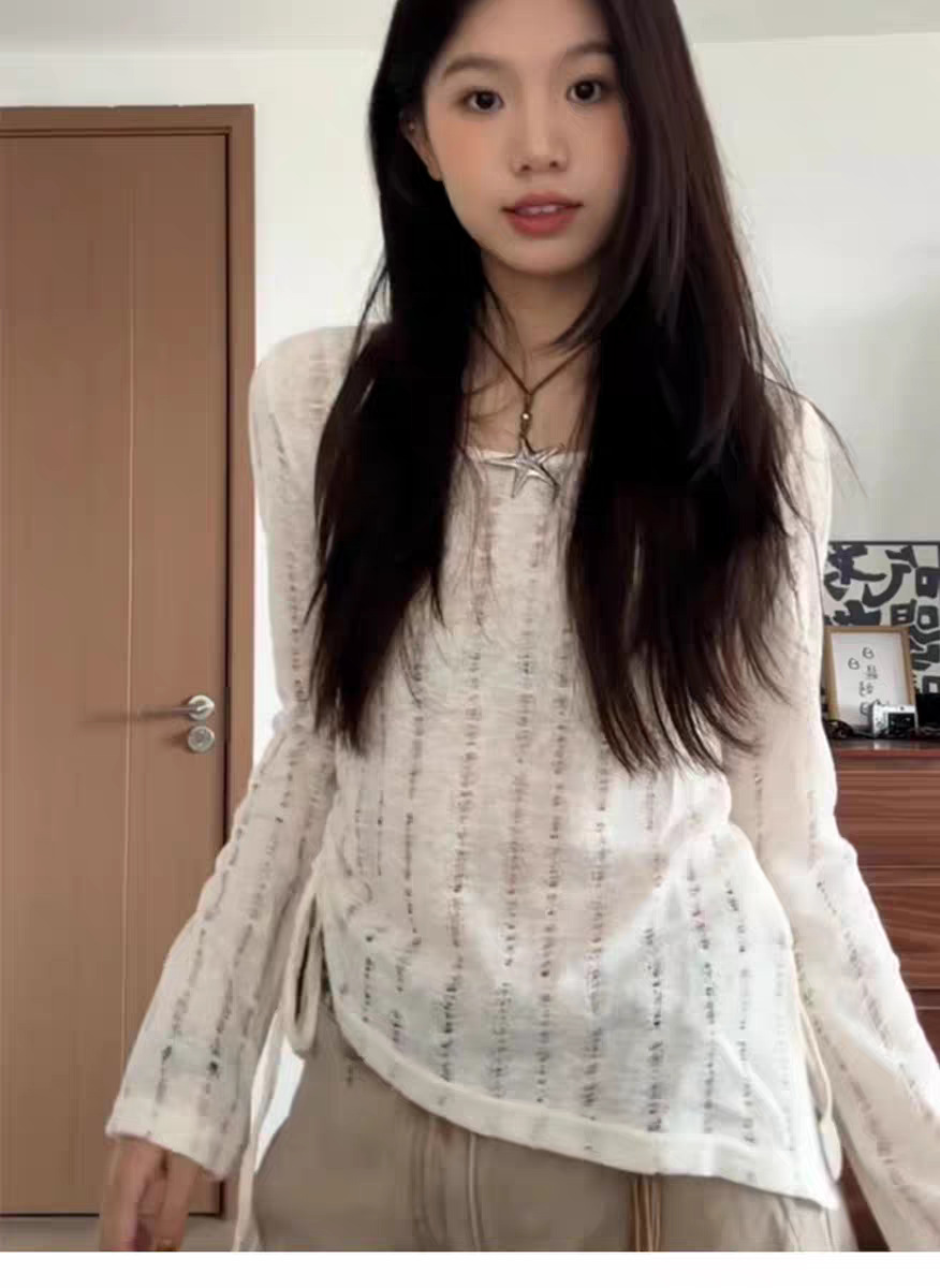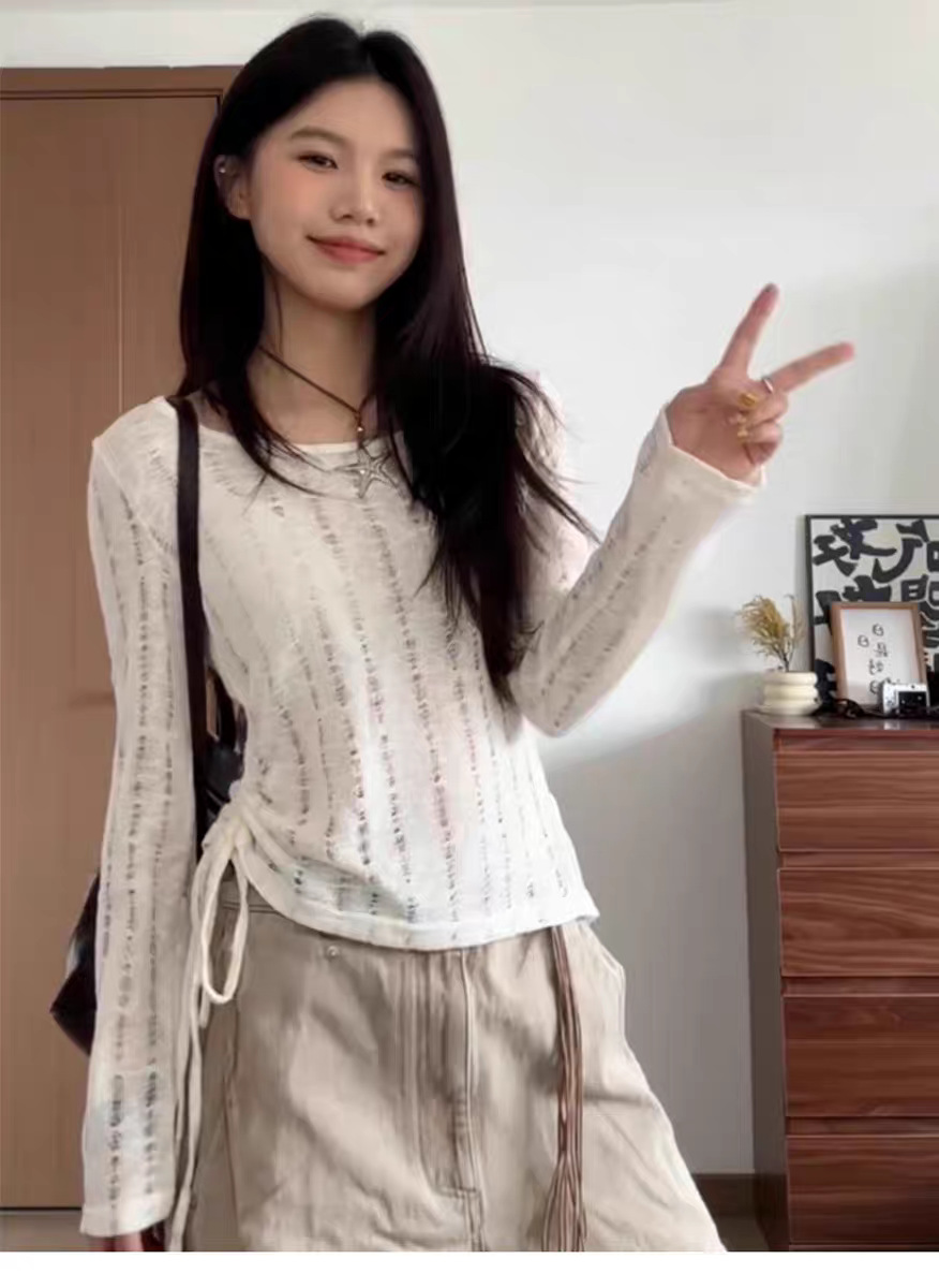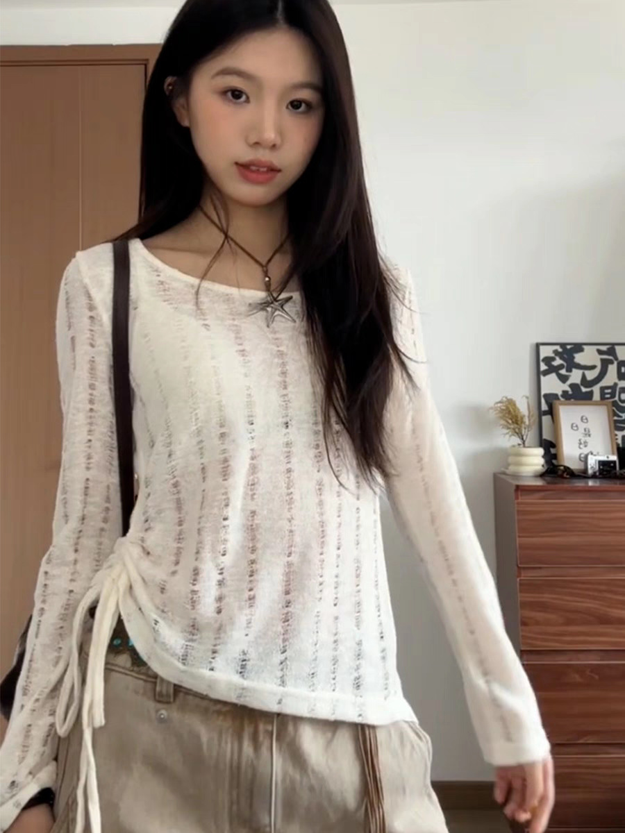 2025 夏巾着微透け中空デザインニット長袖日焼け止めブラウス女性のデイリーカジュアル多用途トップ