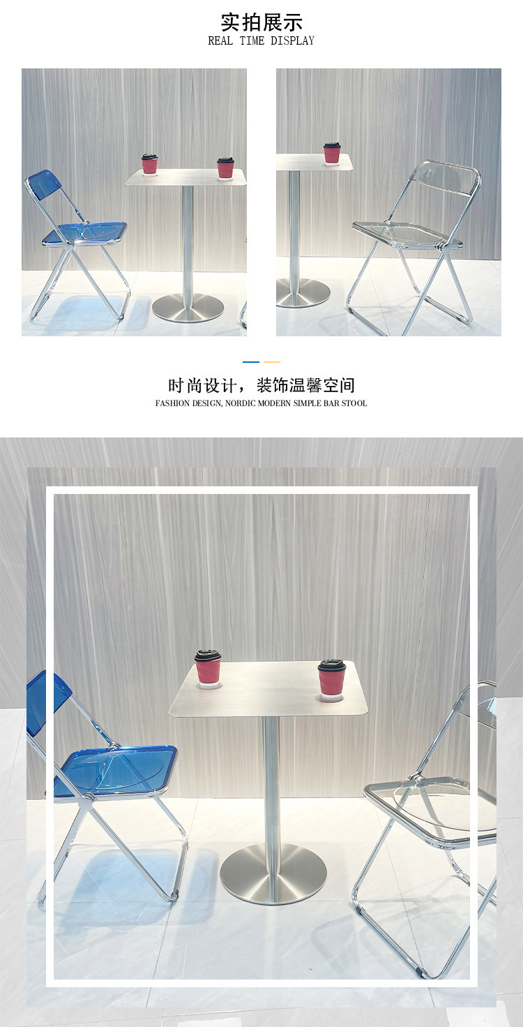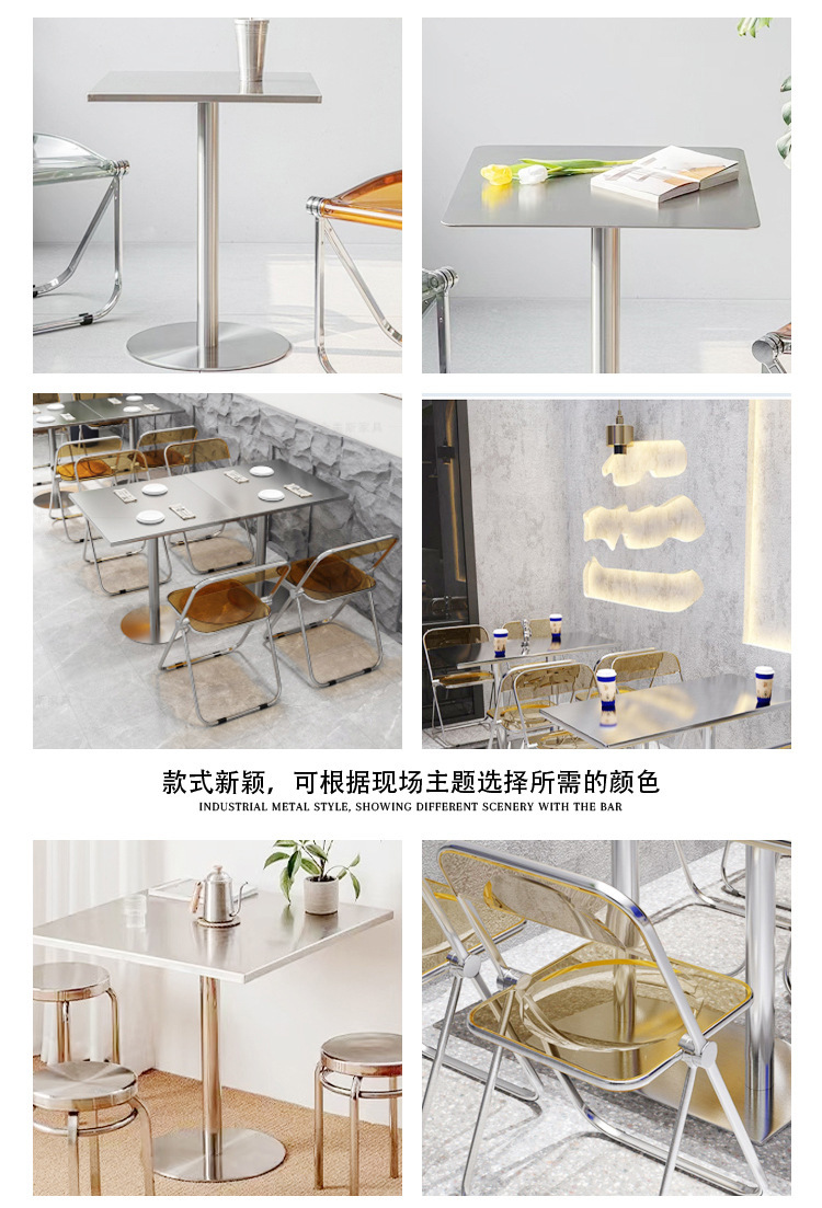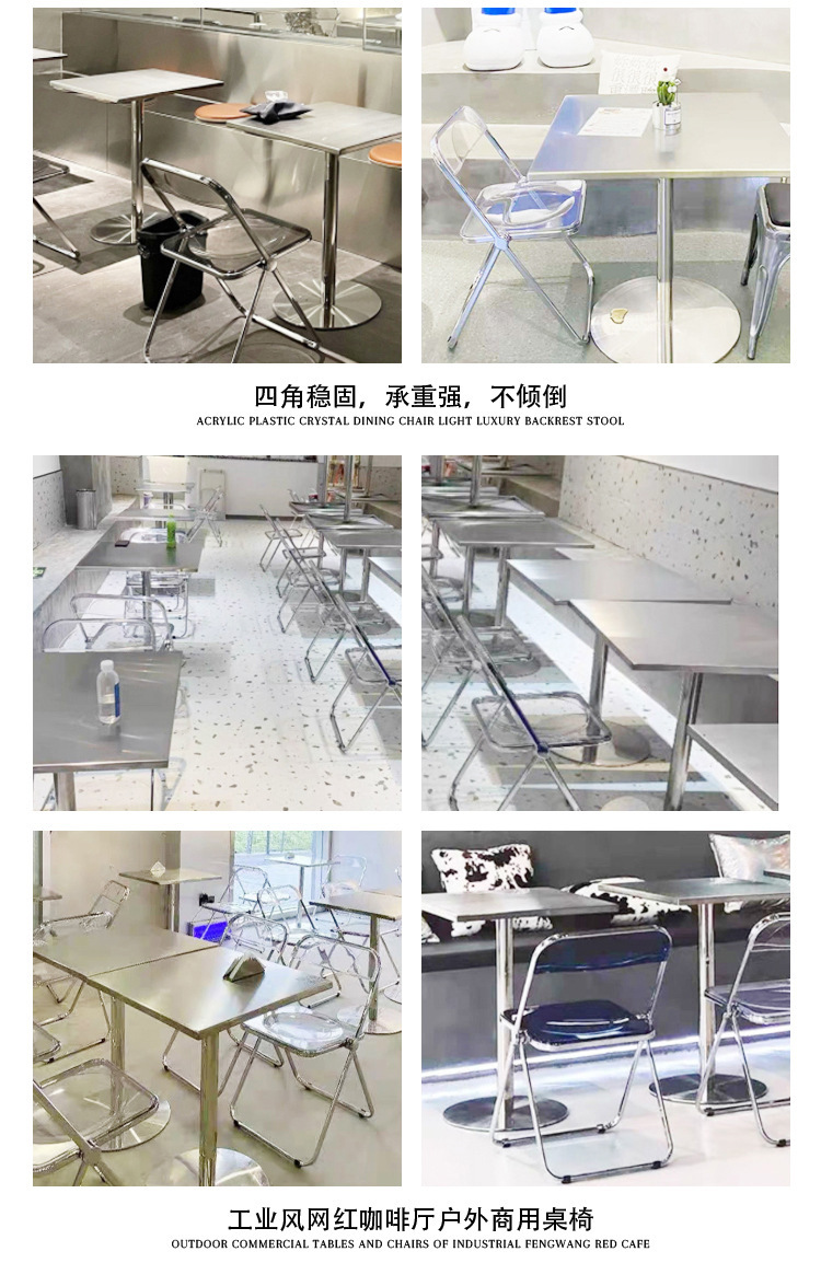 インダストリアルスタイルのコーヒーショップミルクティーショップステンレス鋼のテーブルと椅子の組み合わせインターネット有名人のデザートスナックバー透明折りたたみ椅子商業用