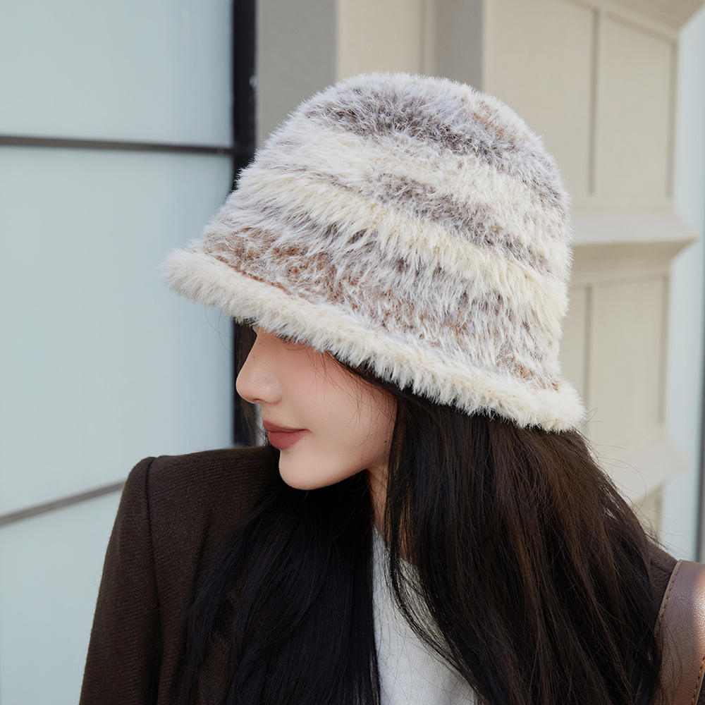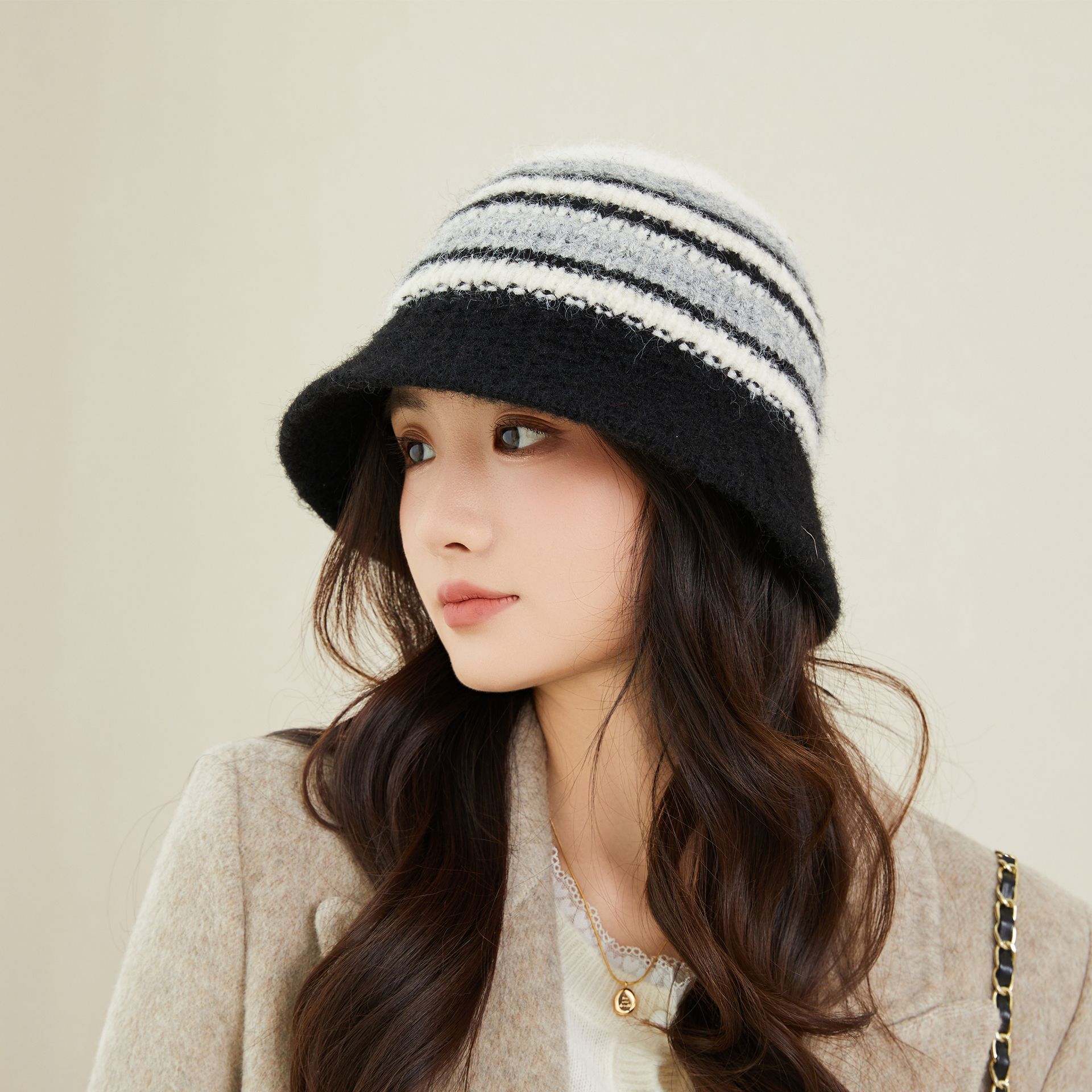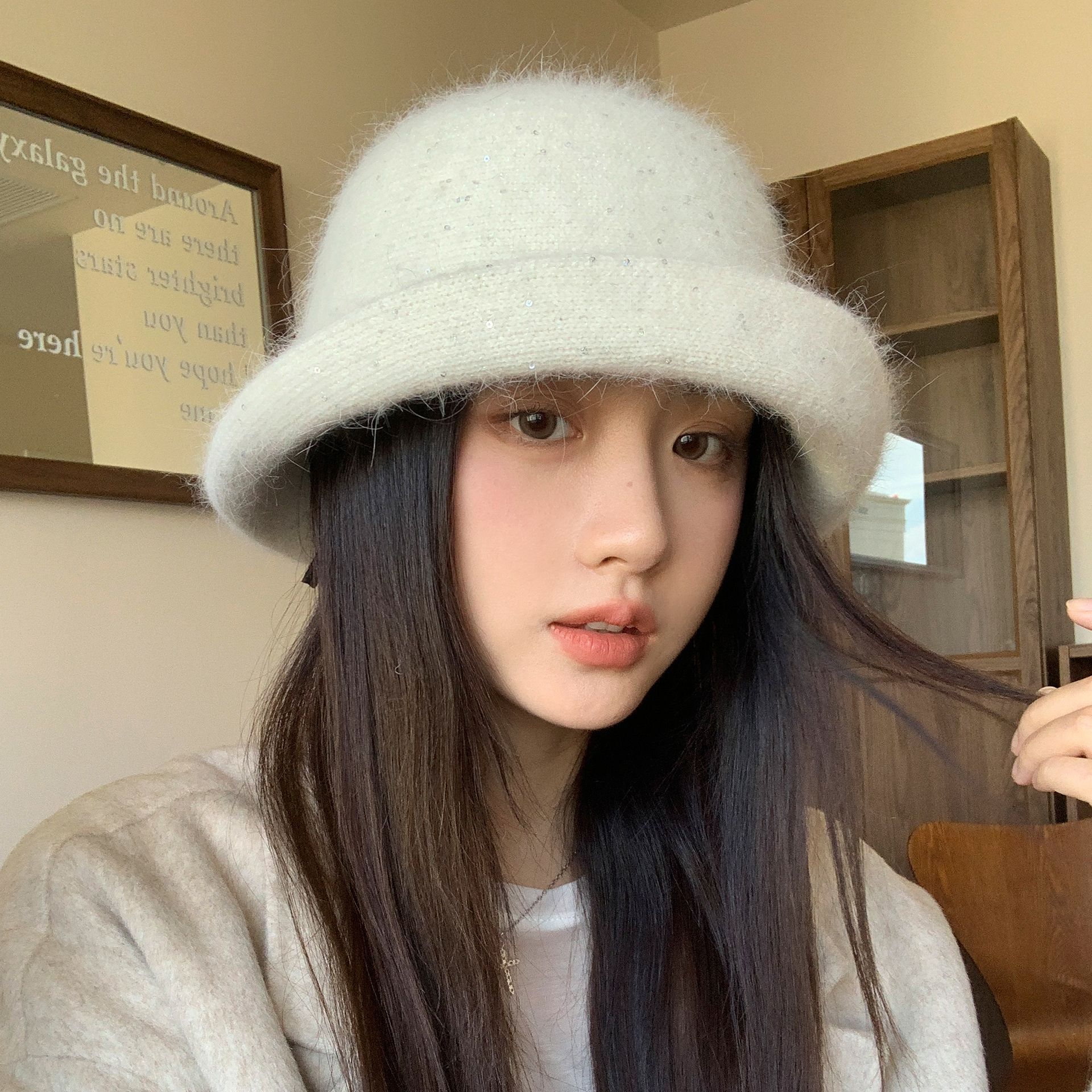 新款兔毛针织盆帽女秋冬季保暖卷边时尚礼帽户外防风亮片帽子批发