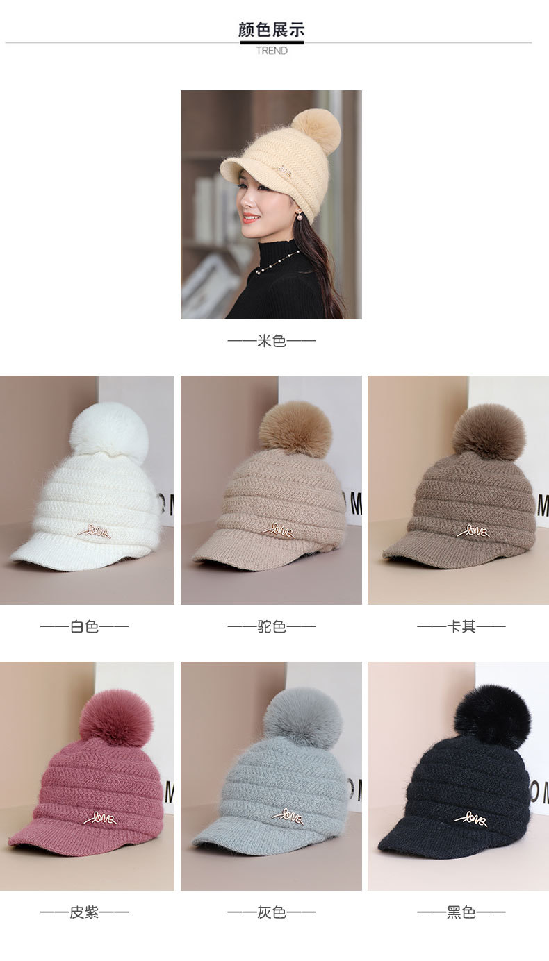 秋と冬の韓国スタイルの女性用ニットウサギの毛皮の耳保護帽子、ベルベットで暖かく保ち、大きな頭囲、短いつばの毛皮のボール野球帽卸売