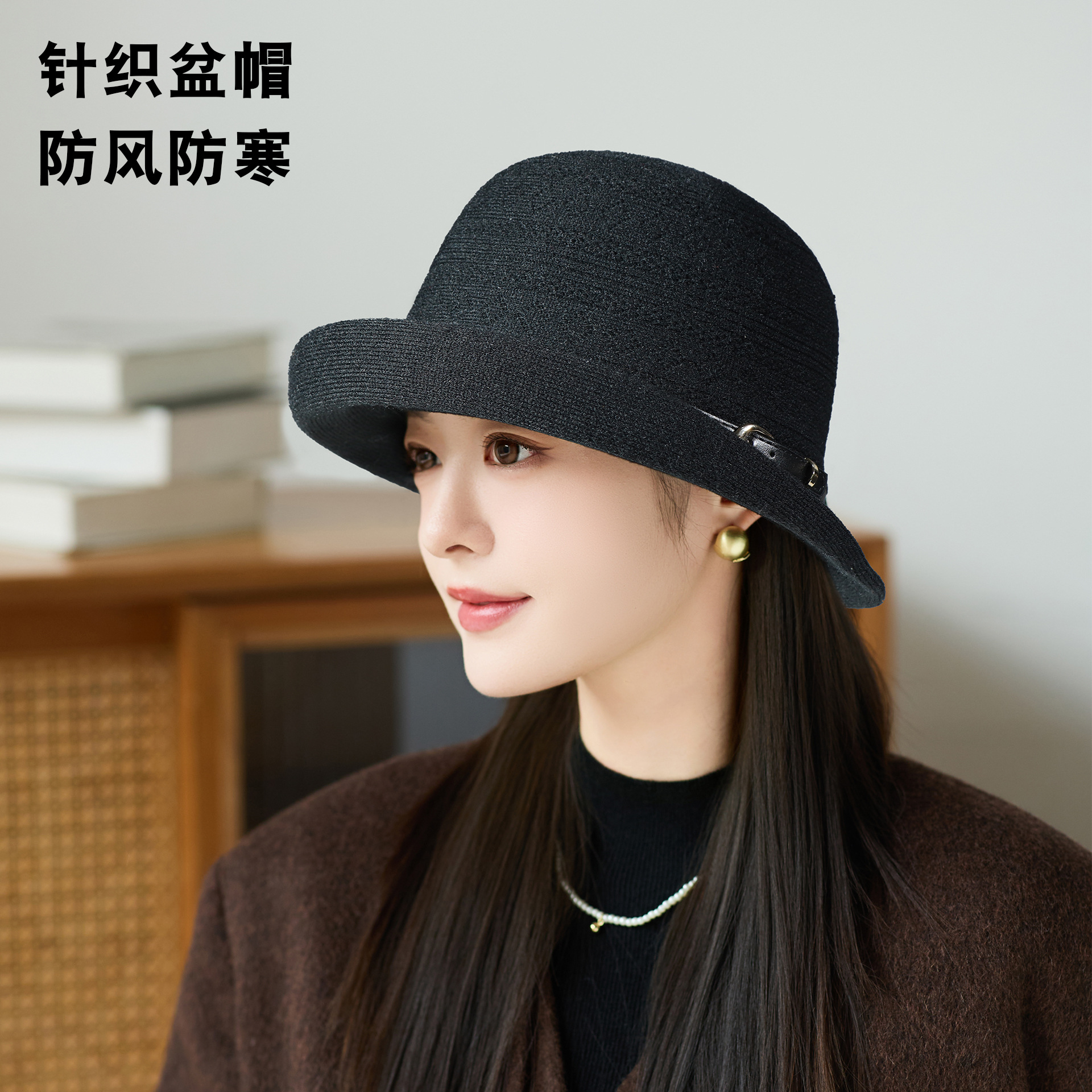 秋冬季新款针织小沿卷边气质时尚礼帽女户外旅游保暖皮带帽子批发