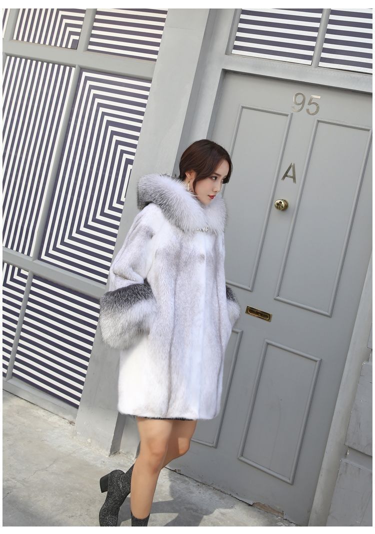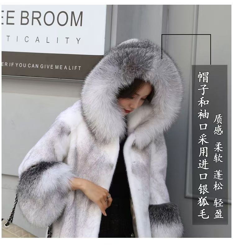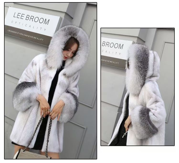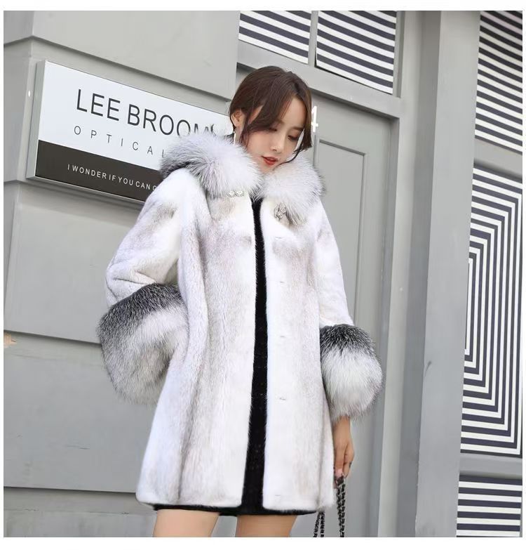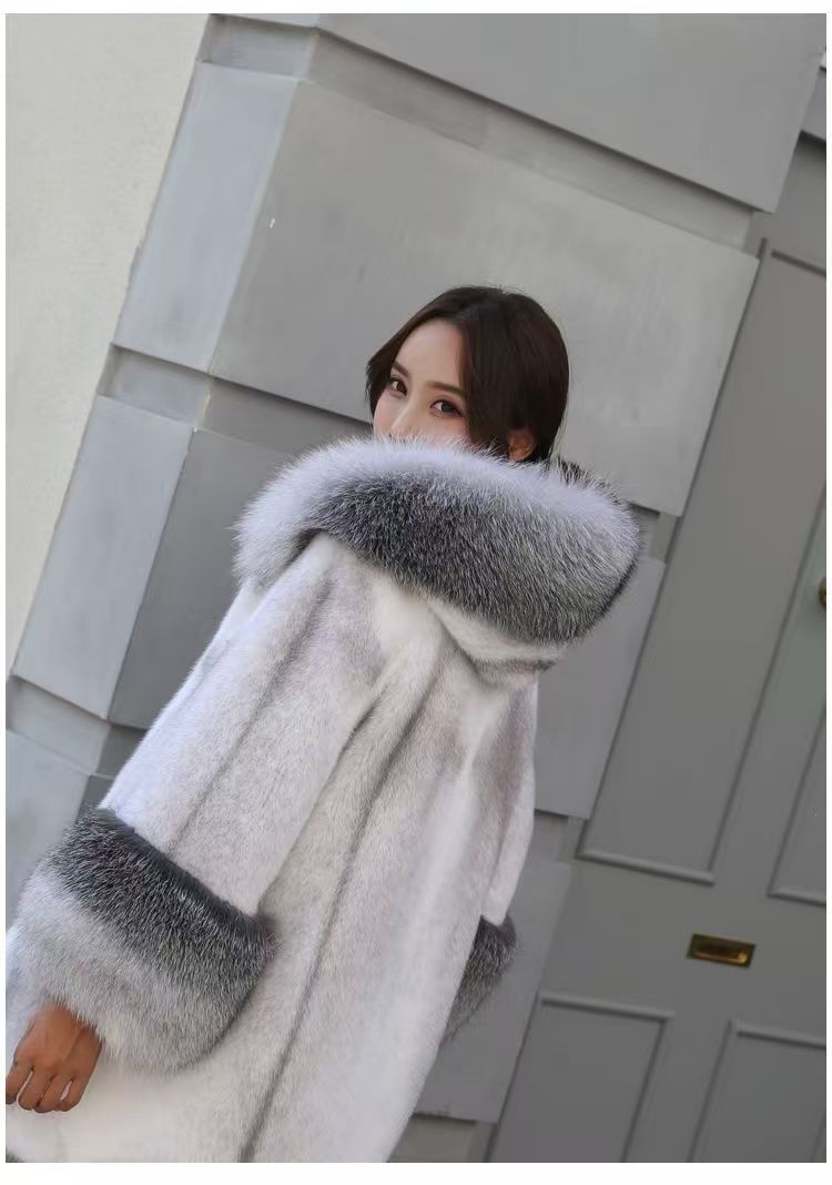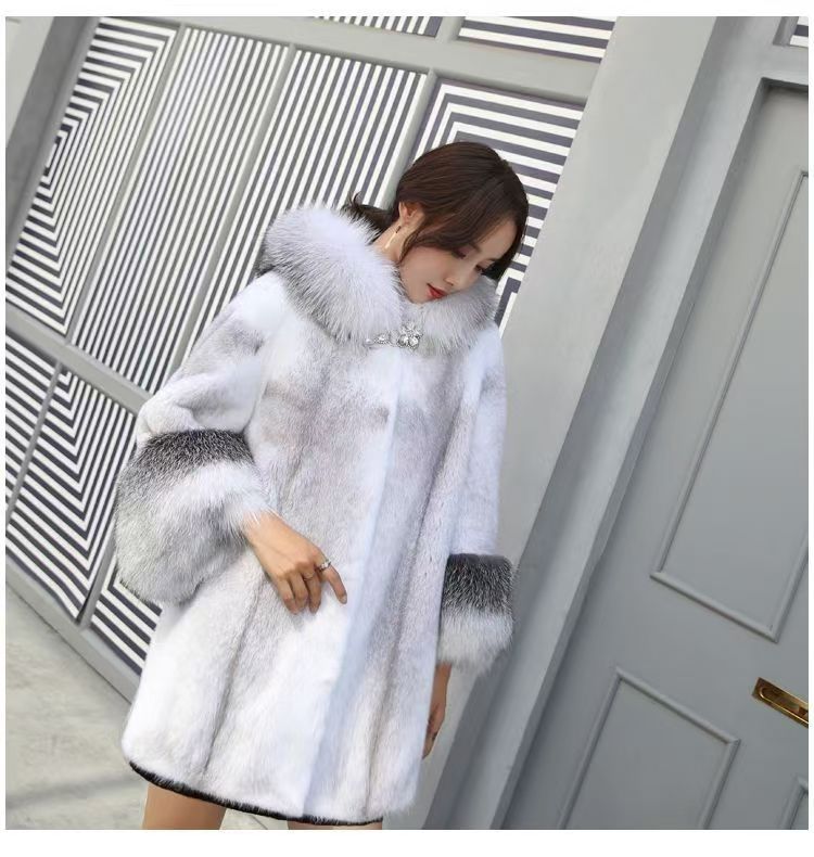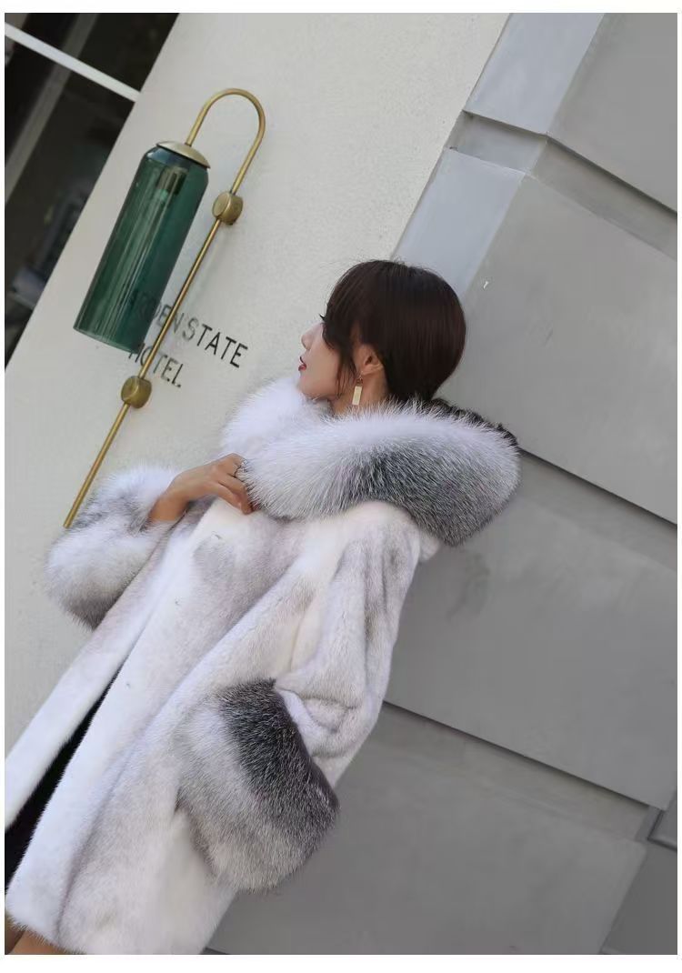 2025 輸入クロスミンク新しいミンクコート女性のフルミンクミッドレングスフォックスファー襟コートミンクフード付き