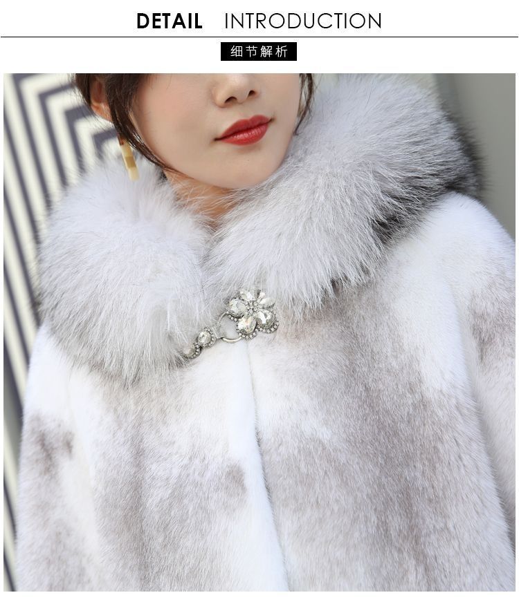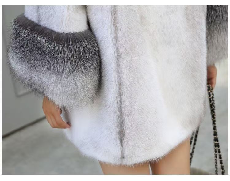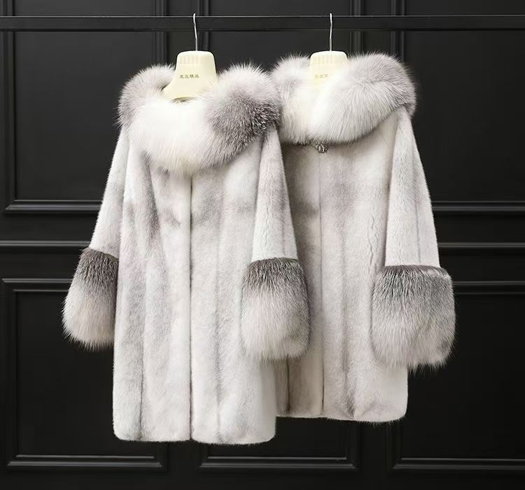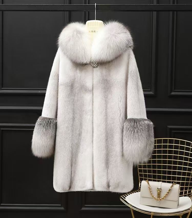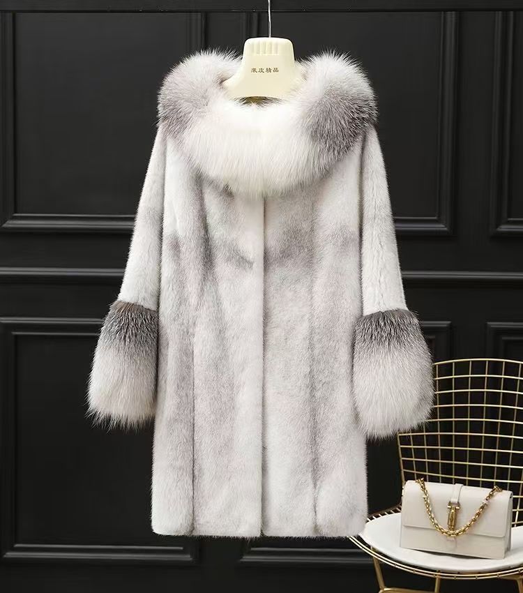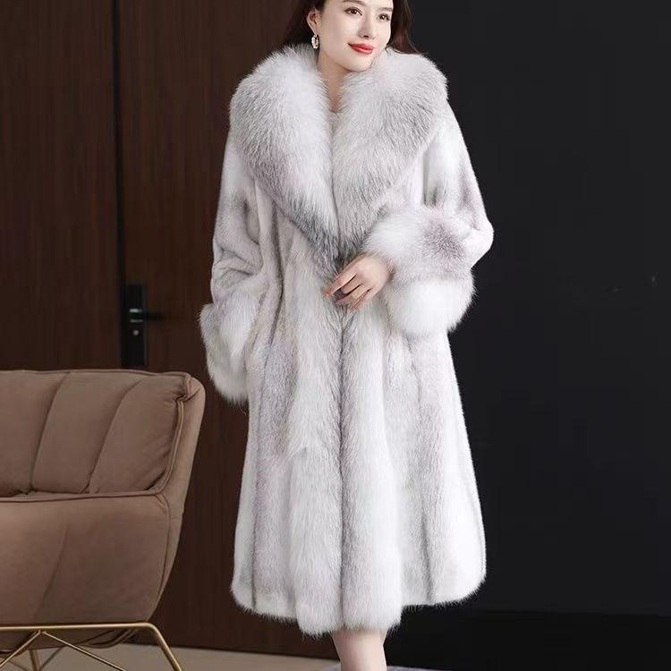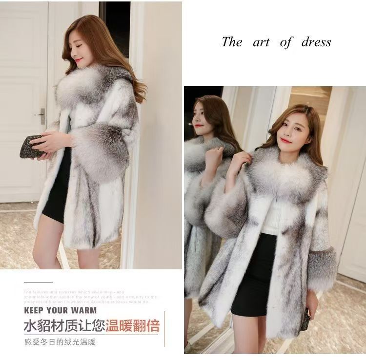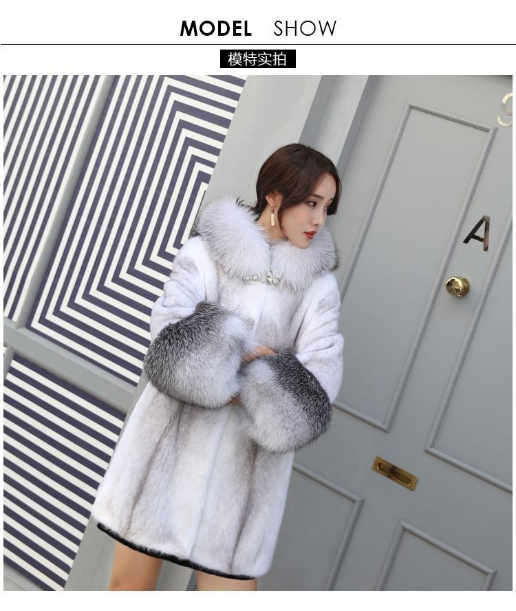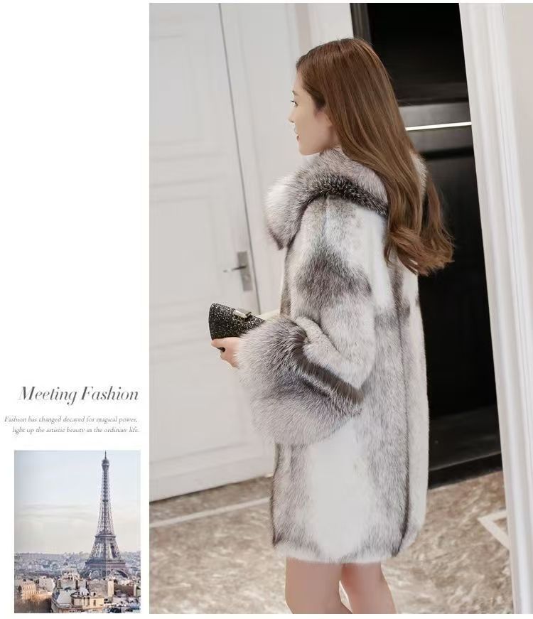2025 輸入クロスミンク新しいミンクコート女性のフルミンクミッドレングスフォックスファー襟コートミンクフード付き