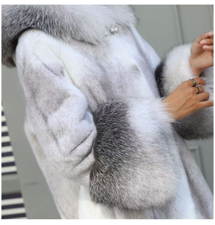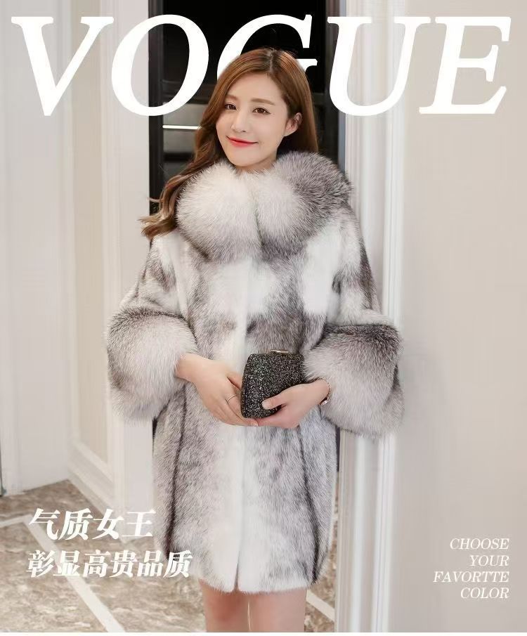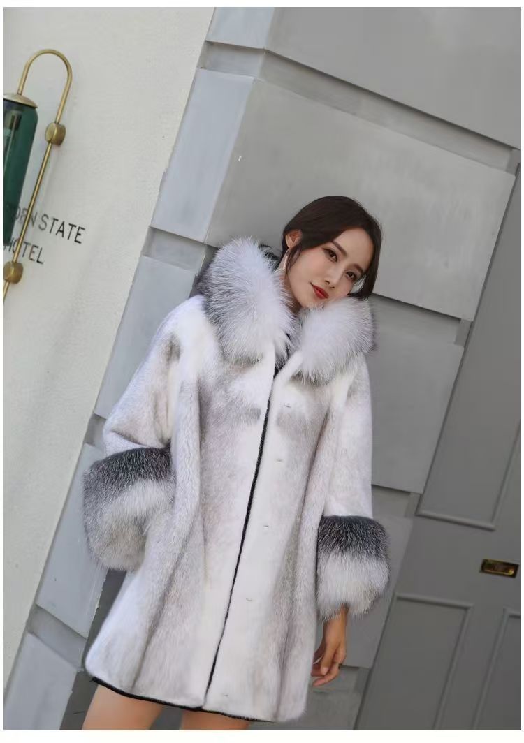 2025进口天鹅绒水貂皮草外套中长款狐狸毛领蝙蝠袖貂大衣女整貂