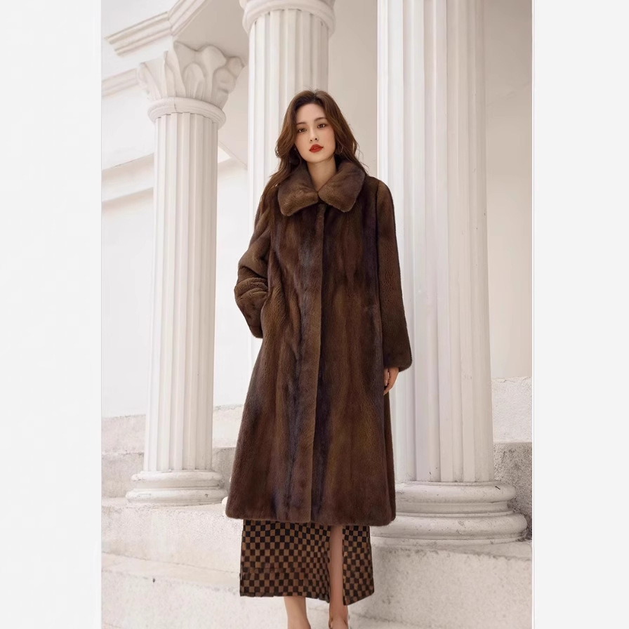 进口天鹅绒貂皮大衣女长款翻领整貂妈妈装水貂毛皮草外套大码真貂