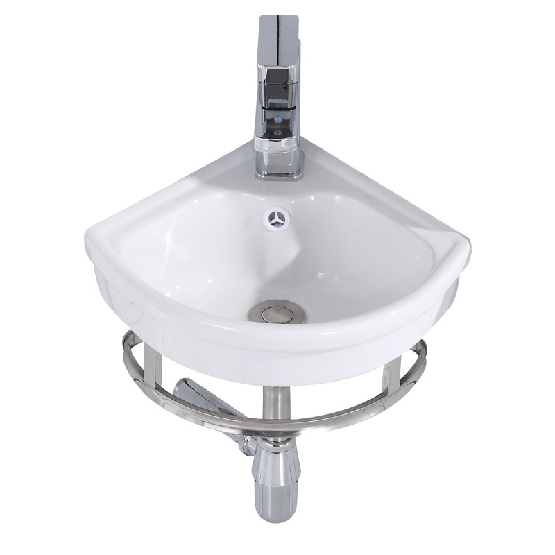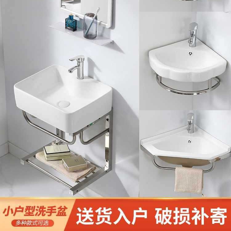 小户型简易洗脸盆陶瓷三角转角挂墙式不锈钢支架台阳洗手盆面盆