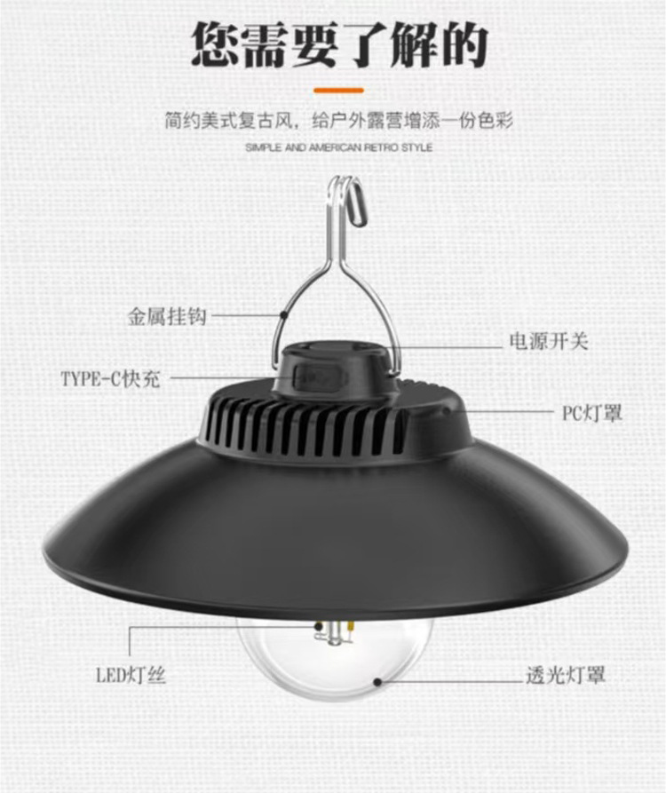アウトドアキャンプライトテントライトTypeC緊急充電照明雰囲気ライト吊り下げレトロライトキャンプキャンプライト