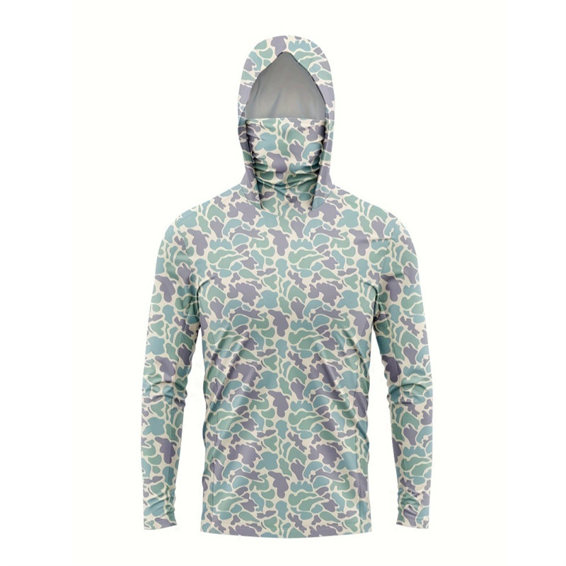 アウトドアスポーツフィッシングウェア、マスク、フード付き長袖迷彩シャツ、軽量日焼け止めルアーフィッシングウェアを在庫あり、すぐに発送可能