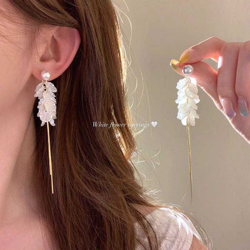 夏の真珠の白い花びらタッセルイヤリング、ハイエンドの軽い豪華なイヤリング、女性の海辺の休暇スタイルのイヤリング