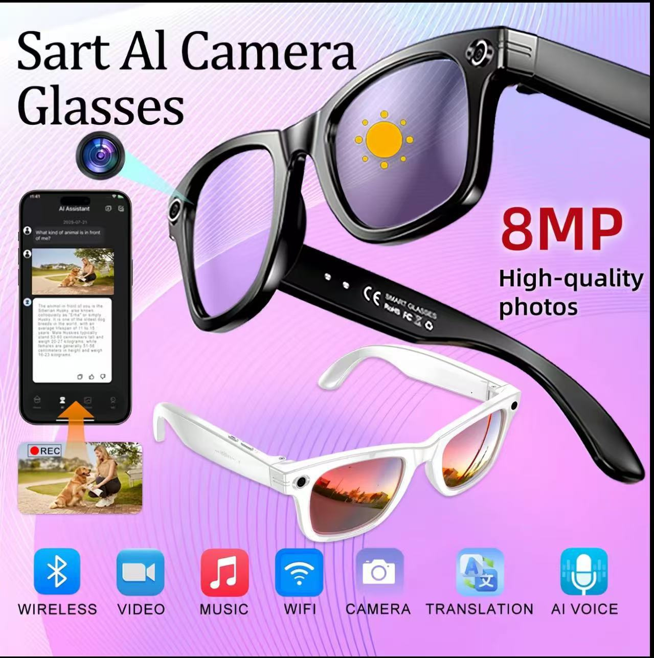 W610眼镜800W像素AI翻译拍照摄像智能眼镜WIFI传图双降噪防抖墨镜