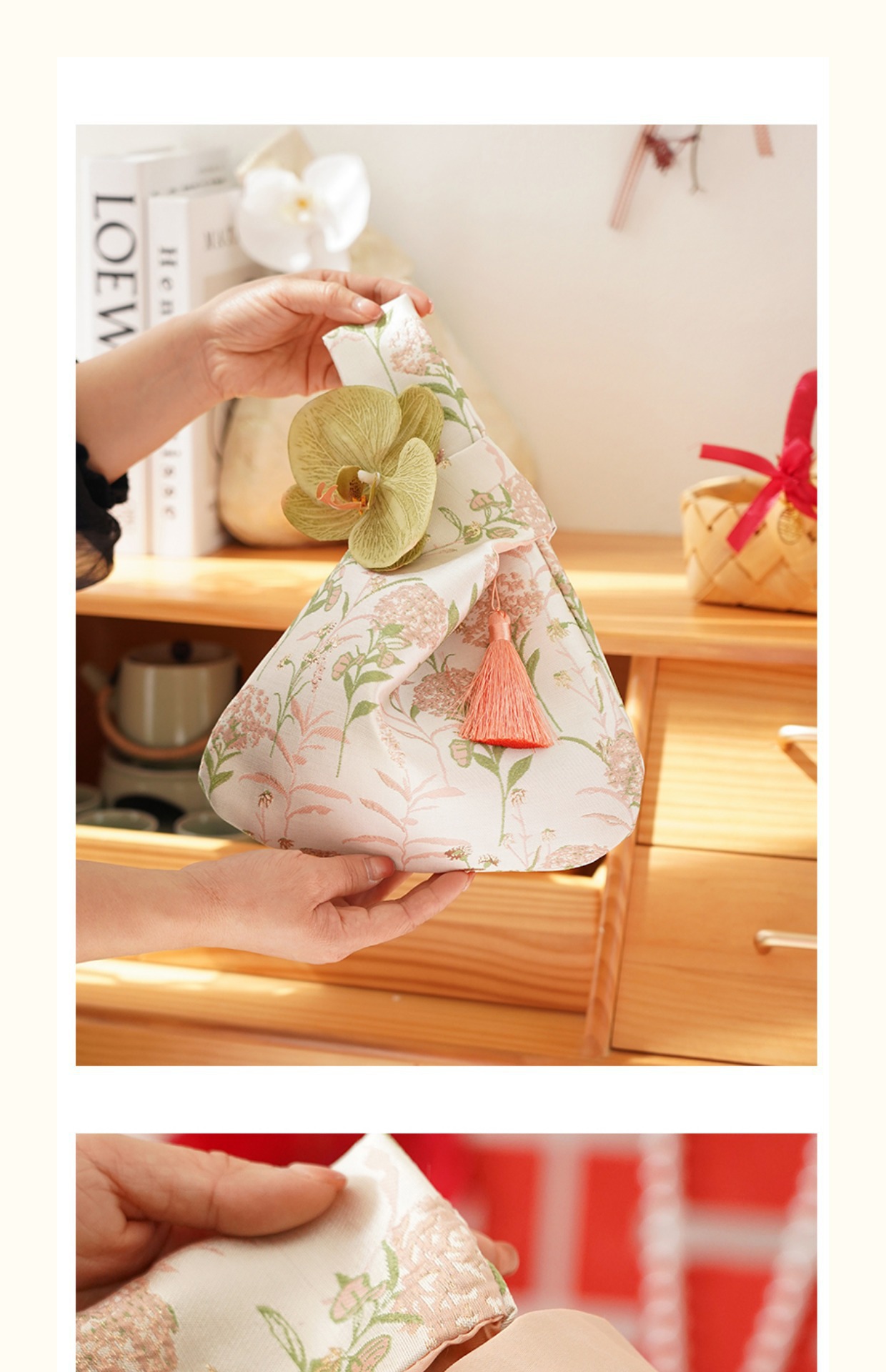 仕様 花とタッセルが付いたピンクのリストバッグ,花とタッセルが付いた青いリストバッグ,花とタッセルが付いたシャンパンカラーのリストバッグ,花とタッセルが付いた赤いリストバッグ