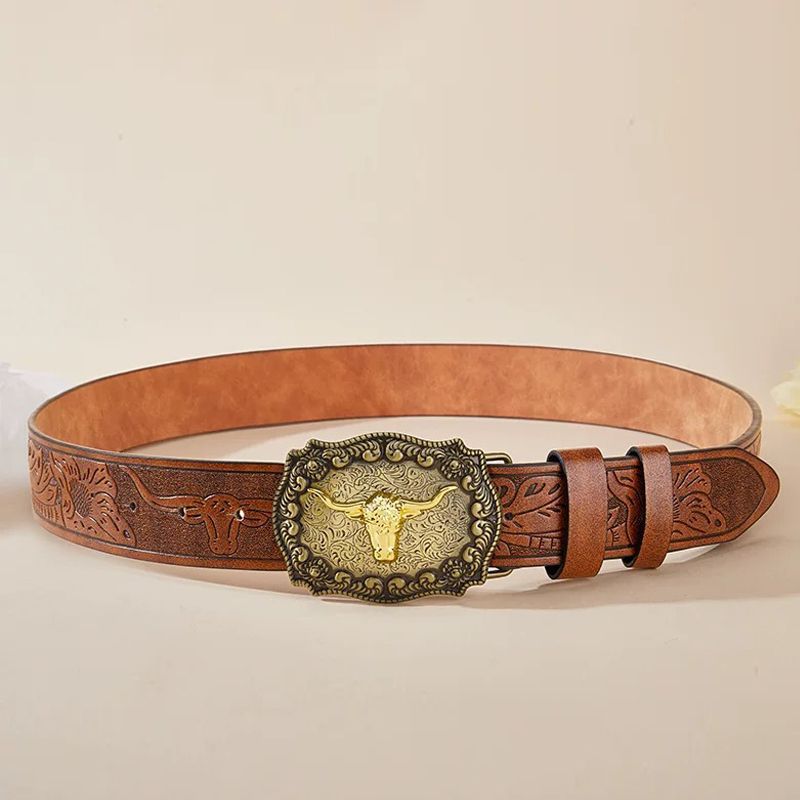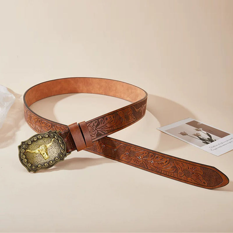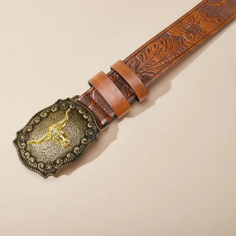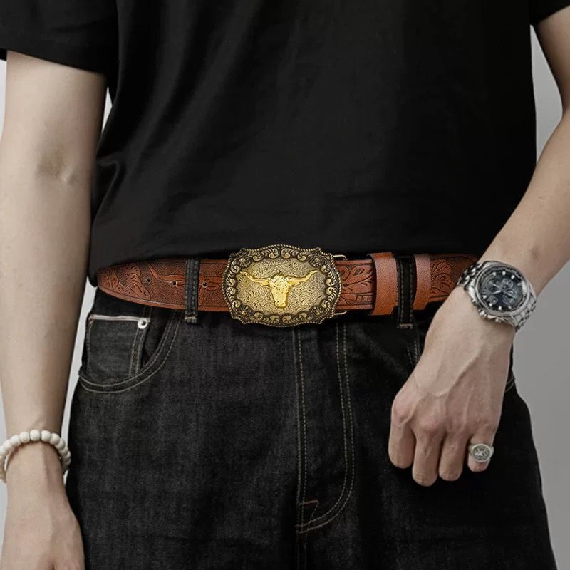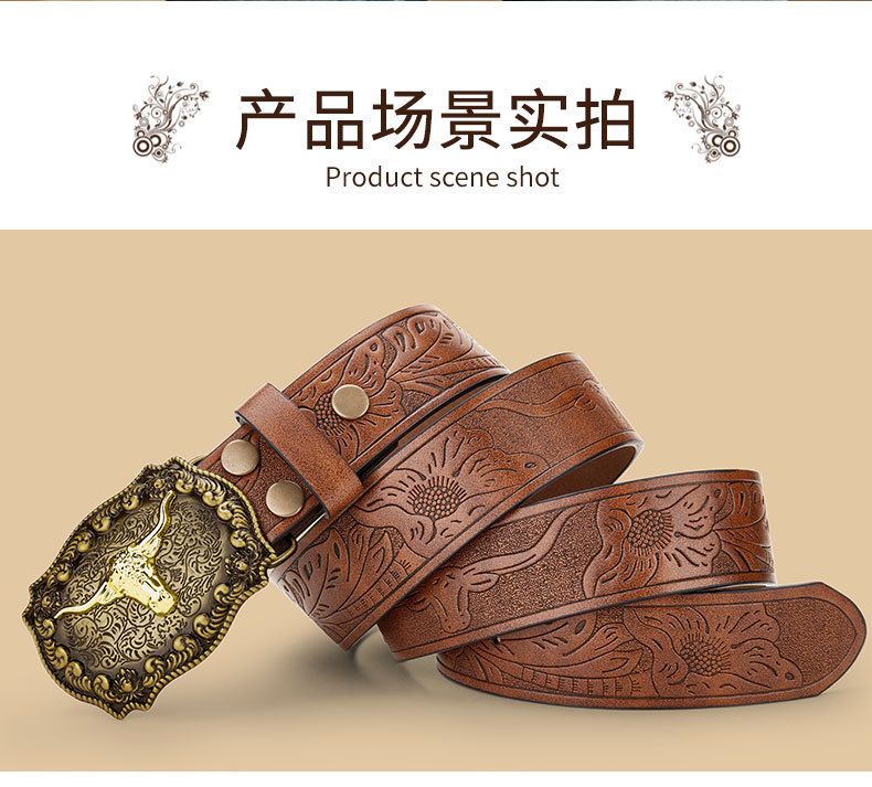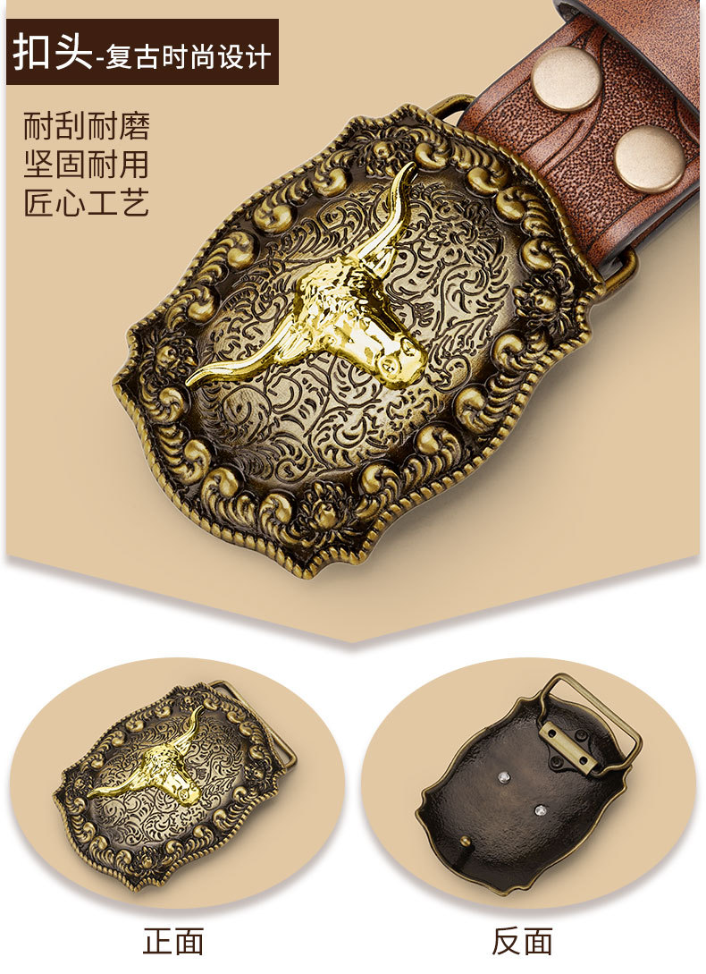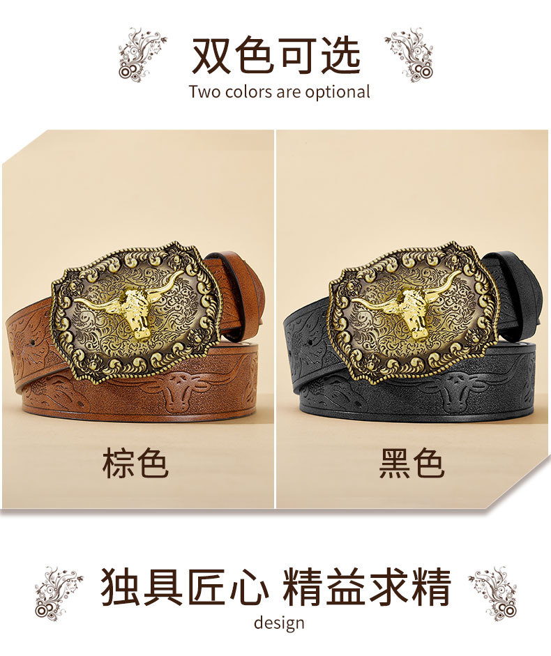 ブルヘッド合金スムースバックルプリントベルトメンズレトロファッションエスニックスタイルズボンベルトウエスタンカウボーイベルト国民スタイル