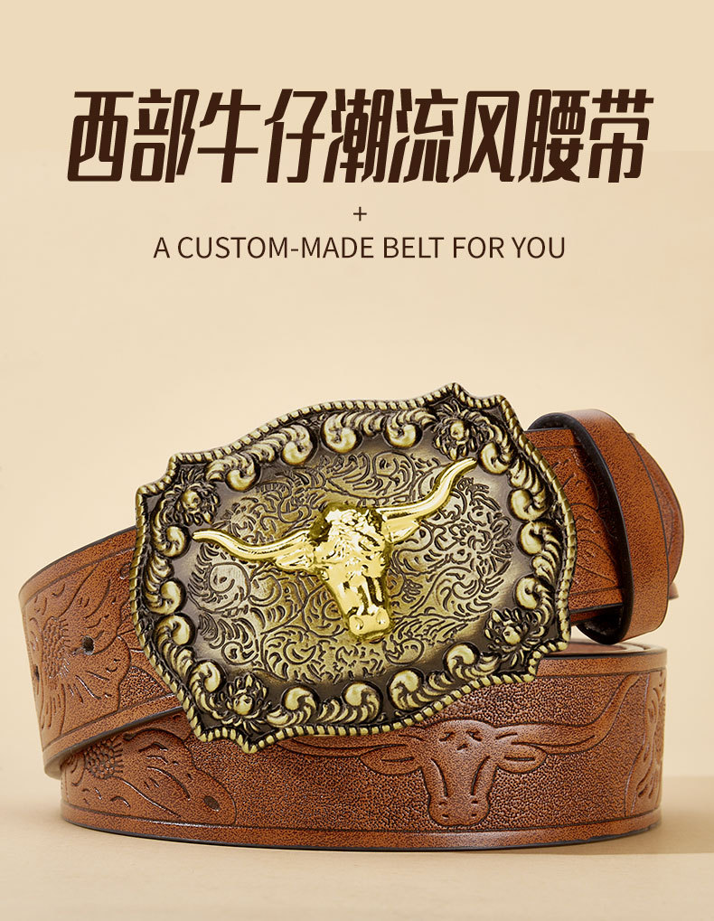 新款跨境西部牛仔皮带大板扣潮流腰带青年美式炸街外搭皮革裤腰带