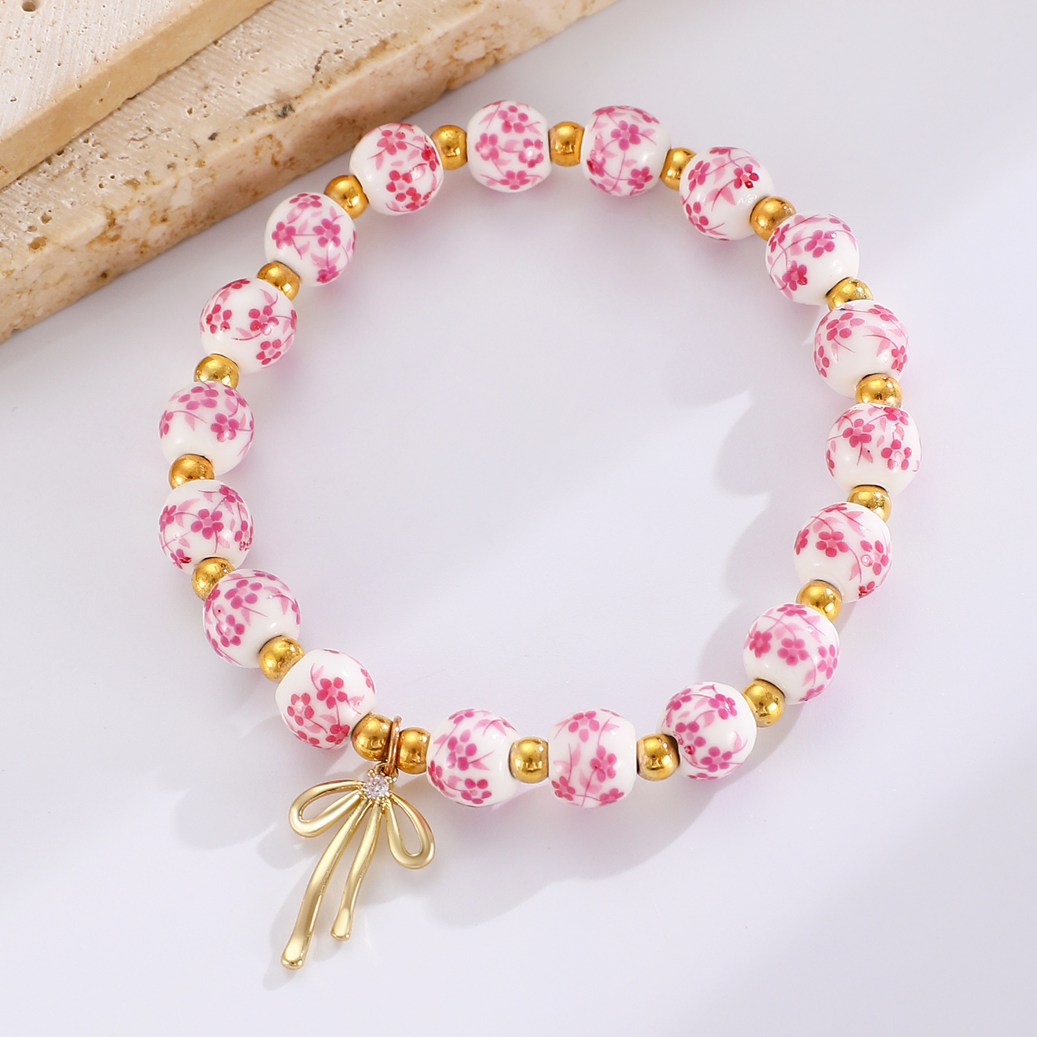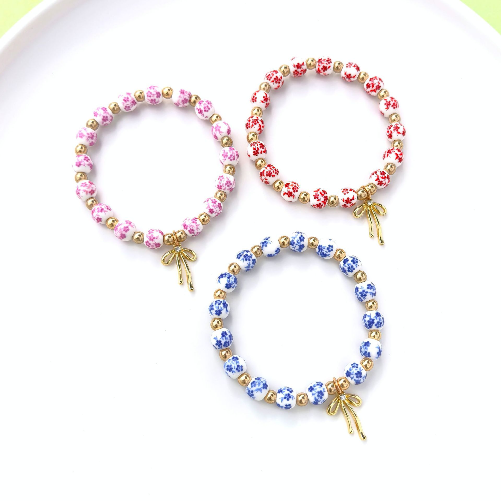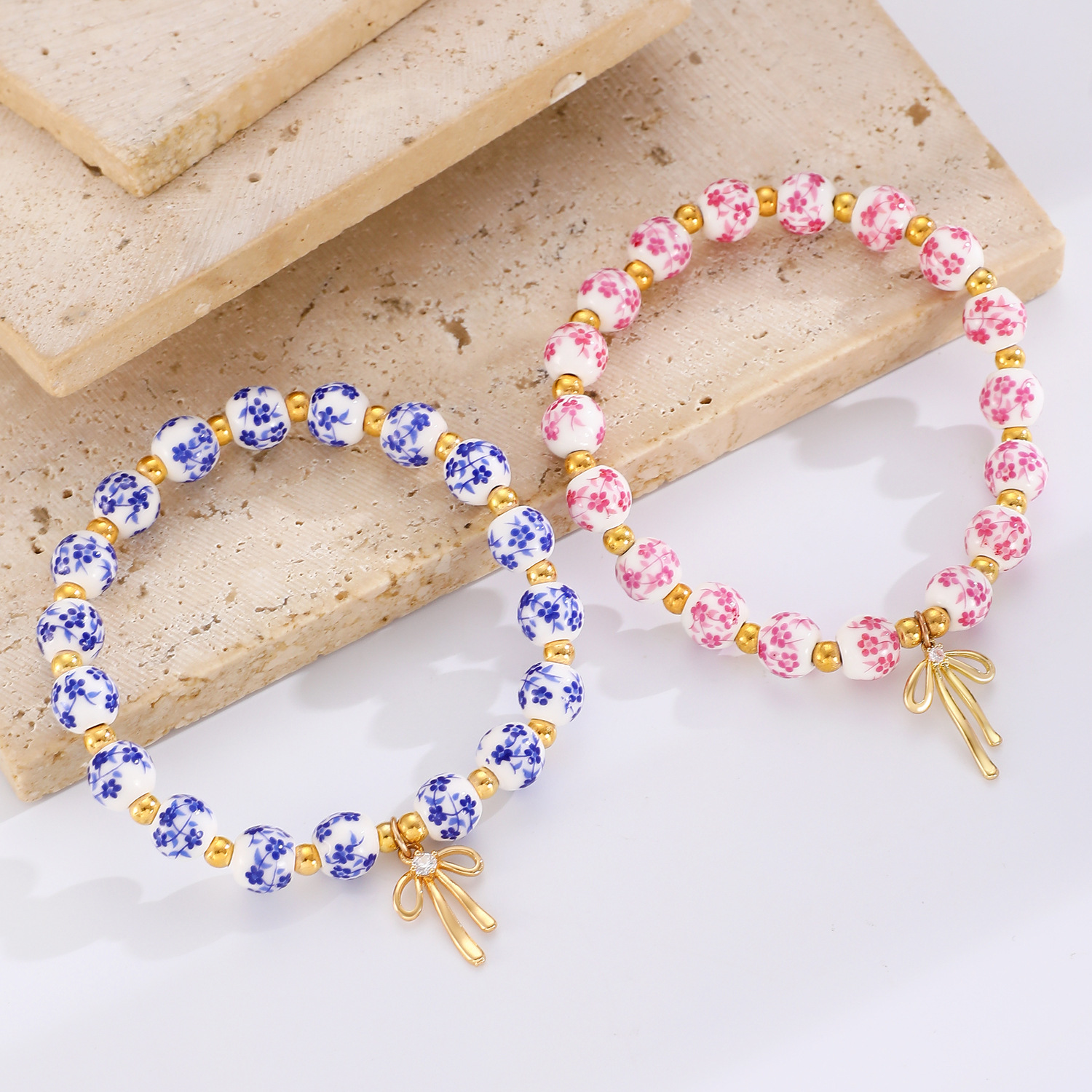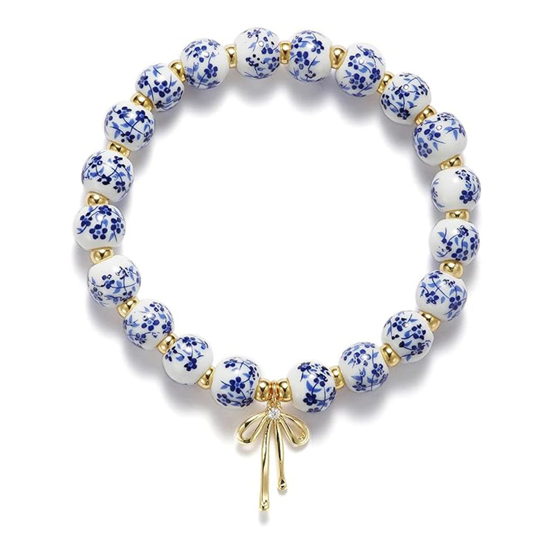 亚马逊热卖青花瓷串珠蝴蝶结女士手链花复古手链手工弹力串珠批发