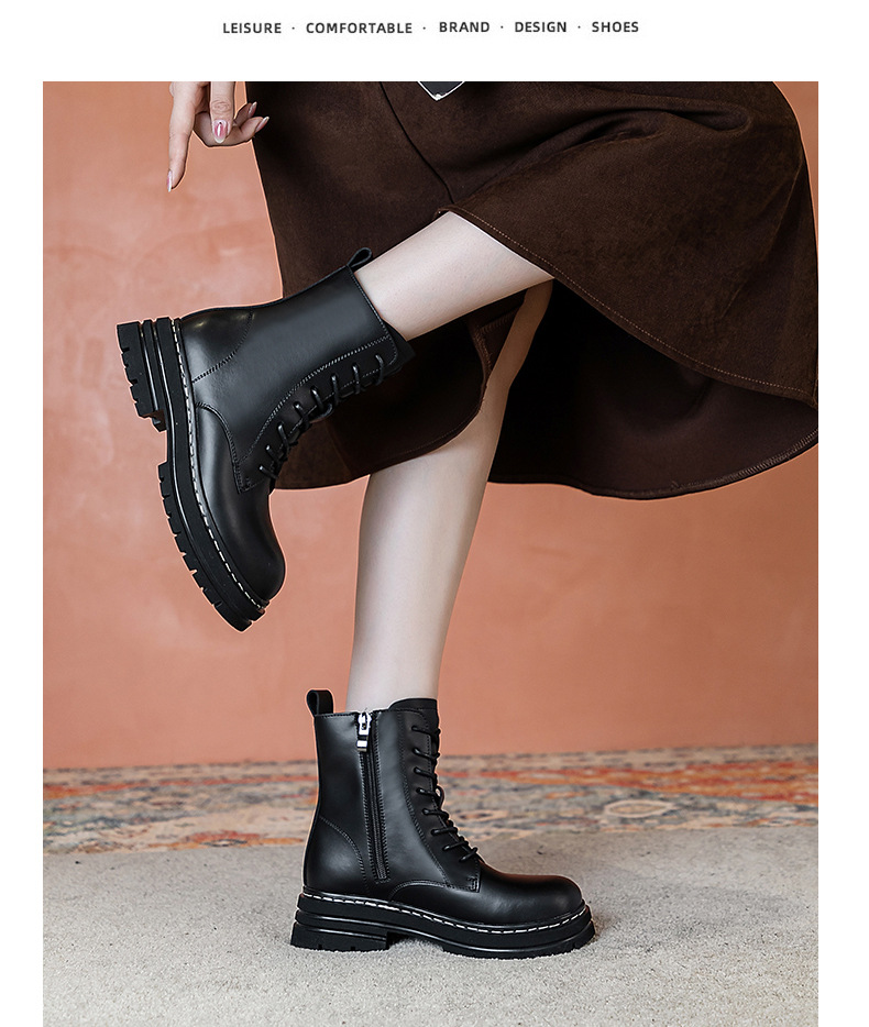 厚底マーティンブーツ レディース ショートブーツ 2023 冬 厚手 本革 ブラックブーツ フラットソール レディース レザーブーツ 裏起毛タイプ