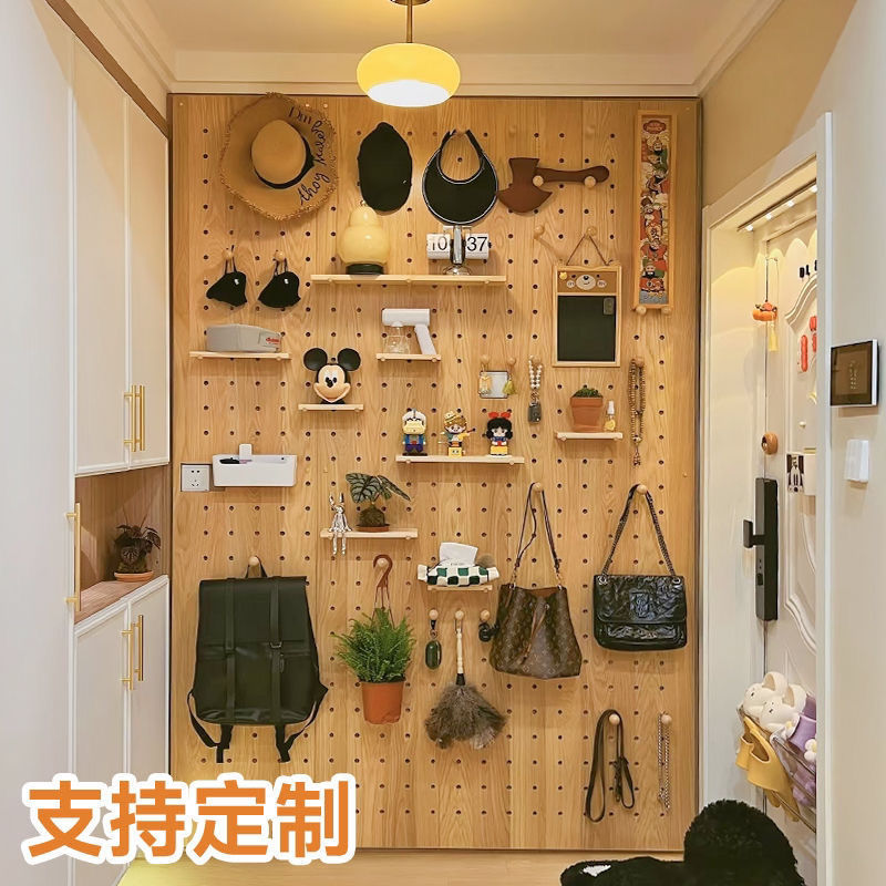 穴あきボード収納棚、無垢材玄関壁掛け、塗装不要の壁面装飾棚、収納棚、ディスプレイ棚、吊り下げボード