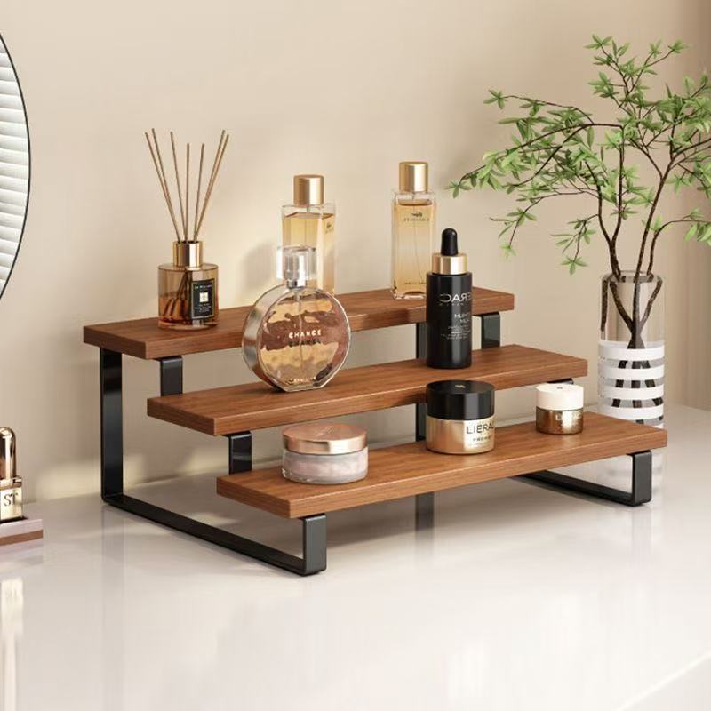 収納ラック 段付きデスクトップシェルフ ブラックウォールナット色 収納棚 香水 木製 コーヒーカップホルダー ディスプレイ棚 幅広