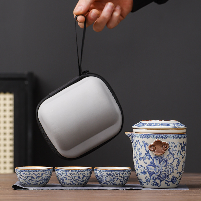 青と白の汝窯 1 ポット 3 カップ屋外セラミック旅行ティーセットギフトセットポータブルバッグクイックカップカンフーティーセット