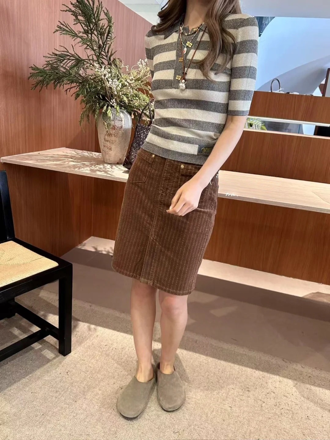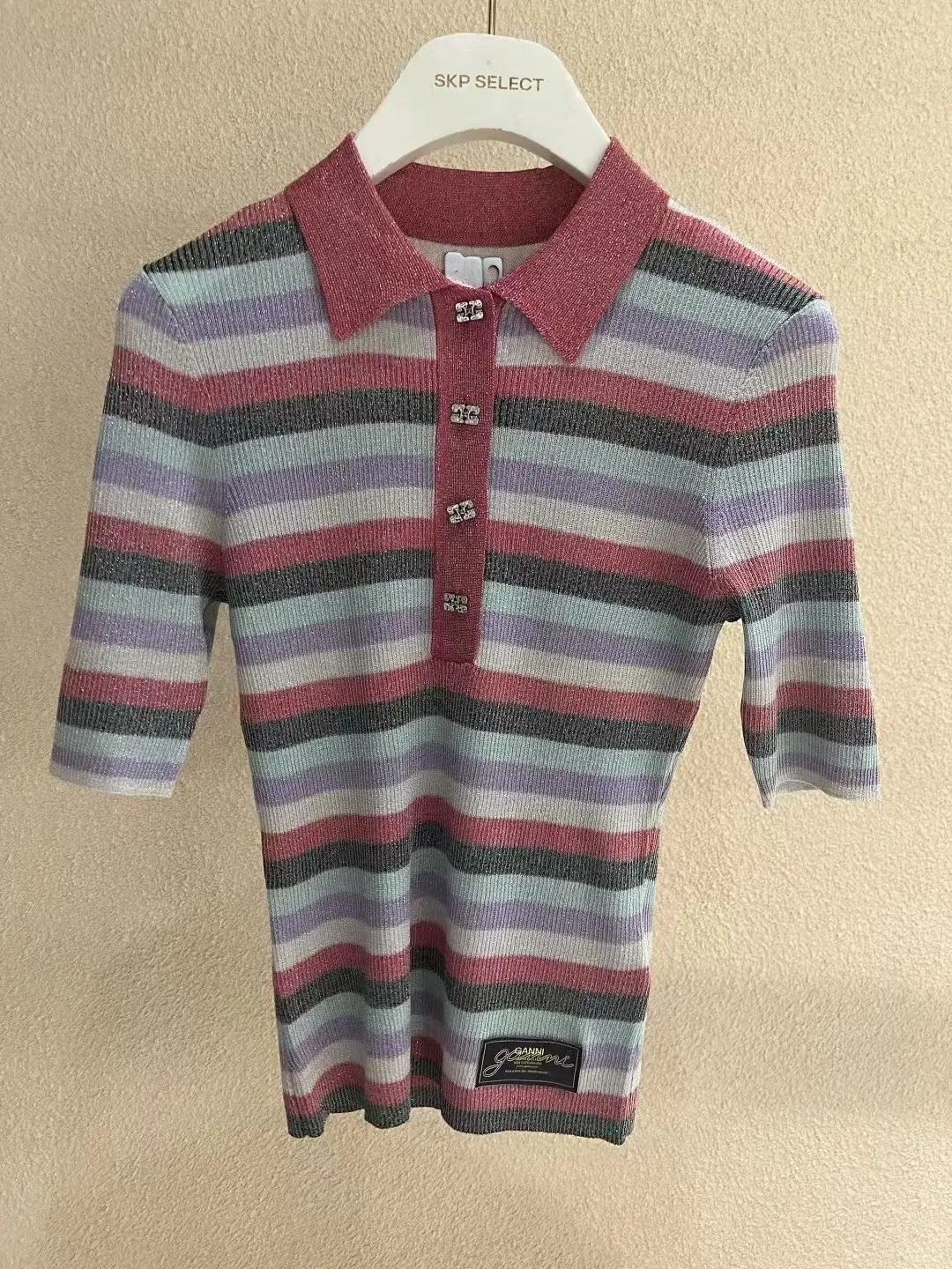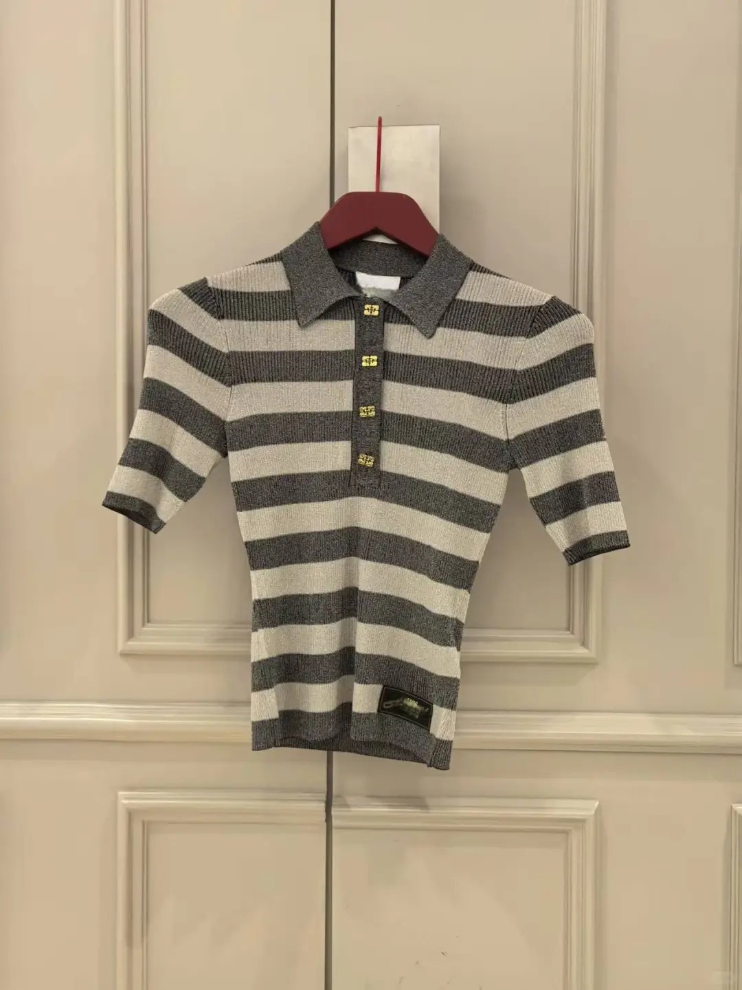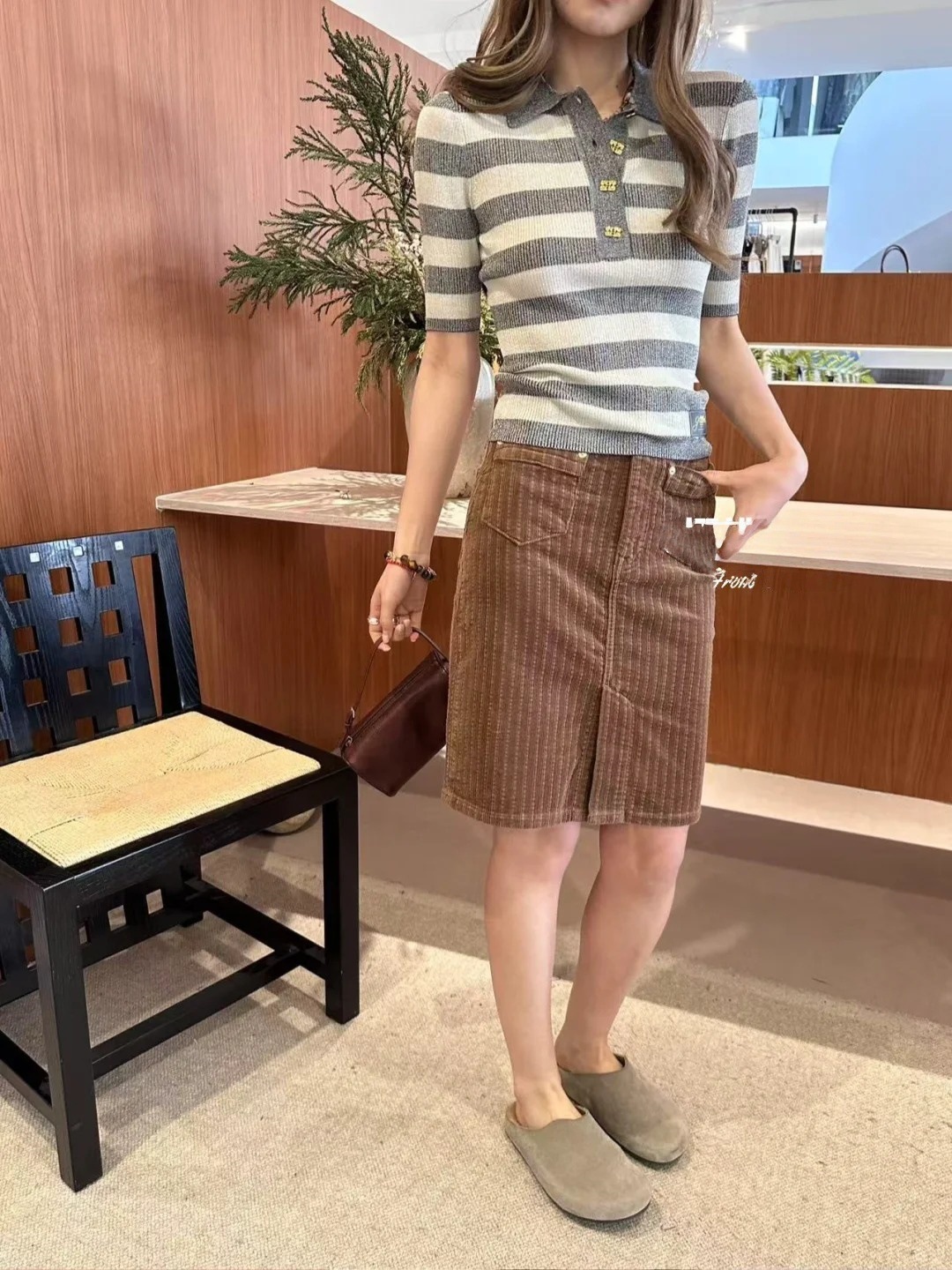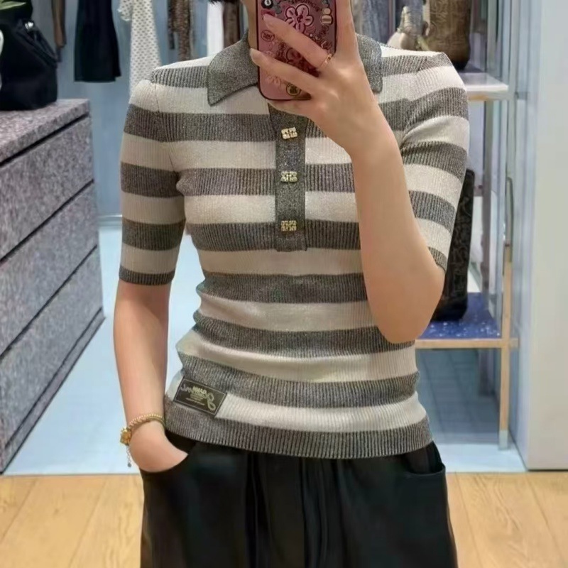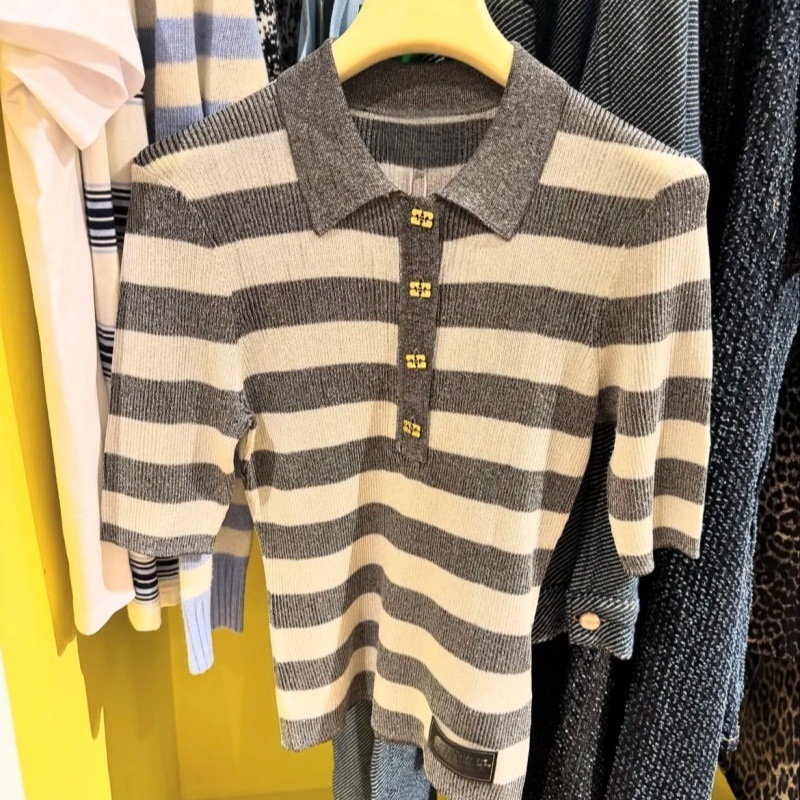 本物の羊毛!25初秋新作グレーと白のストライプポロ襟ニット伸縮性スリムフィットセーターニットトップス薄手