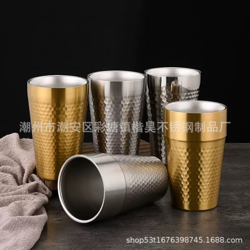 跨境304不锈钢锤纹水杯烤肉火锅店餐具啤酒杯双层防烫茶大容量
