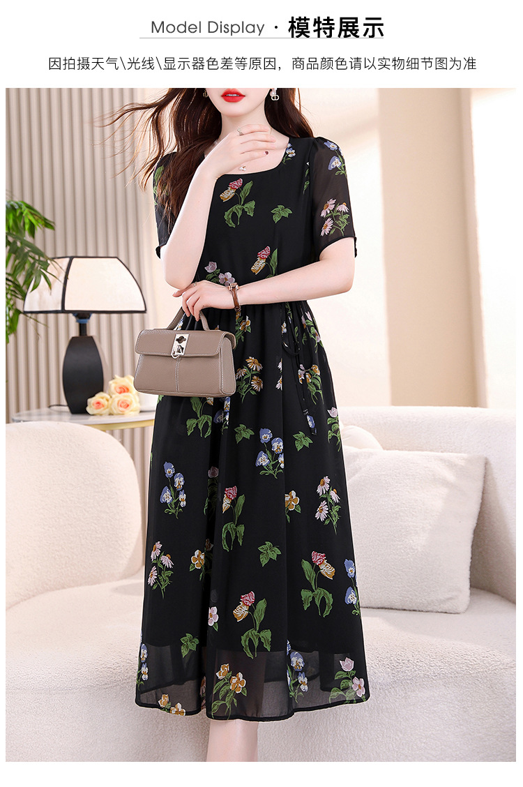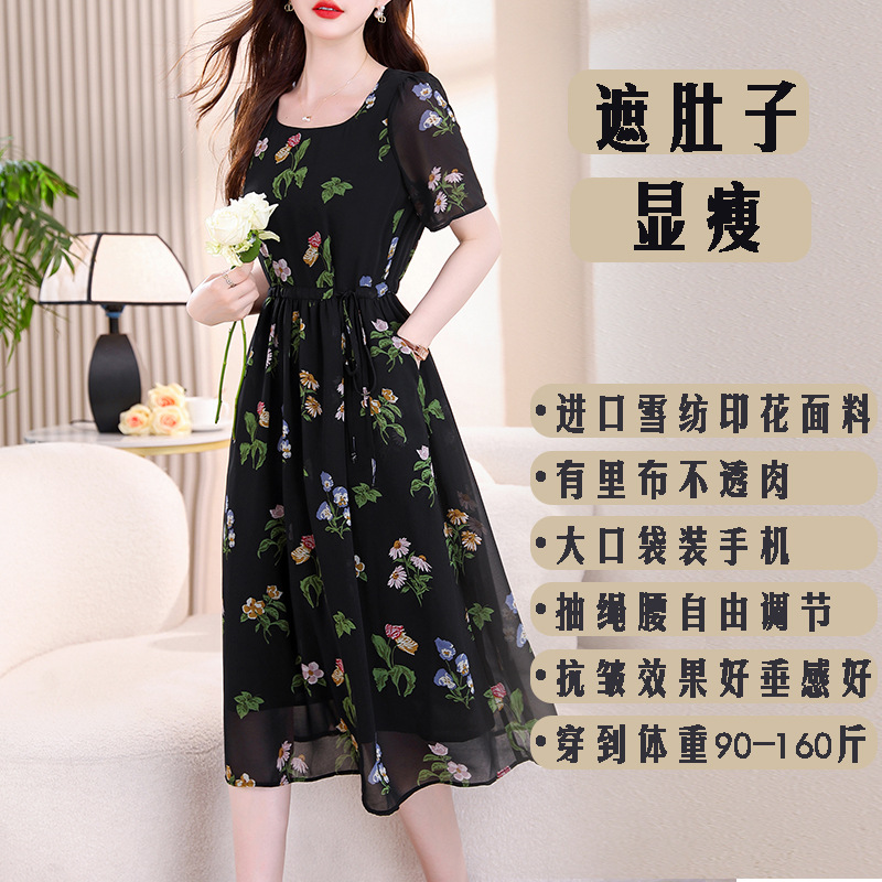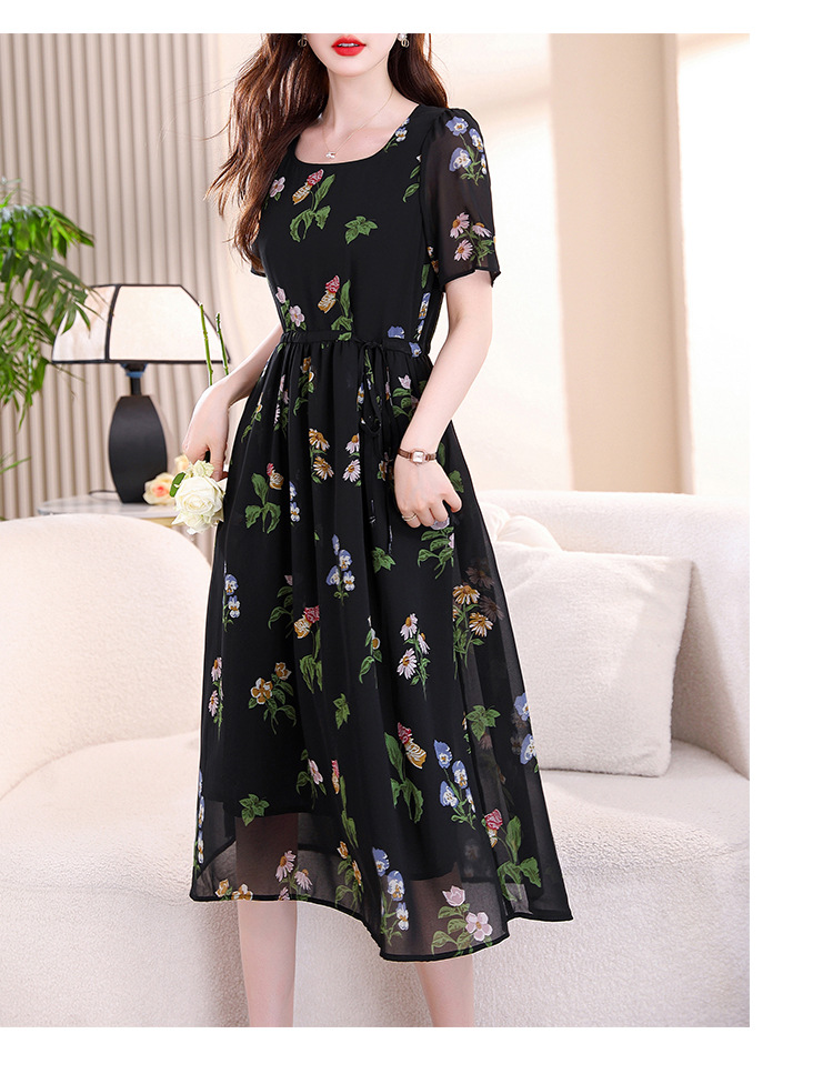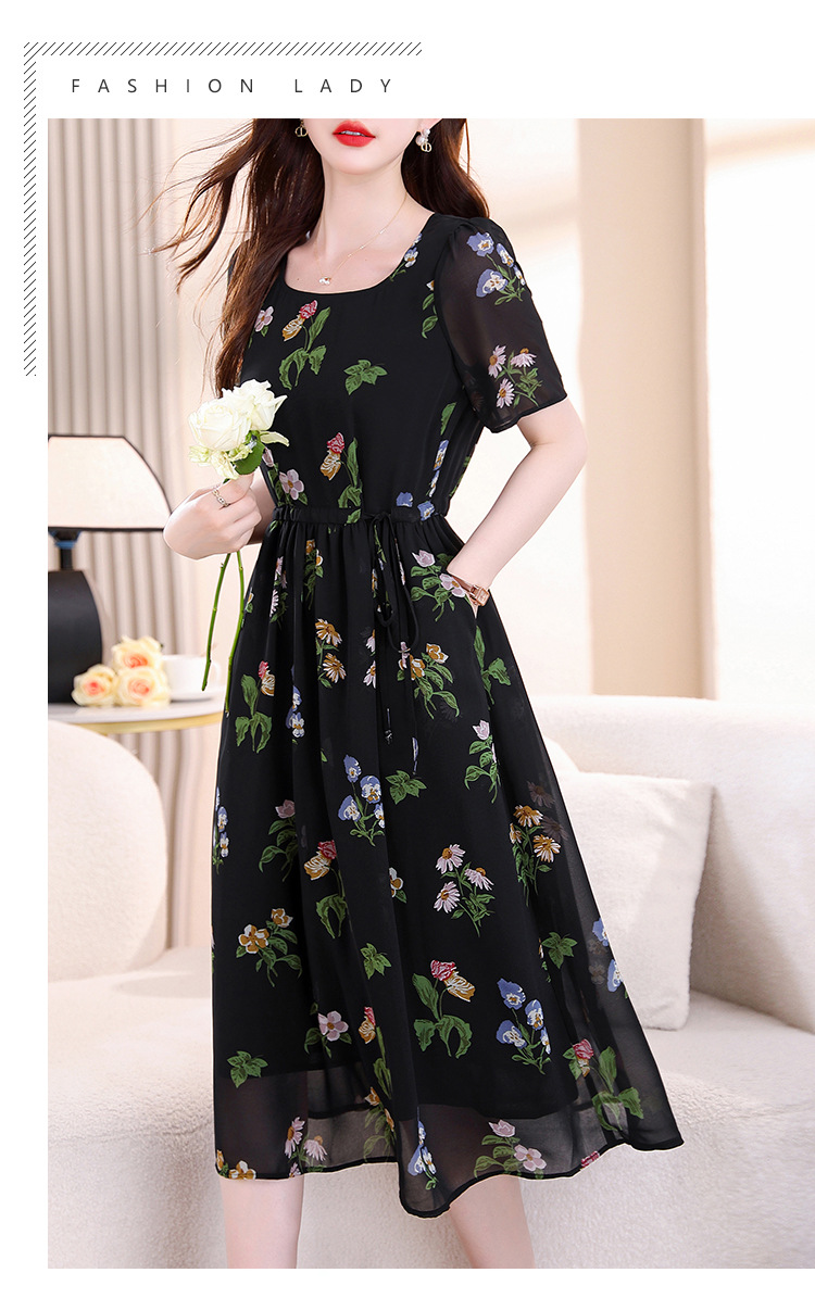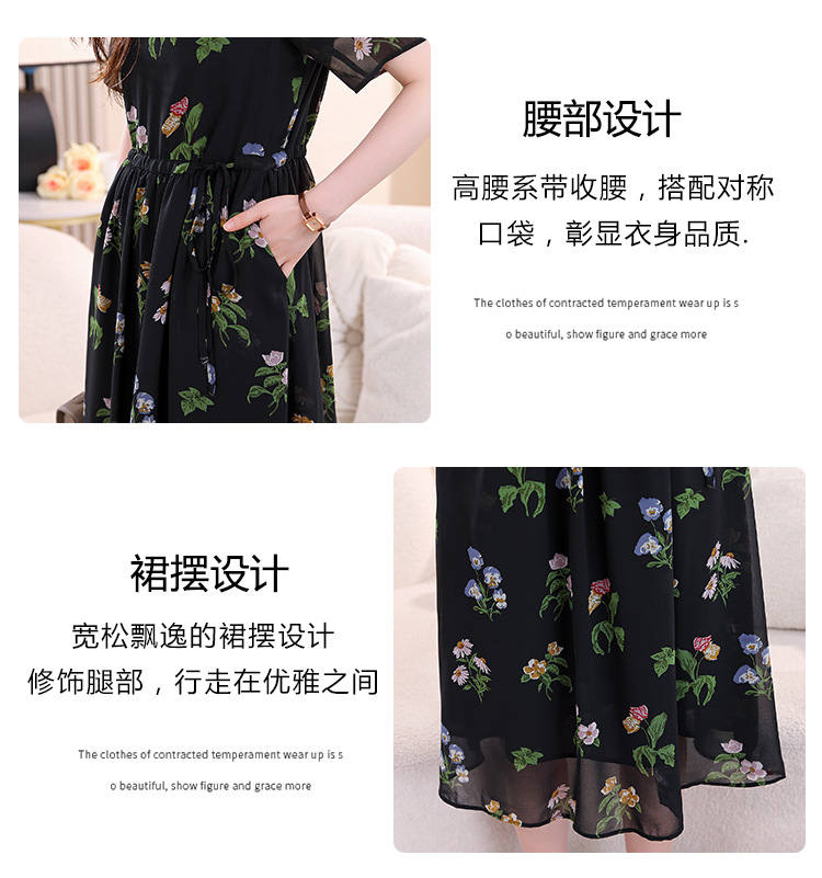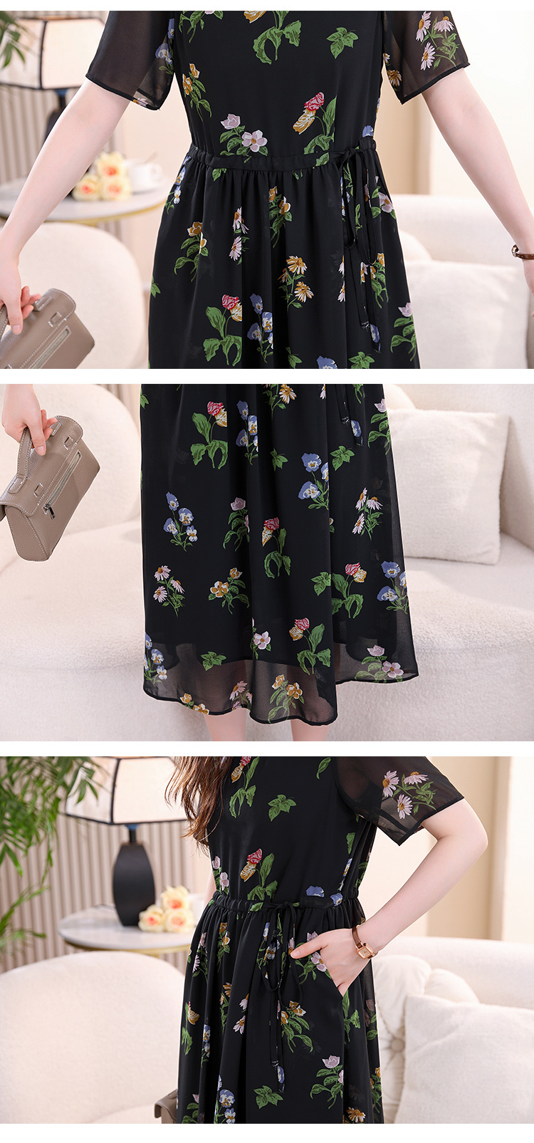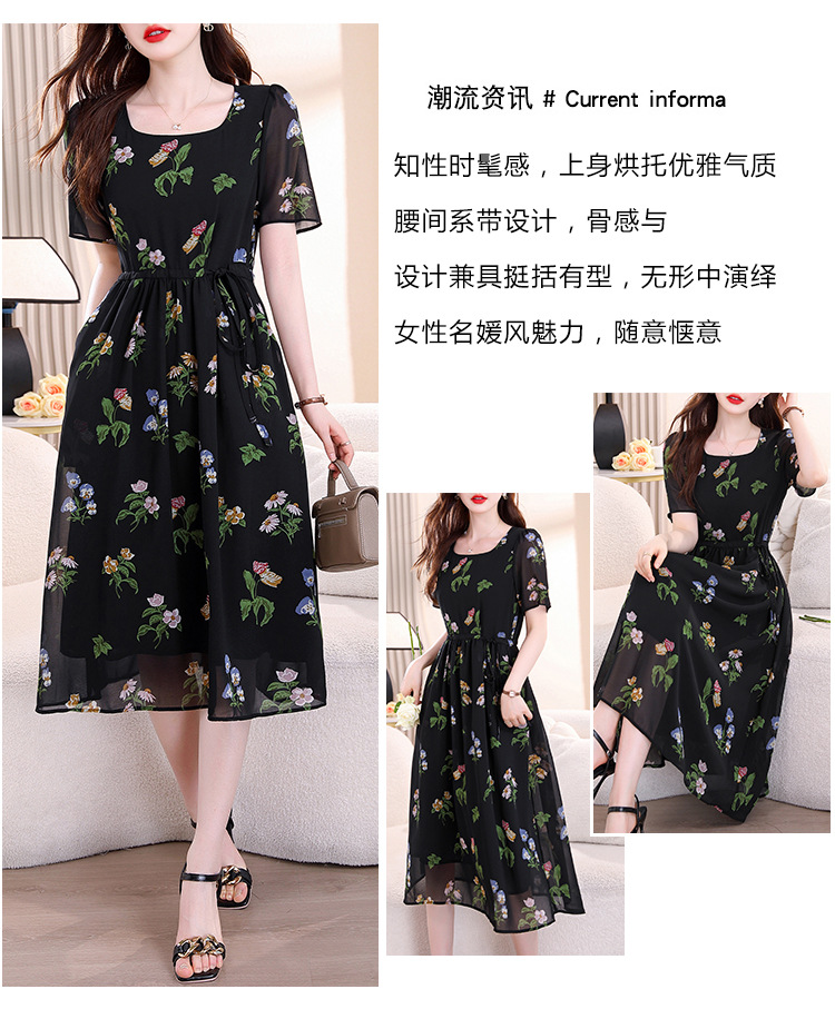 2025夏半袖ガラスシルクシフォンプリントラージUネックウエスト痩身ドレスミドル丈
