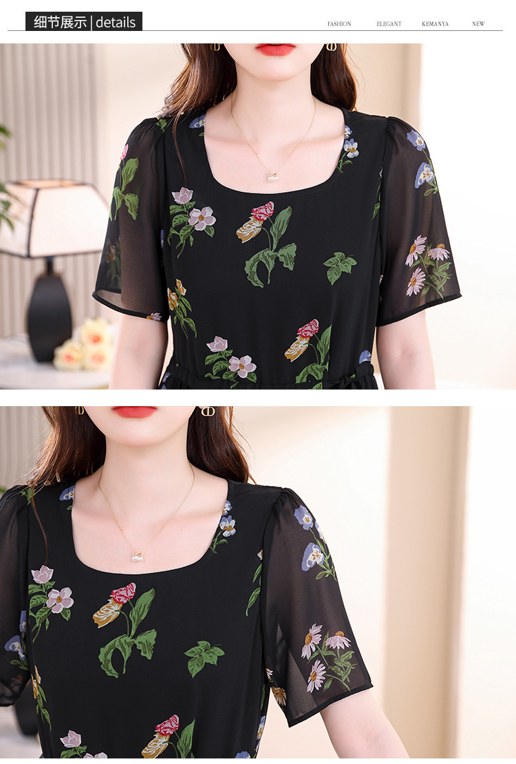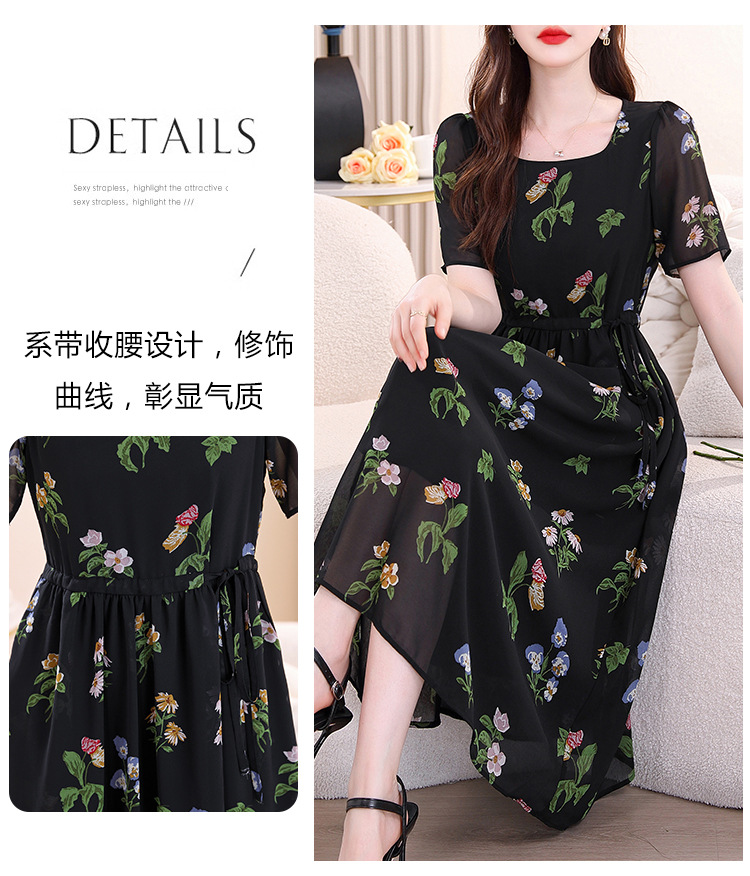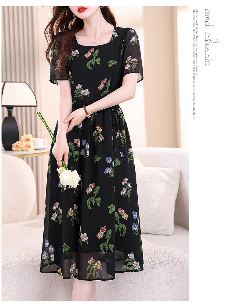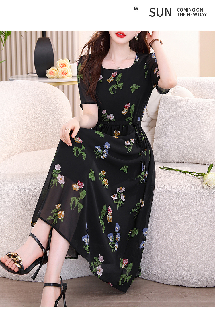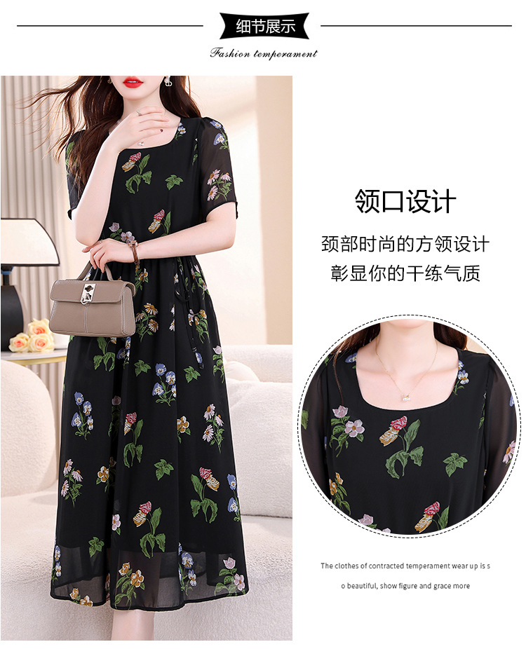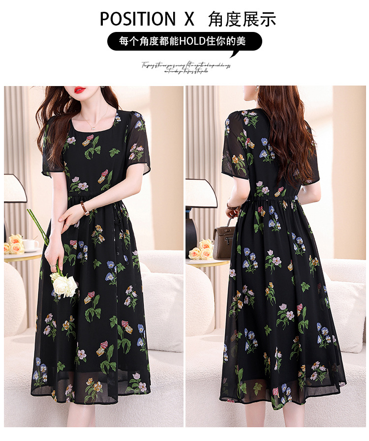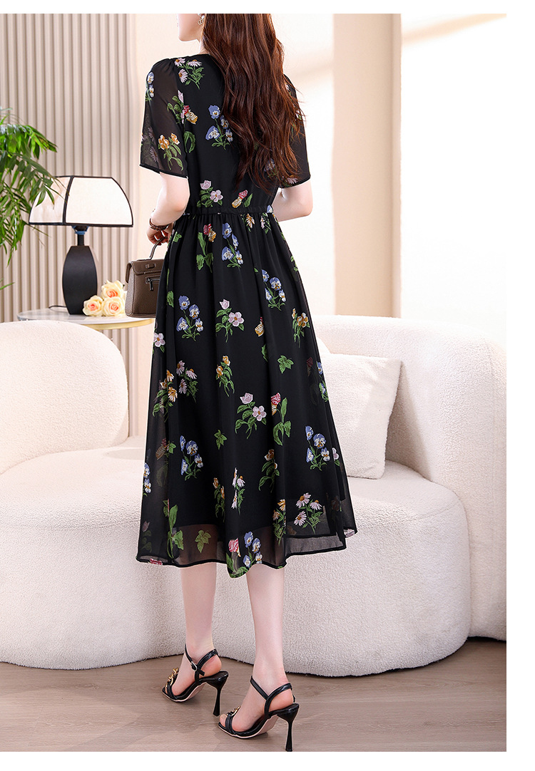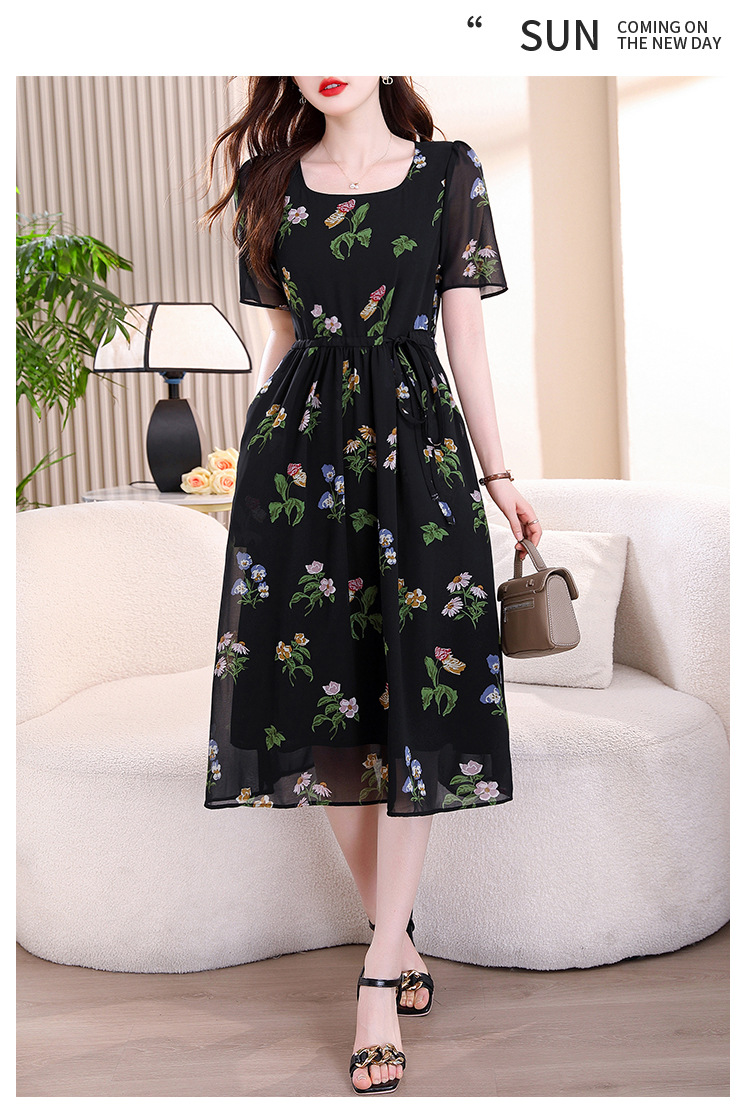 2025夏半袖ガラスシルクシフォンプリントラージUネックウエスト痩身ドレスミドル丈