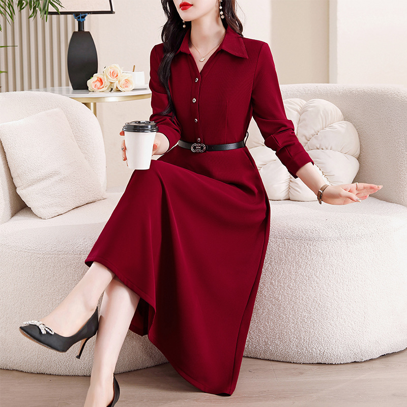 春秋酒红色单层有弹力收腰有口袋长袖减龄显瘦衬衣中长款连衣裙
