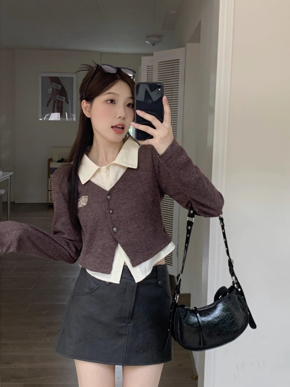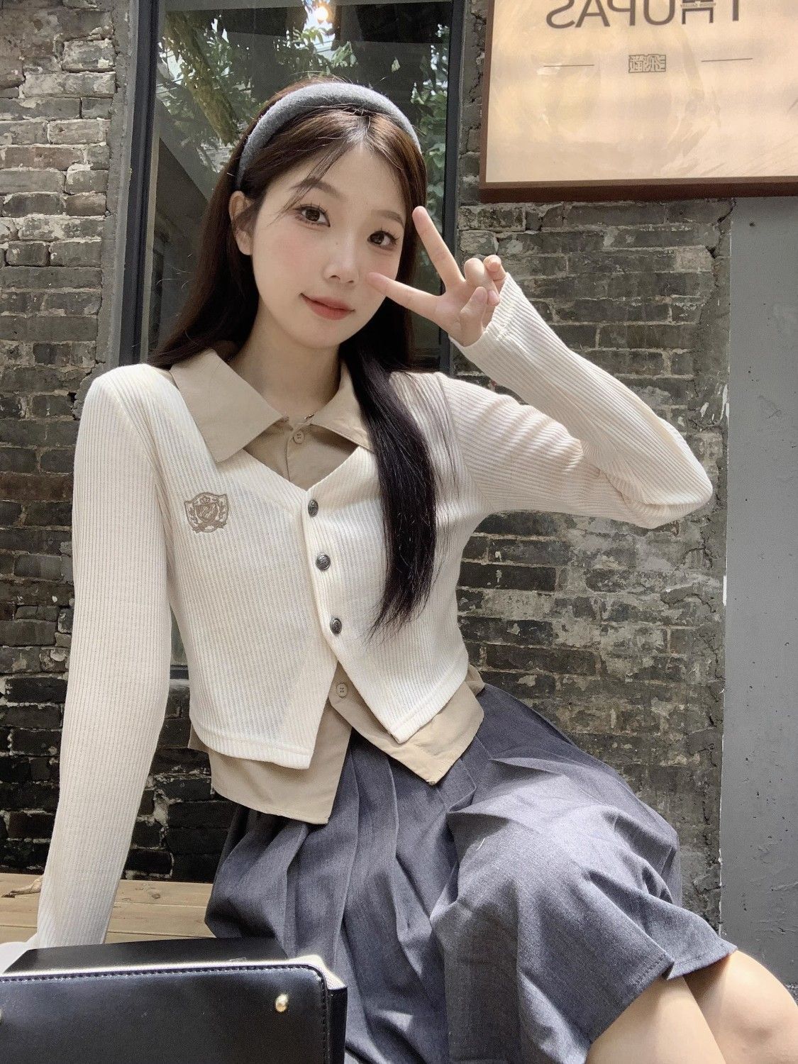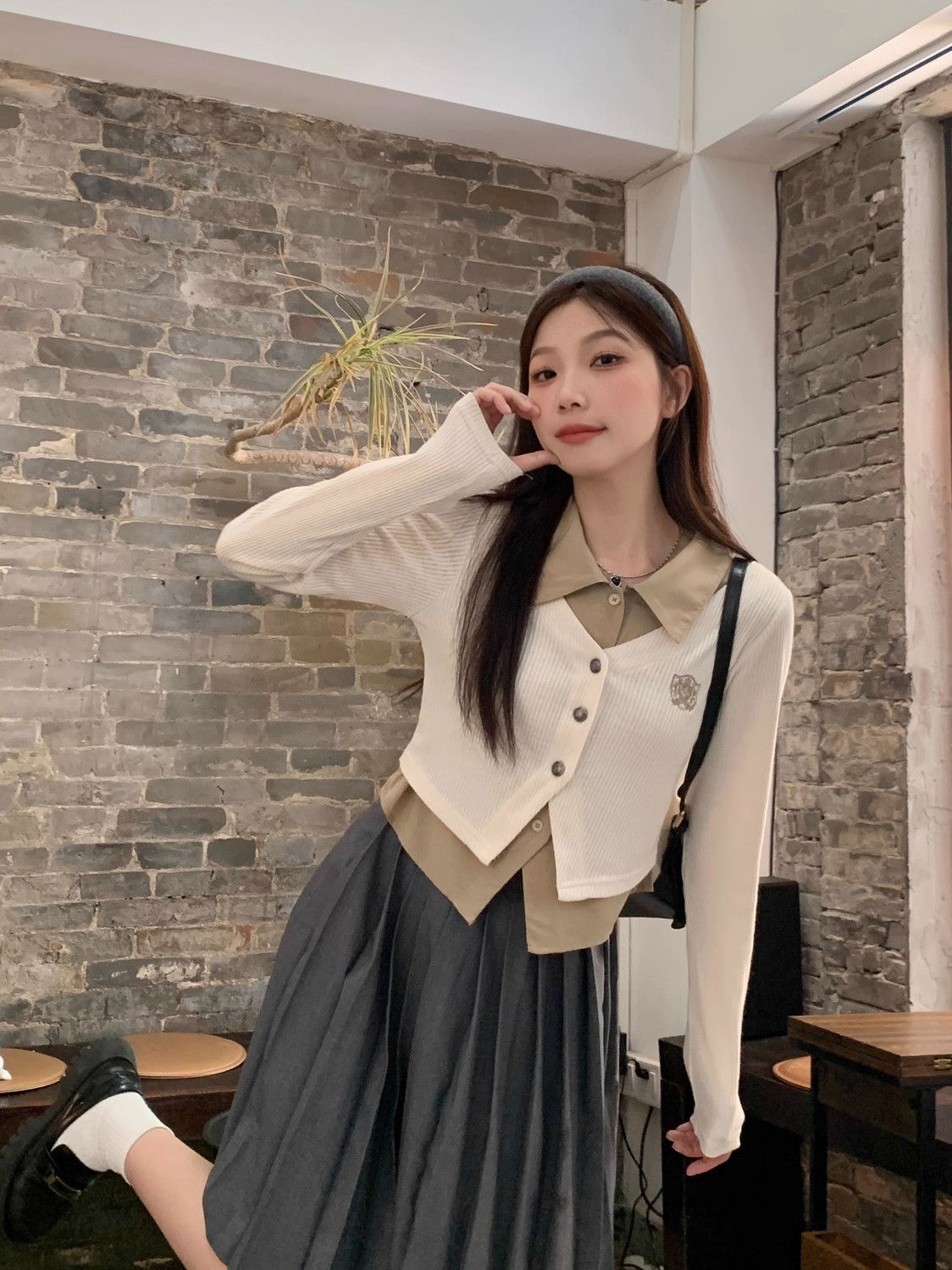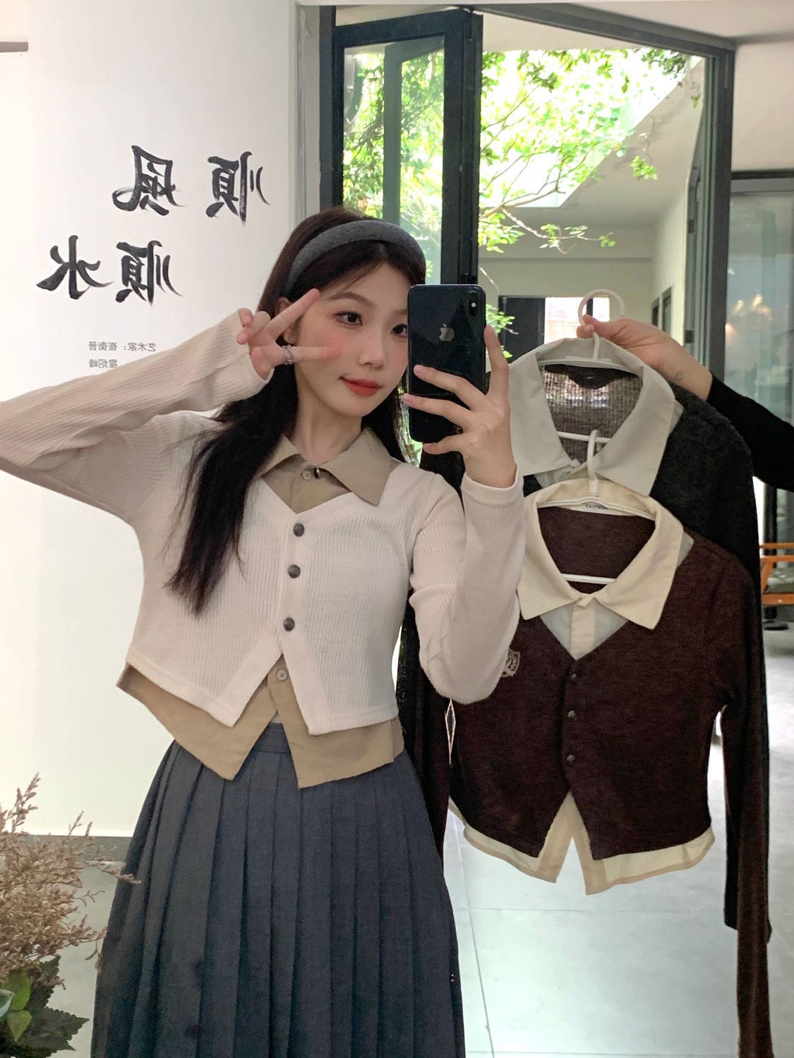 新しいツーピーススプライスニットシャツ2024春秋ニッチ新作カレッジスリムで肉感のある長袖トップス