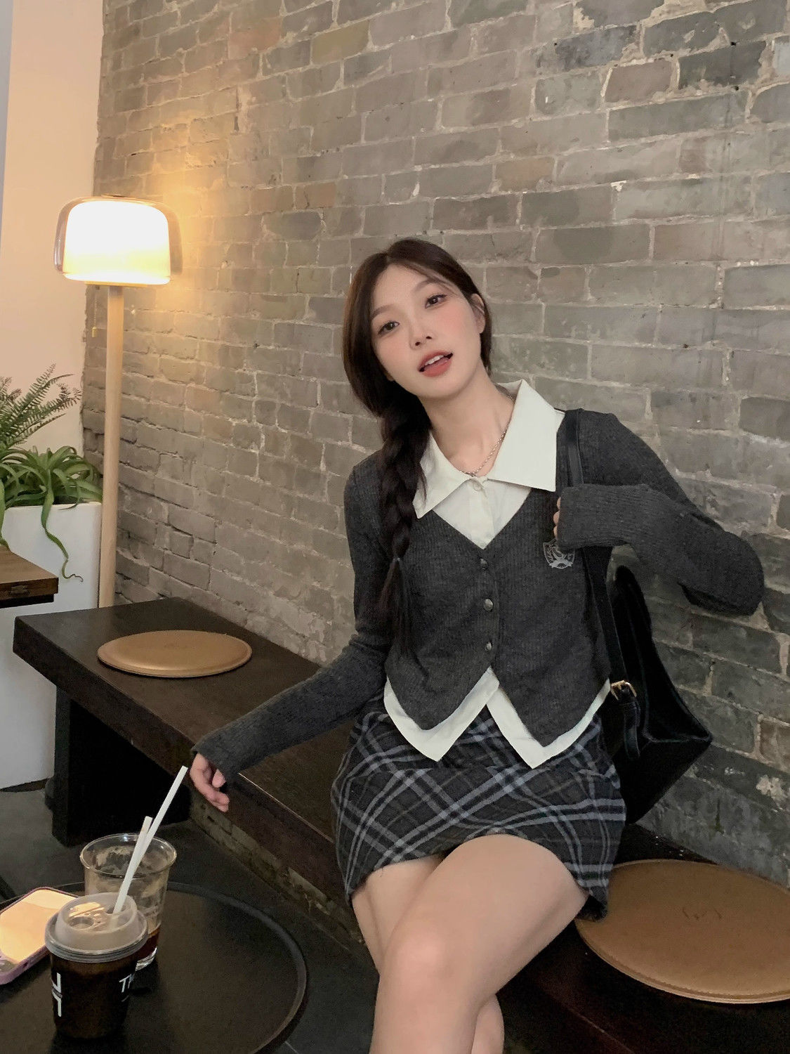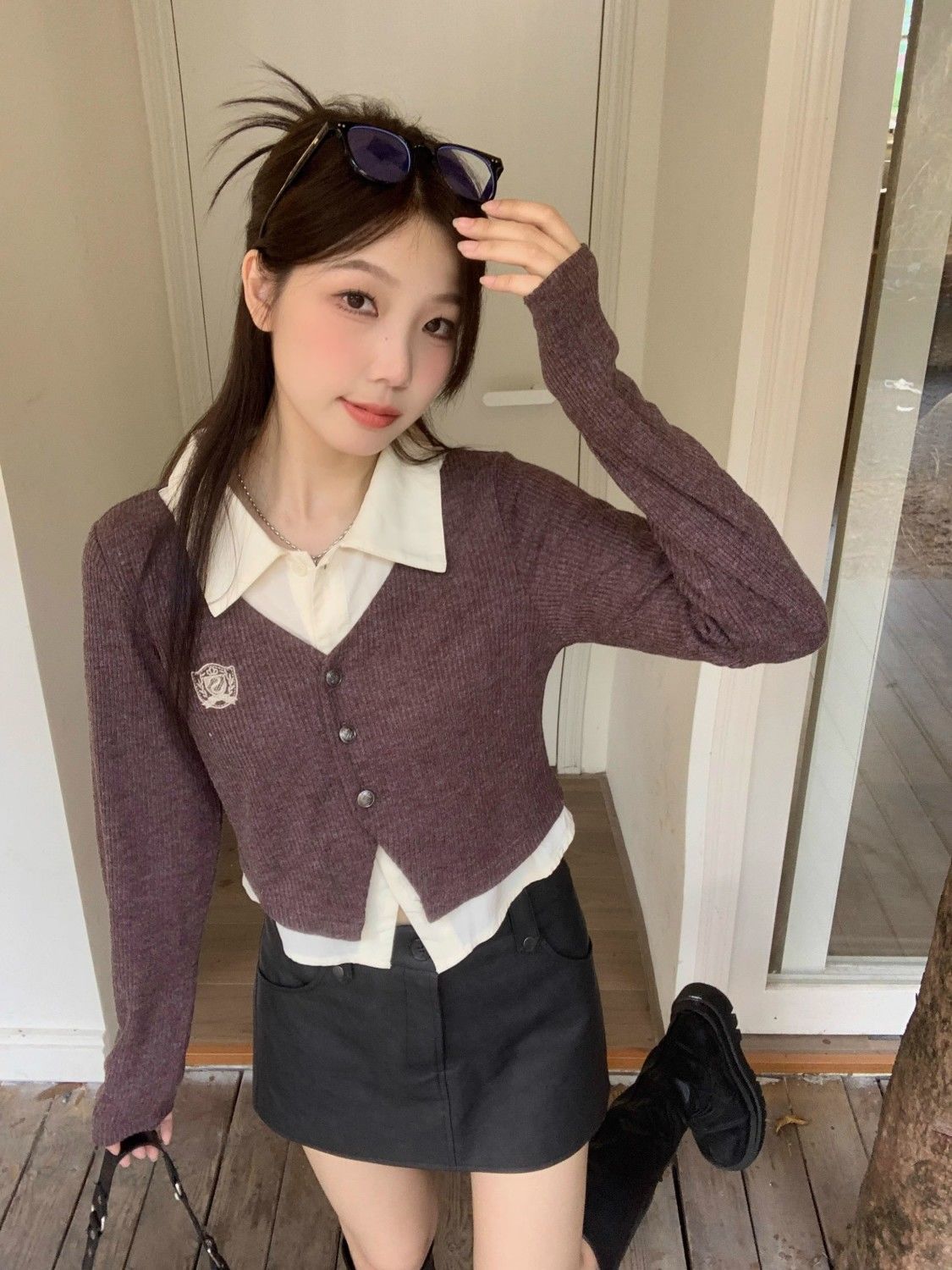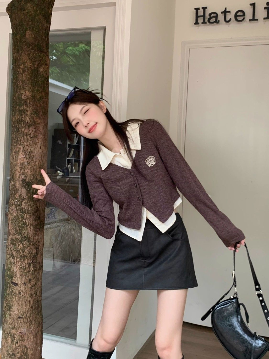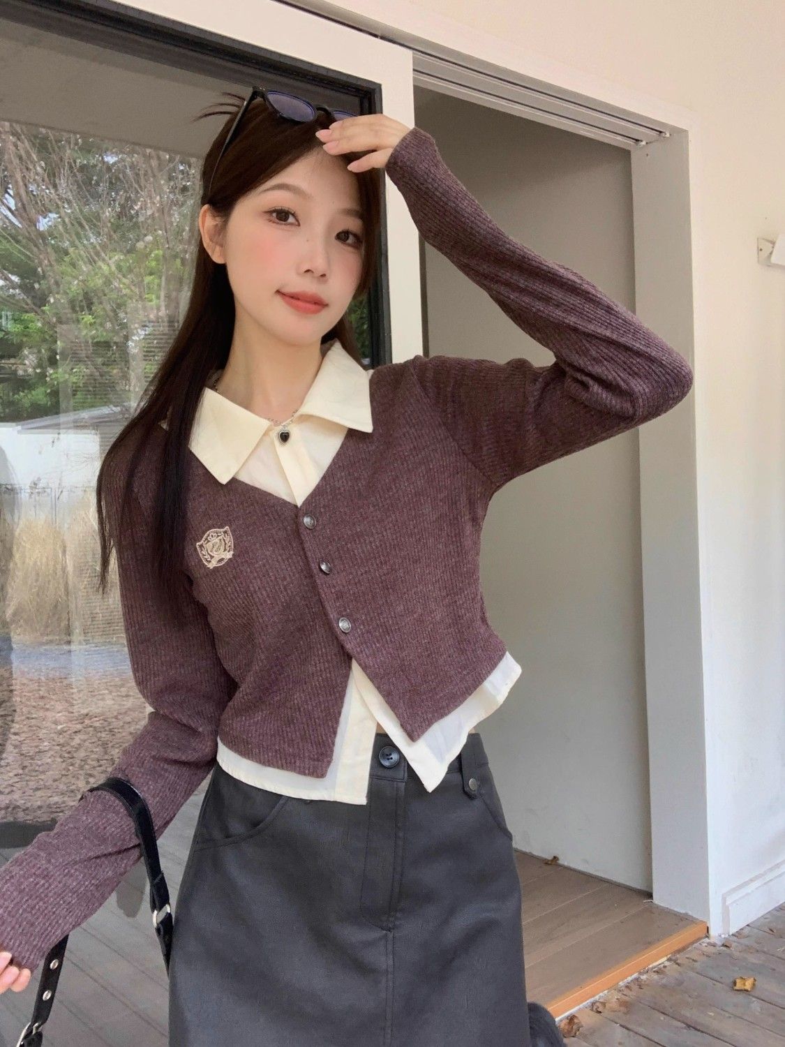 新しいツーピーススプライスニットシャツ2024春秋ニッチ新作カレッジスリムで肉感のある長袖トップス