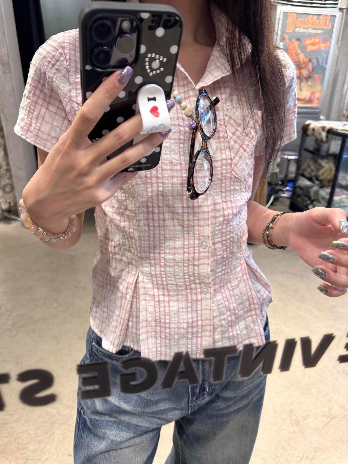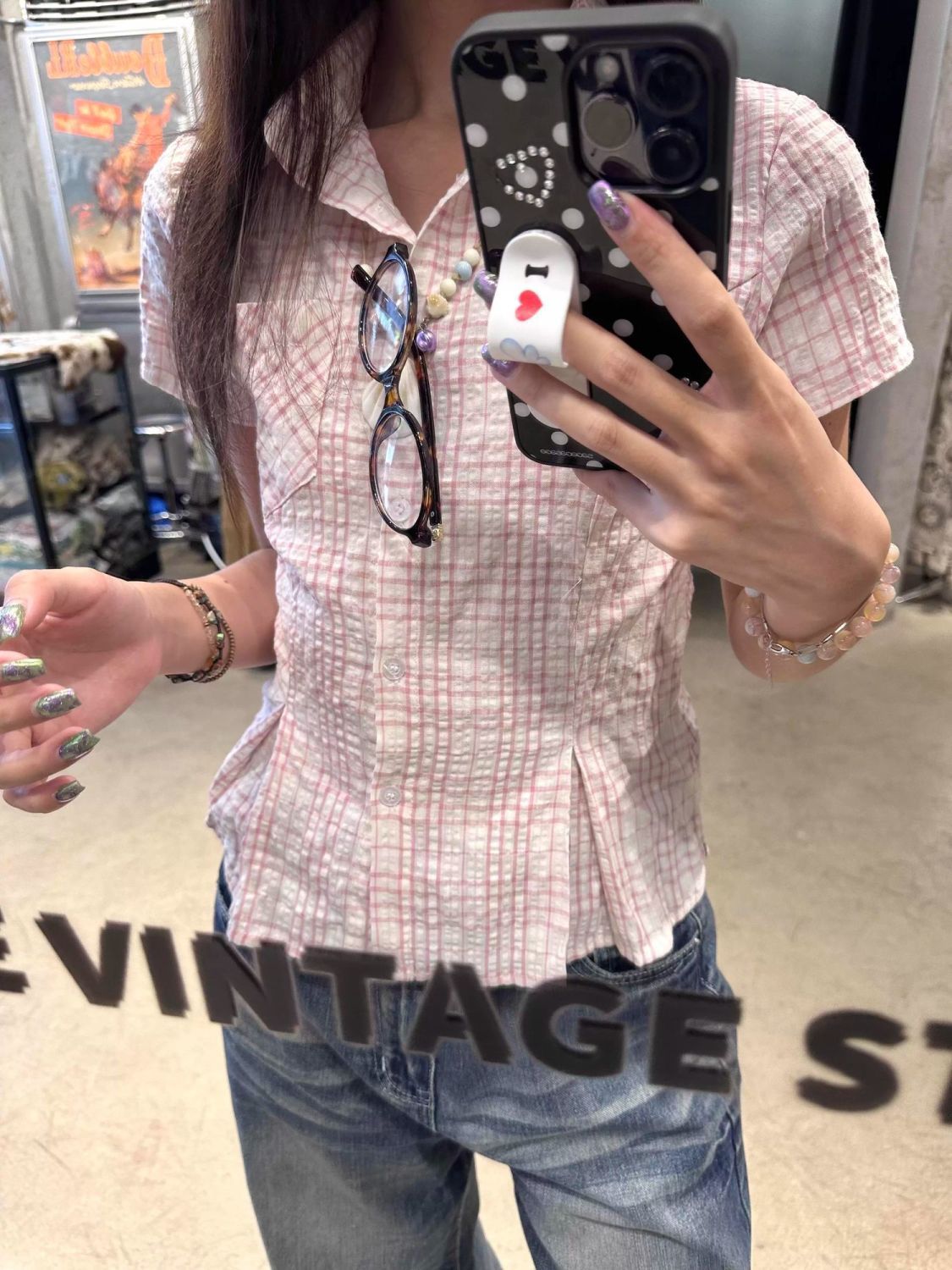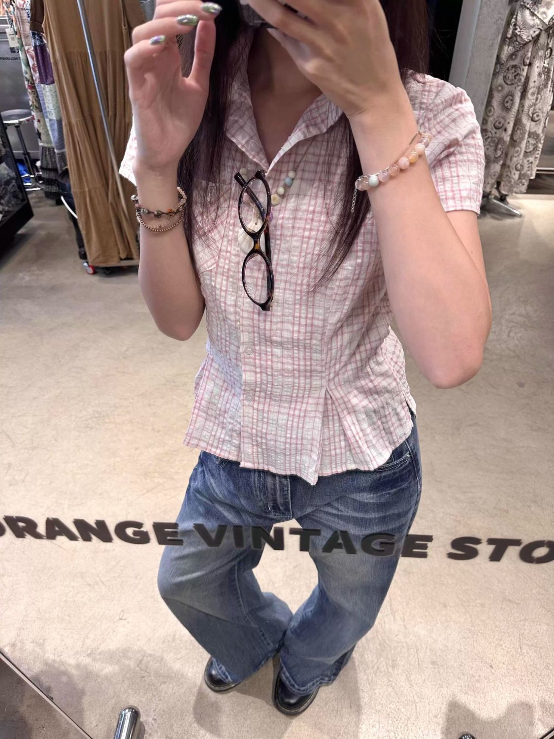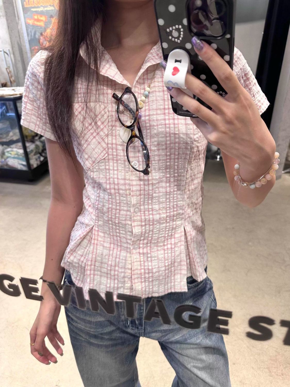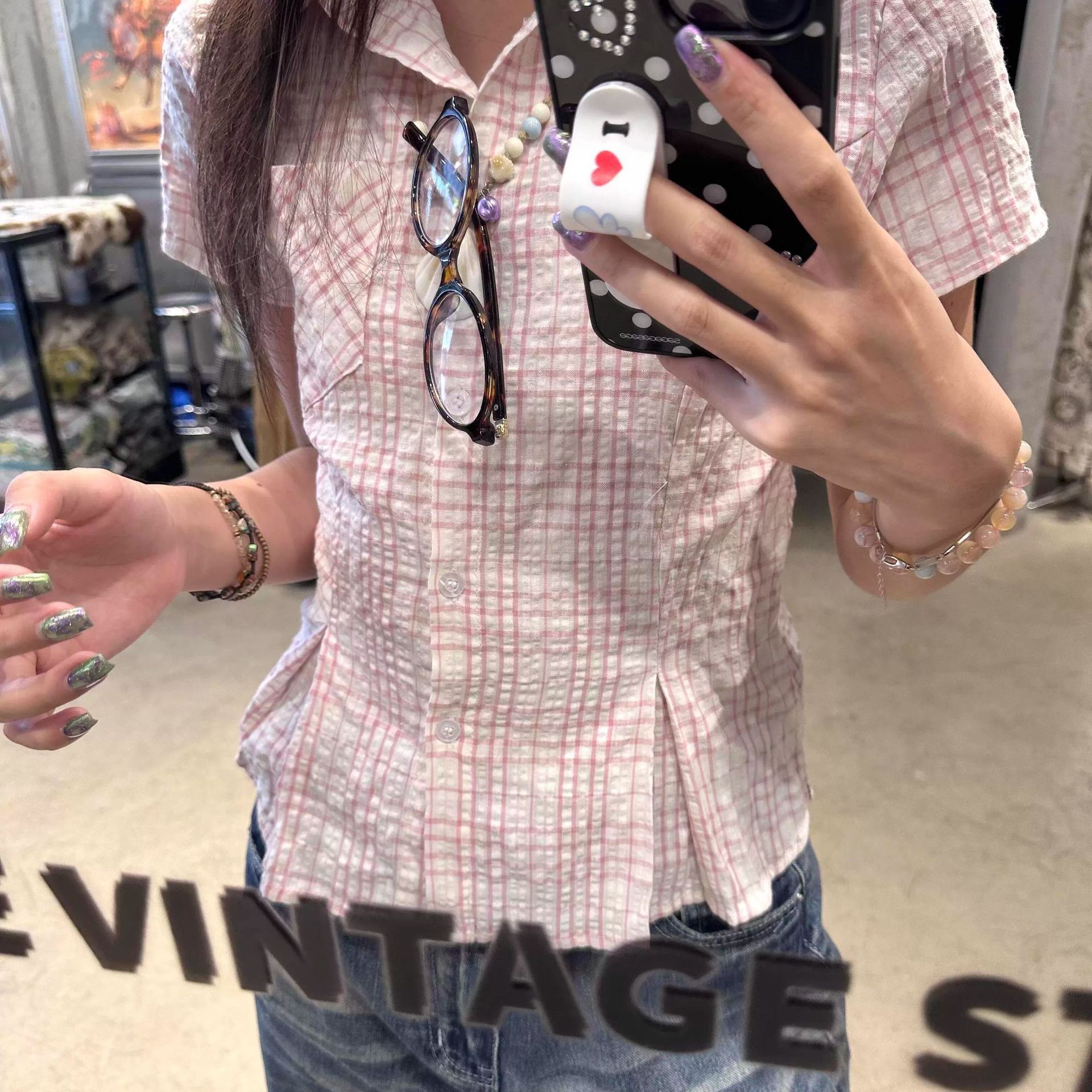 韓国ピンクチェック柄ショルダー半袖シャツ女性のための夏 2025 新しい甘いホットガールショートピンチウエストシャツトップ