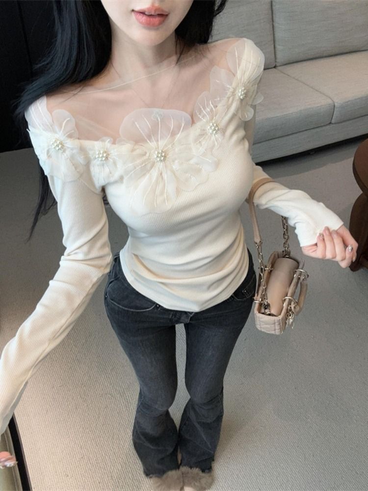 女性用の新しい長袖シャツ、美しい初秋のトップス、花柄のスリムフィット、立体的なボトムシャツ、ヨーロッパステーション