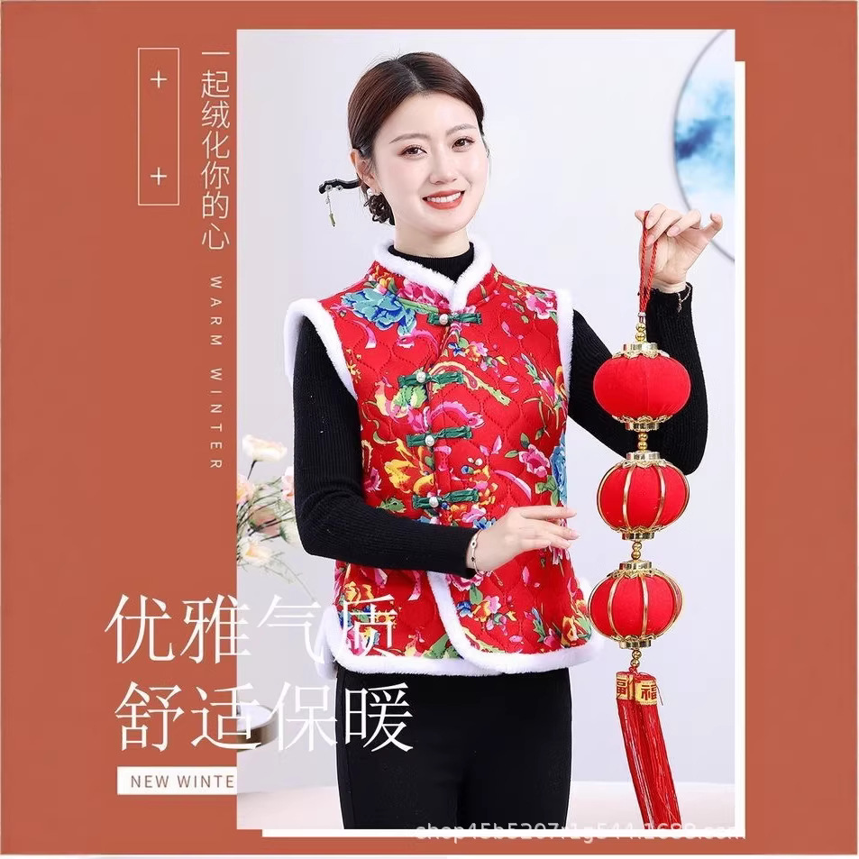 东北大花棉袄马甲民族复古坎肩女装妈妈盘扣加厚中国加绒保暖唐装