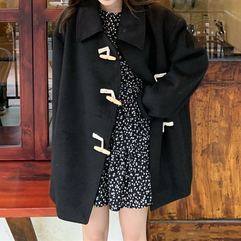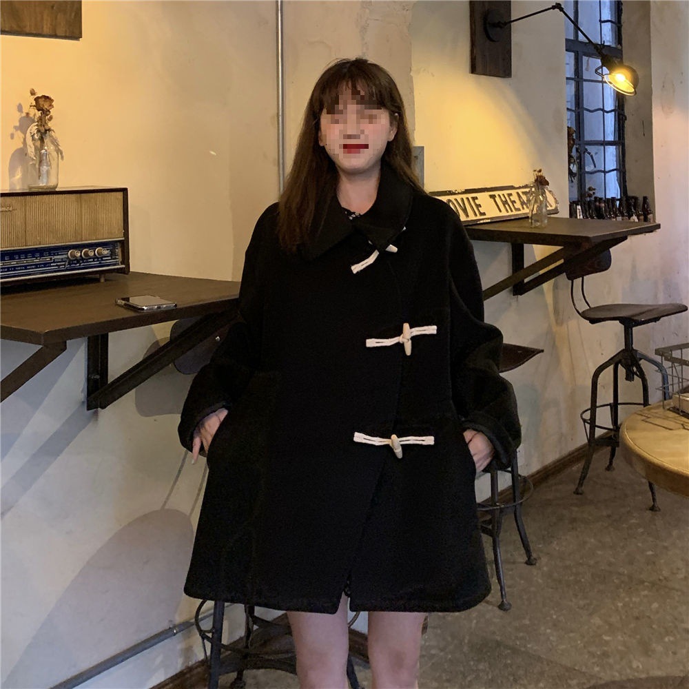 韓国風ルーズ秋冬ホーンボタンウールコートウールコートフェミニンミドル丈黒新スタイル小柄な人向け
