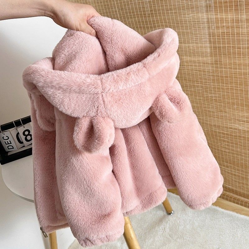 女童宝宝冬季连帽毛毛保暖外套仿皮草加绒加厚可爱儿童仿兔毛童装