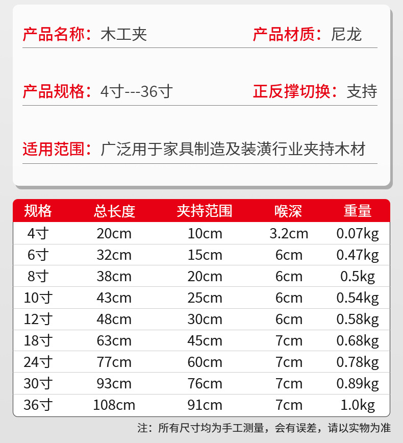 规格型号 4寸【夹持0-10cm】,6寸【夹持0-15cm】,8寸【夹持0-20cm】,10寸【夹持0-25cm】,12寸【夹持0-30cm】,18寸【夹持0-45cm】,24寸【夹持0-60cm】,30寸【夹持0-75cm】,36寸【夹持0-90cm】