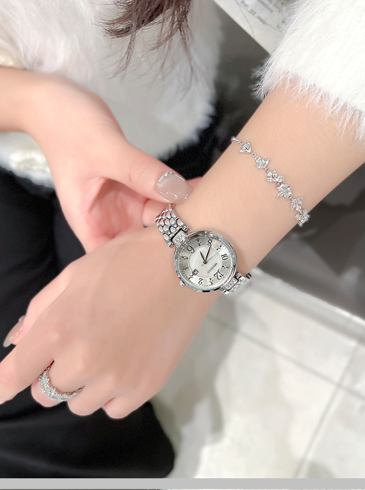 人魚マーシュの人気商品、ラウンド型ダイヤモンド付き腕時計、レディーススチールバンド腕時計、防水・防汗、クォーツ時計、一件代発送