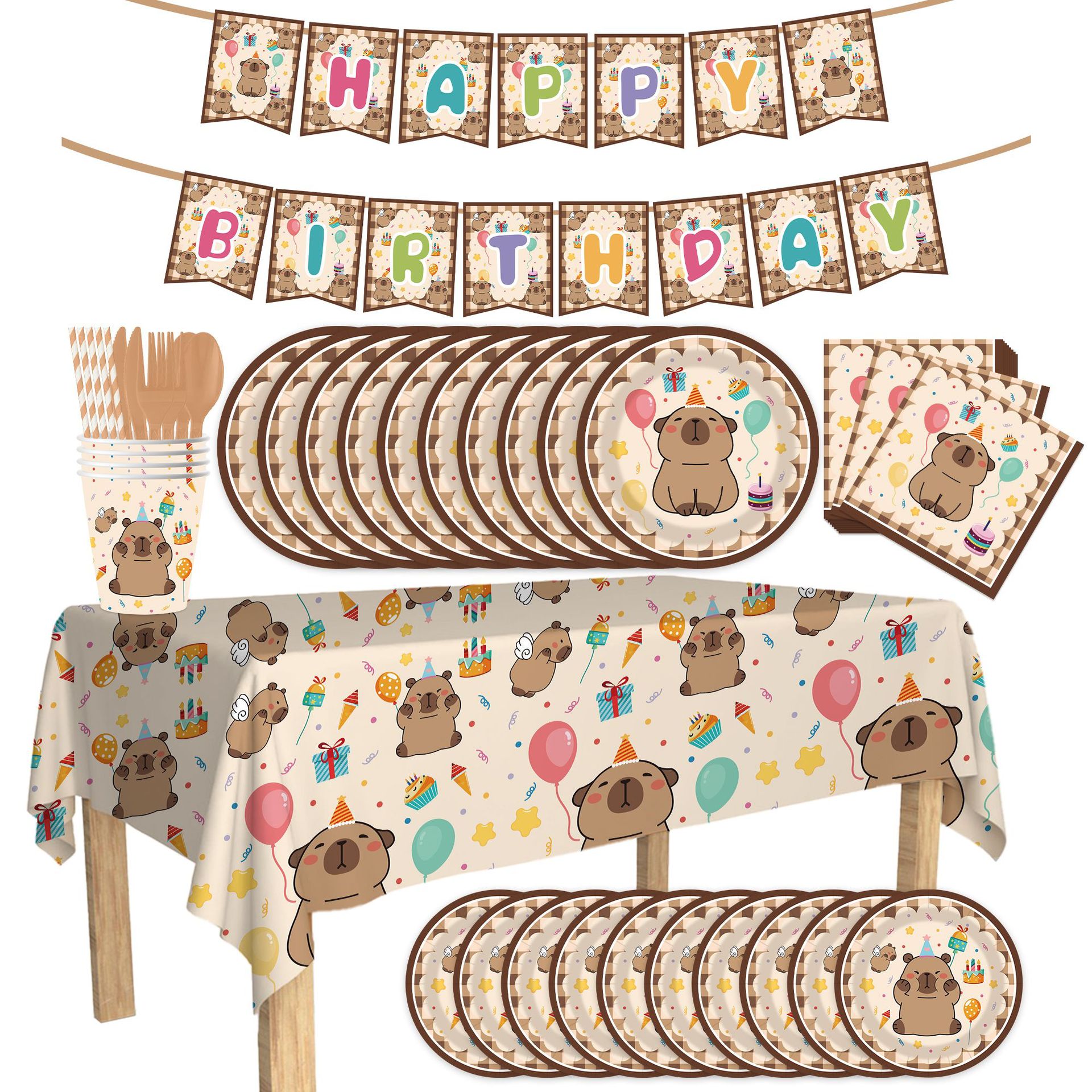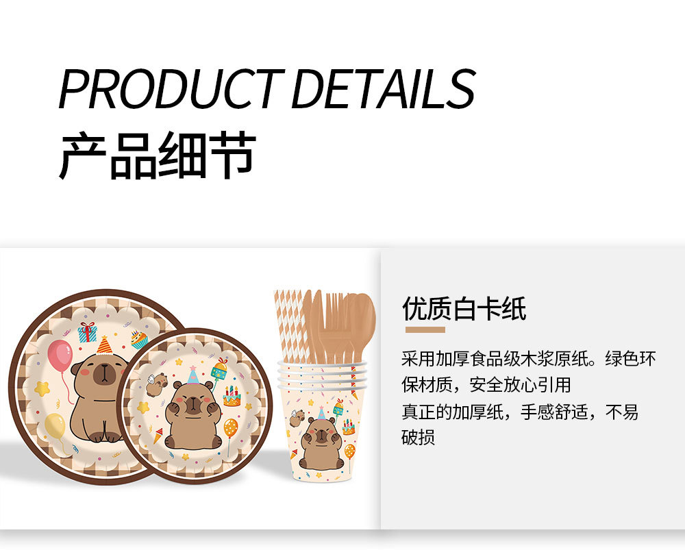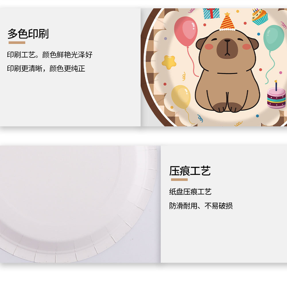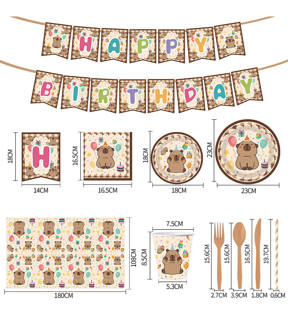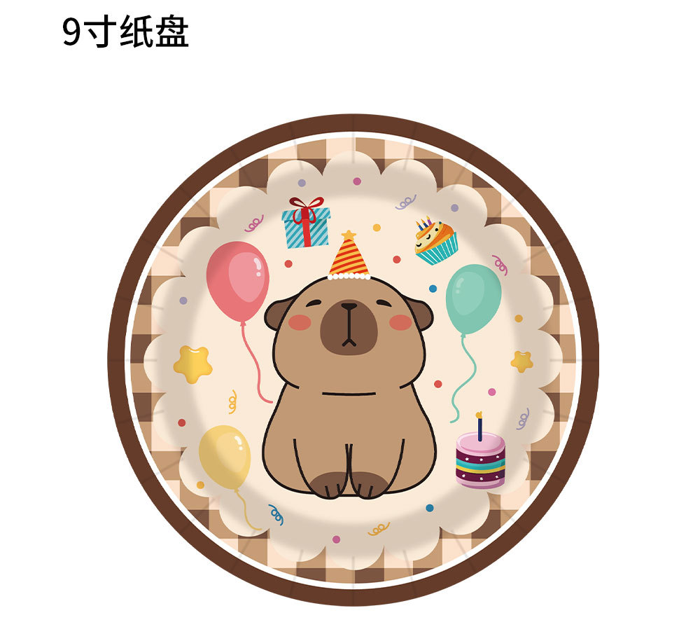 卡皮巴拉卡通主题生日派对餐具一次性纸盘纸杯纸巾布置桌布拉旗