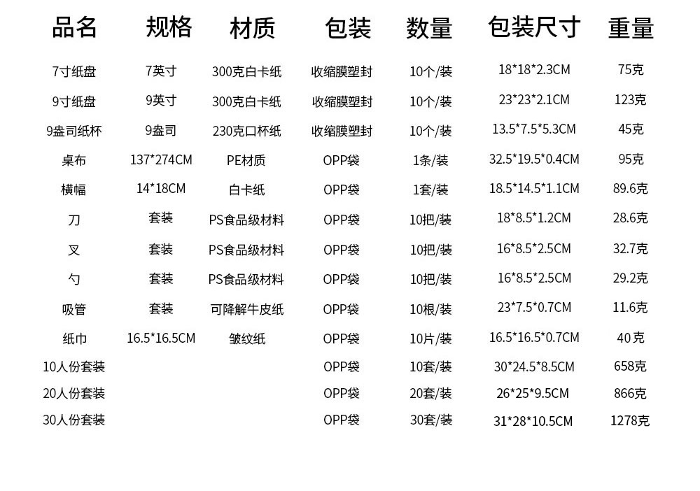颜色 7寸10个装纸盘,9寸10个装纸盘,10个装纸杯,10根装吸管,20张装纸巾,10个装叉,10个装刀,10个装勺,10人份10件套,20人份10件套,30人份10件套,桌布1条,拉旗1条