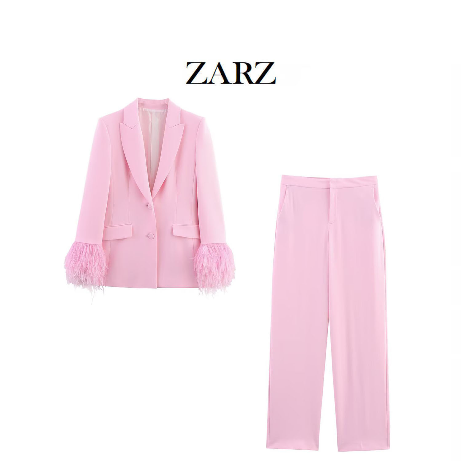 ZARZ 自制 欧美风 新款女装羽毛袖口西装外套飘逸直筒长裤3421324