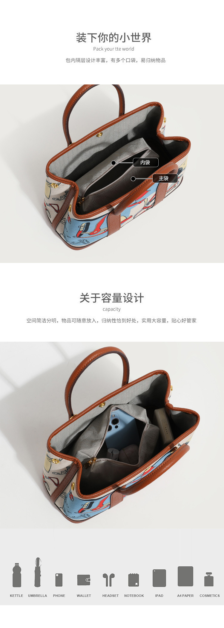 包内部结构 拉链暗袋,手机袋,证件袋