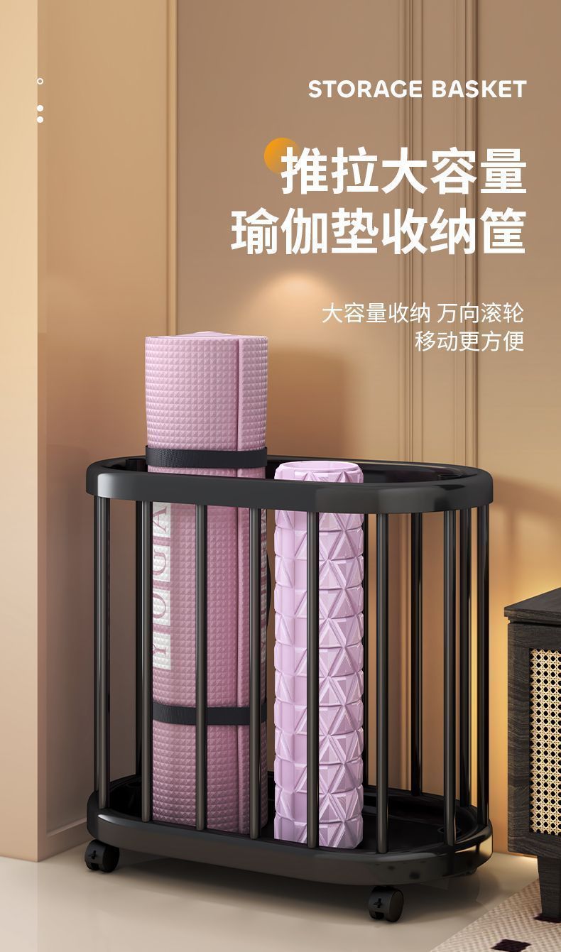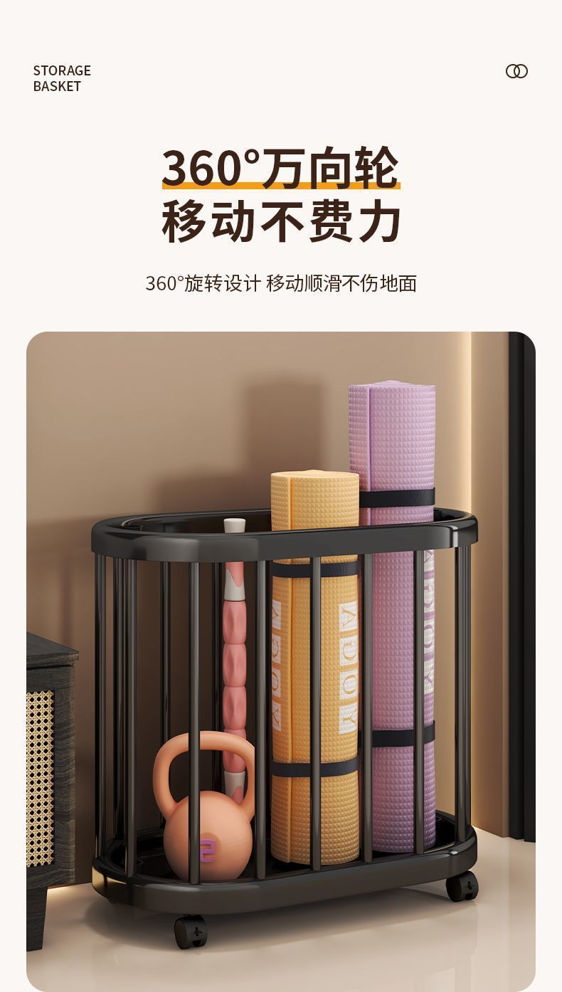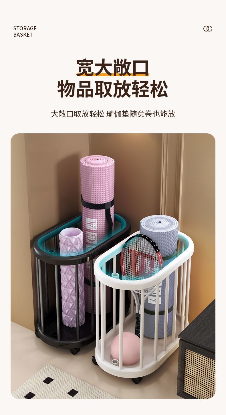 ヨガマット、フィットネス機器収納バスケット、収納ラック、汚れた衣類バスケット、移動式車輪付き汚れた衣類バスケット