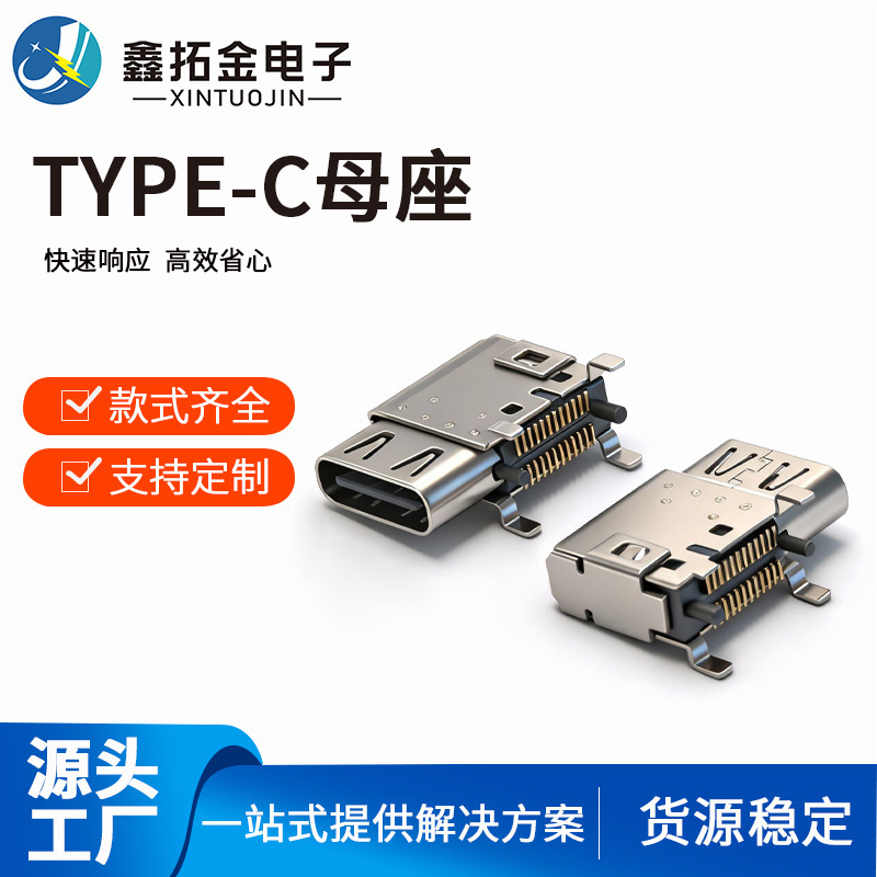USB3.1满pin TYPE-C侧立式母座24P 侧贴四脚插件双排SMT