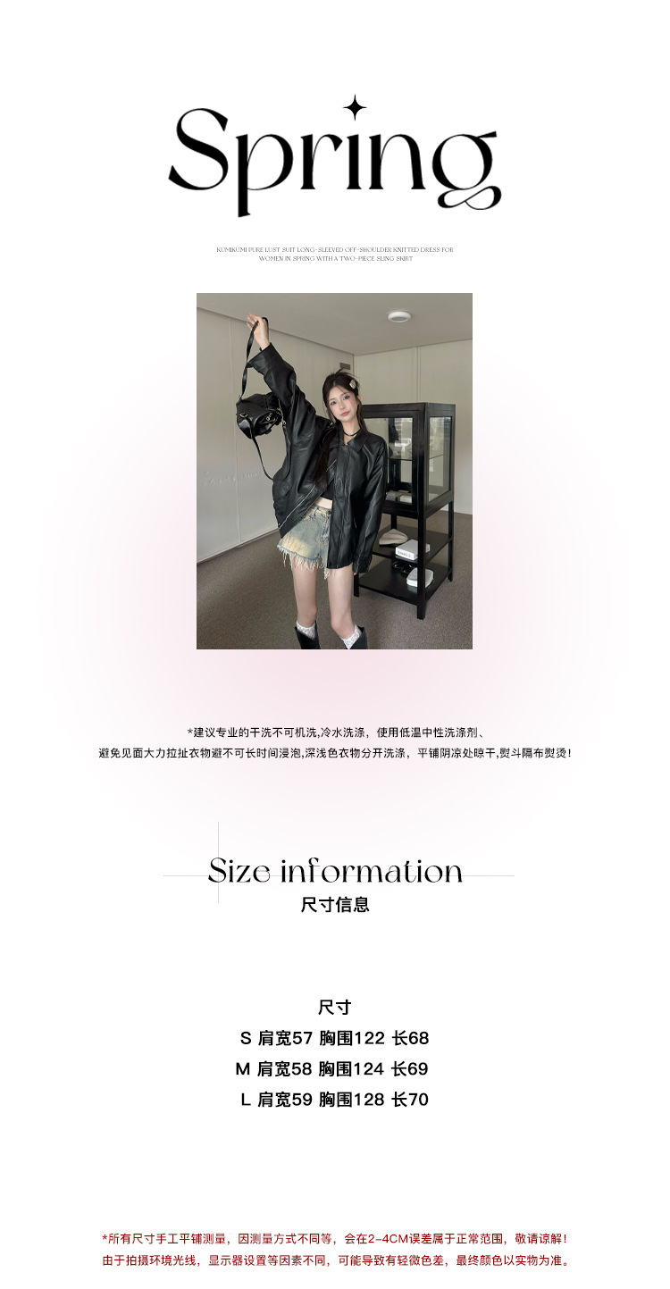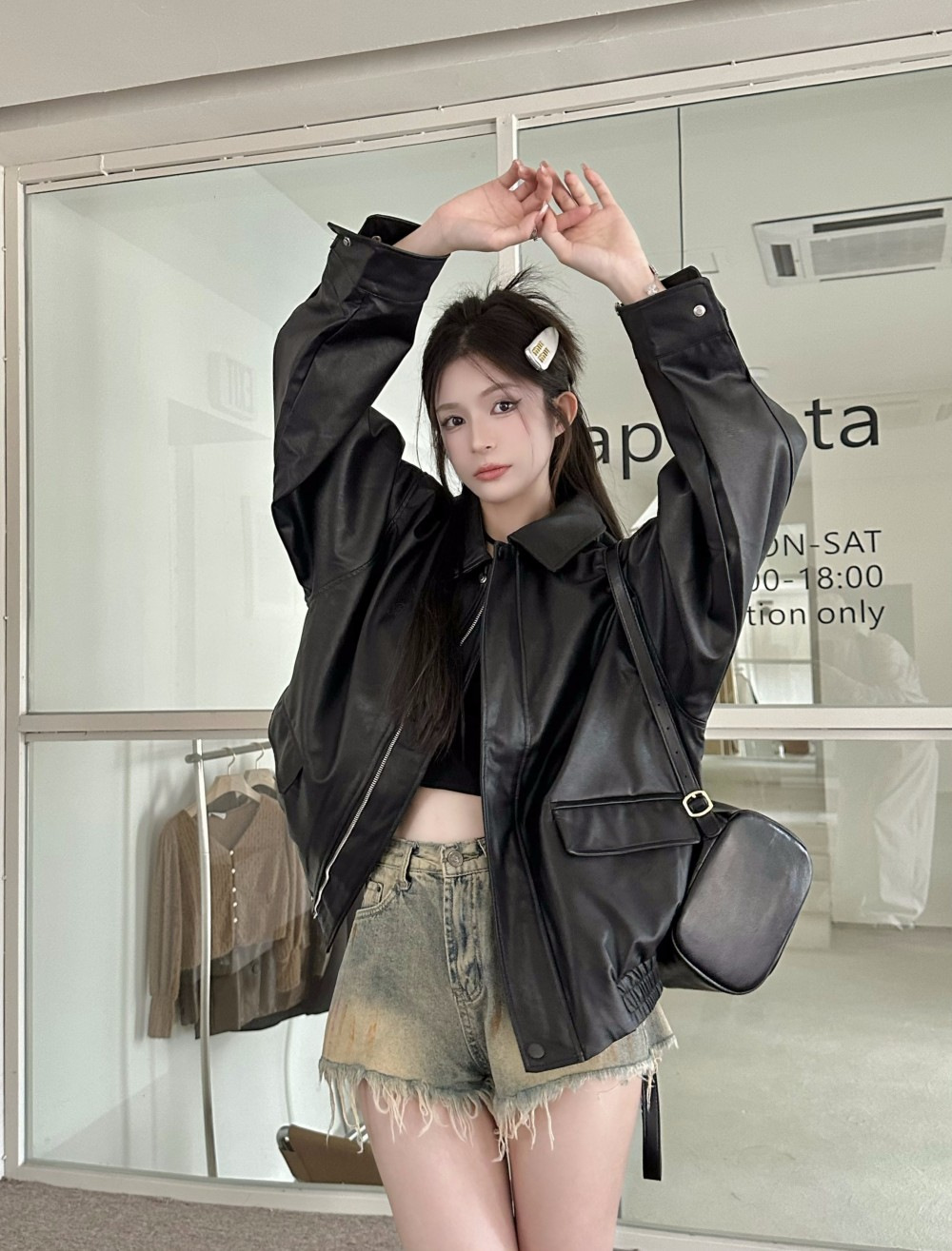 复古美式咖色皮衣夹克外套女夏季黑色甜酷风机车PU皮宽松长袖上衣