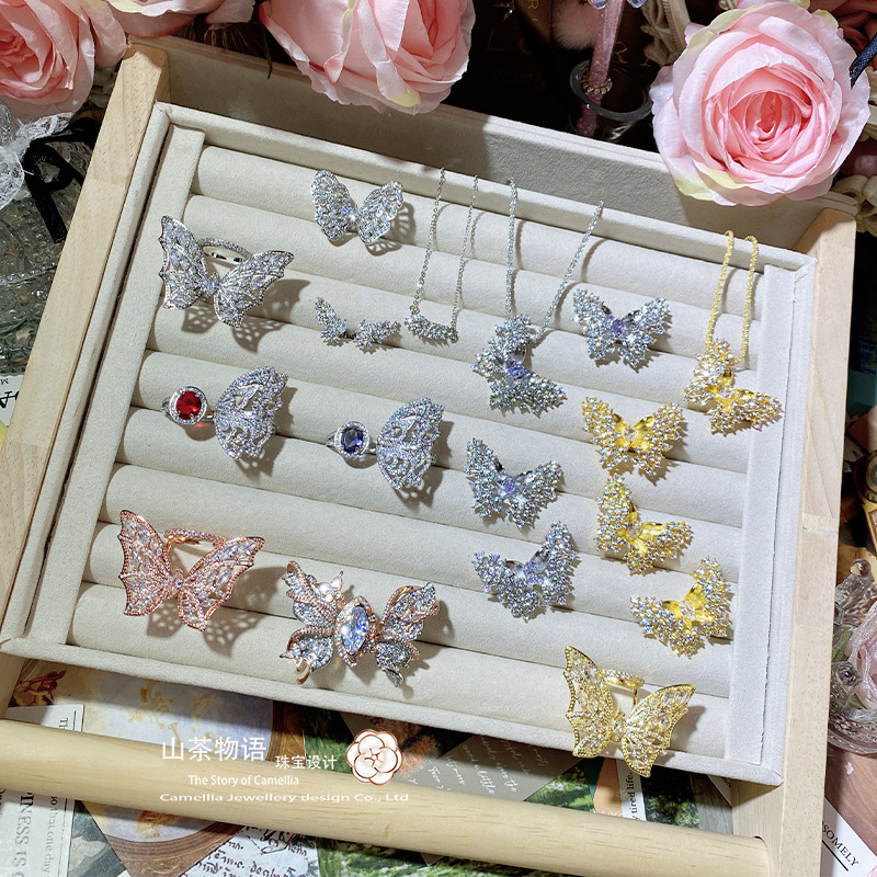 山茶新款鎏金蝴蝶满天星锆石戒指 镀18K金超闪不规则满钻翅膀套装