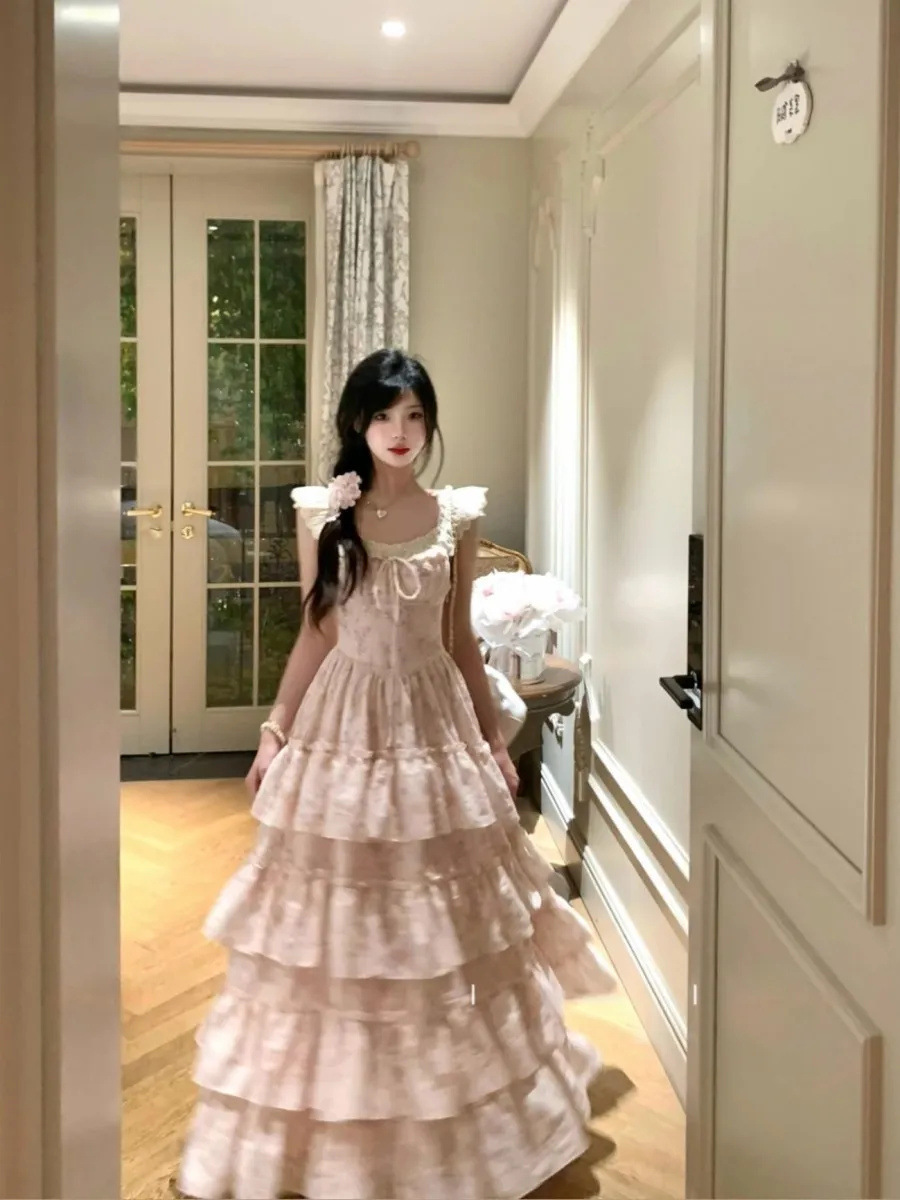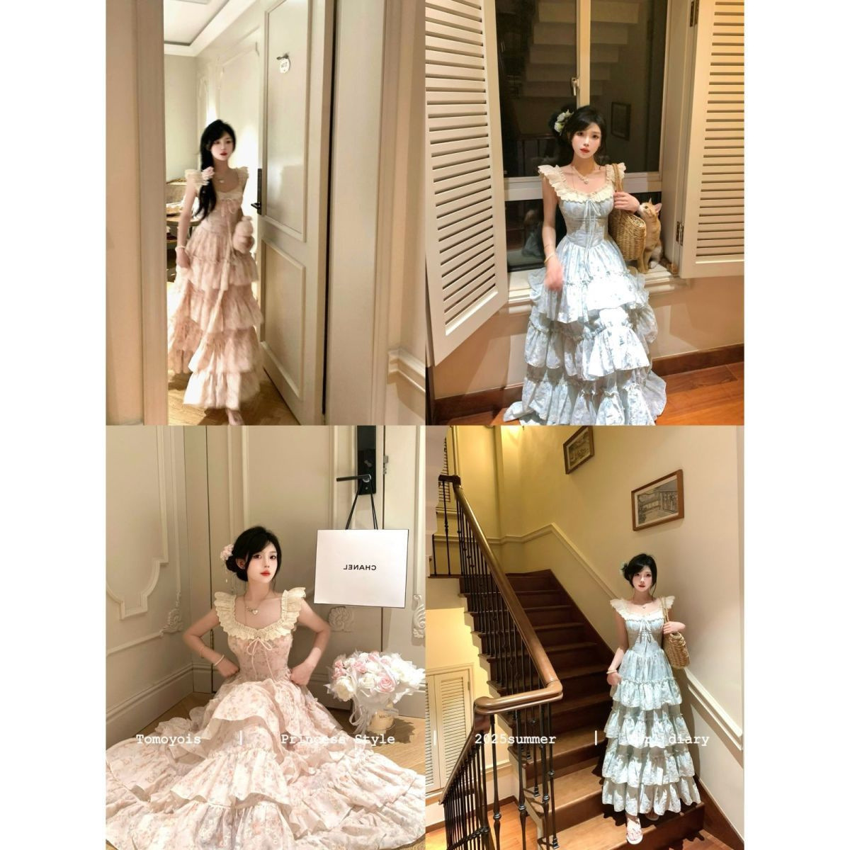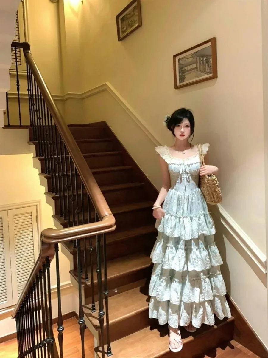 ティーブレイク逃走プリンセスロングドレス女性のための 2025 サマーガーデンライトダンスホリデースタイルウエスト痩身ケーキ大振りドレス