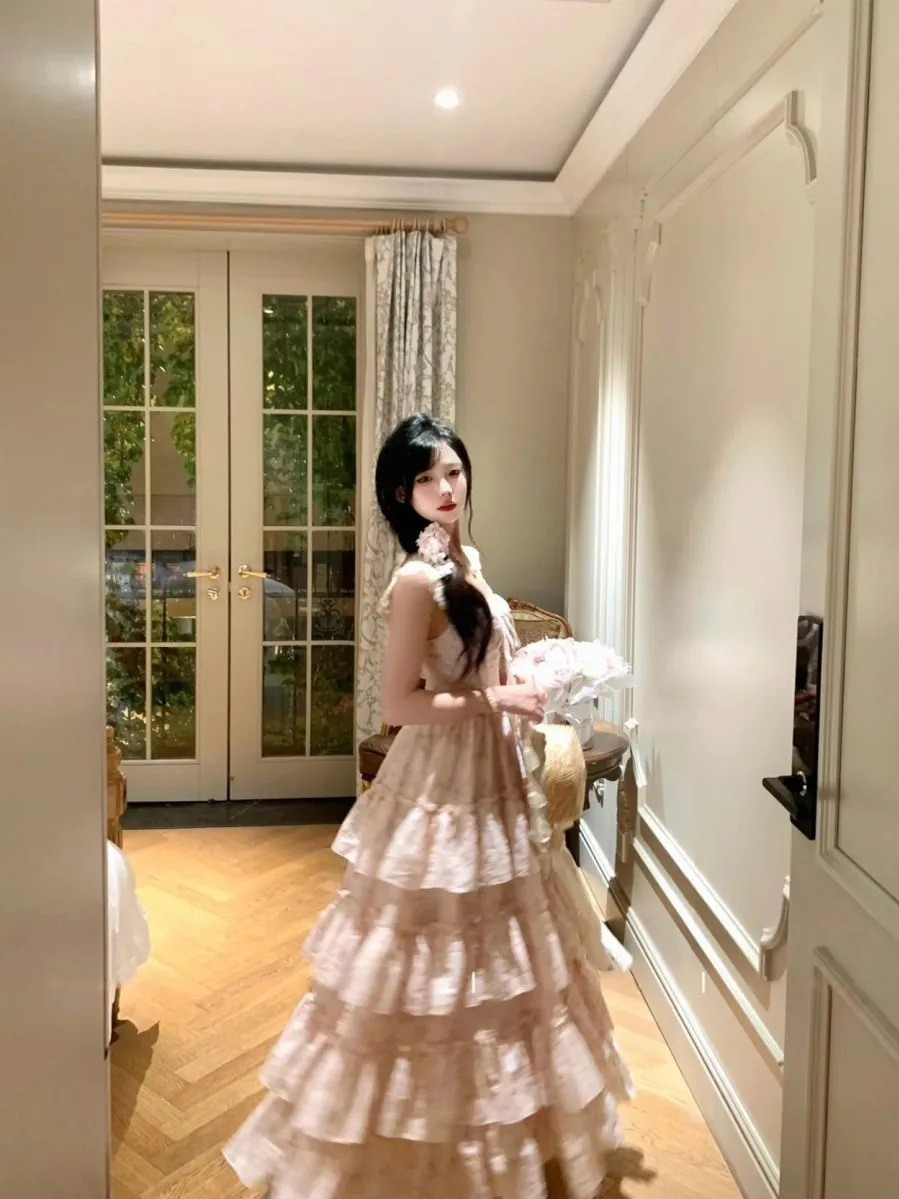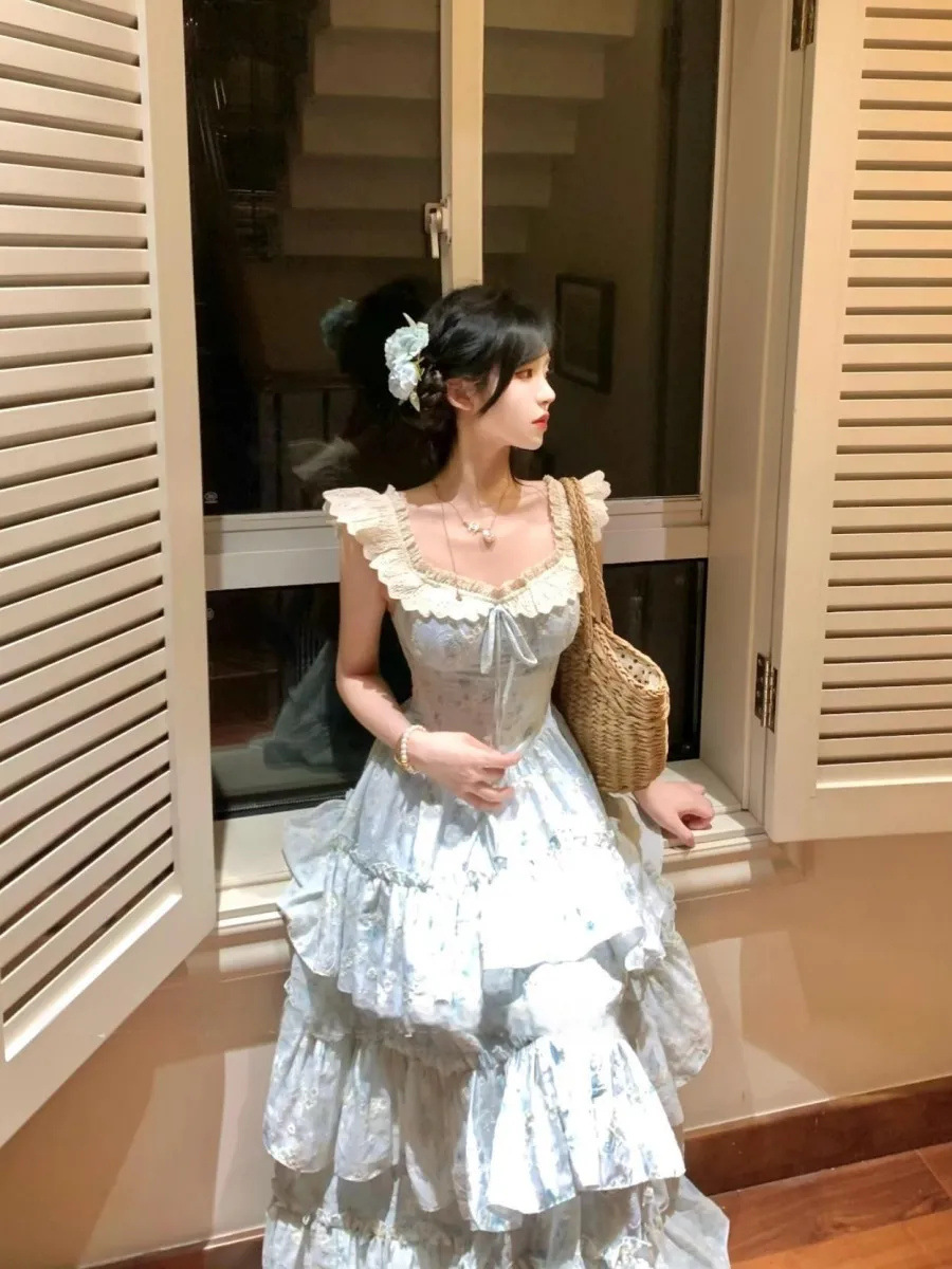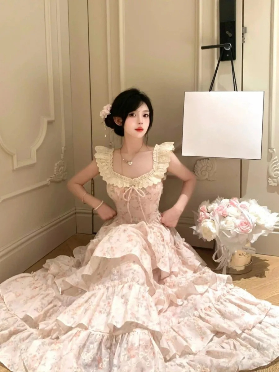 ティーブレイク逃走プリンセスロングドレス女性のための 2025 サマーガーデンライトダンスホリデースタイルウエスト痩身ケーキ大振りドレス
